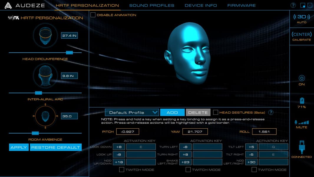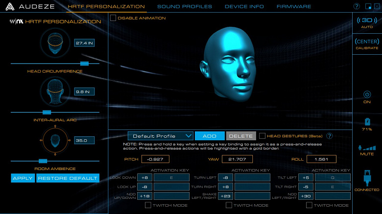 В наушниках используется трехосевой акселерометр и гироскоп, позволяющий динамически отслеживать положение головы пользователя в пространстве. Эти параметры учитываются при создании объемной звуковой картины и при изменениях положения головы компенсируют движения, позволяя виртуальному миру оставаться на месте. Эффект довольно неожиданный и очень интересный. Мы уверены, любителям шутеров от первого лица он придется по вкусу, так как даже при поворотах головы на 90 градусов позволяет с высокой точностью локализовать источники звука. Любопытно, что можно указать точные размеры окружности головы и затылка в дюймах (для более достоверных вычислений), а также количество подмешиваемой реверберации.