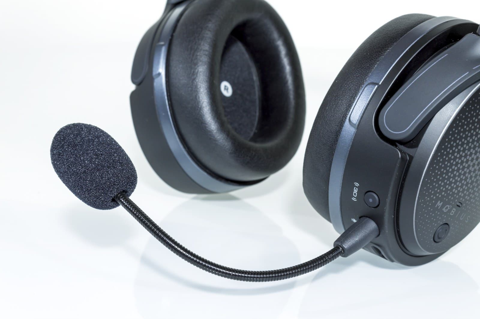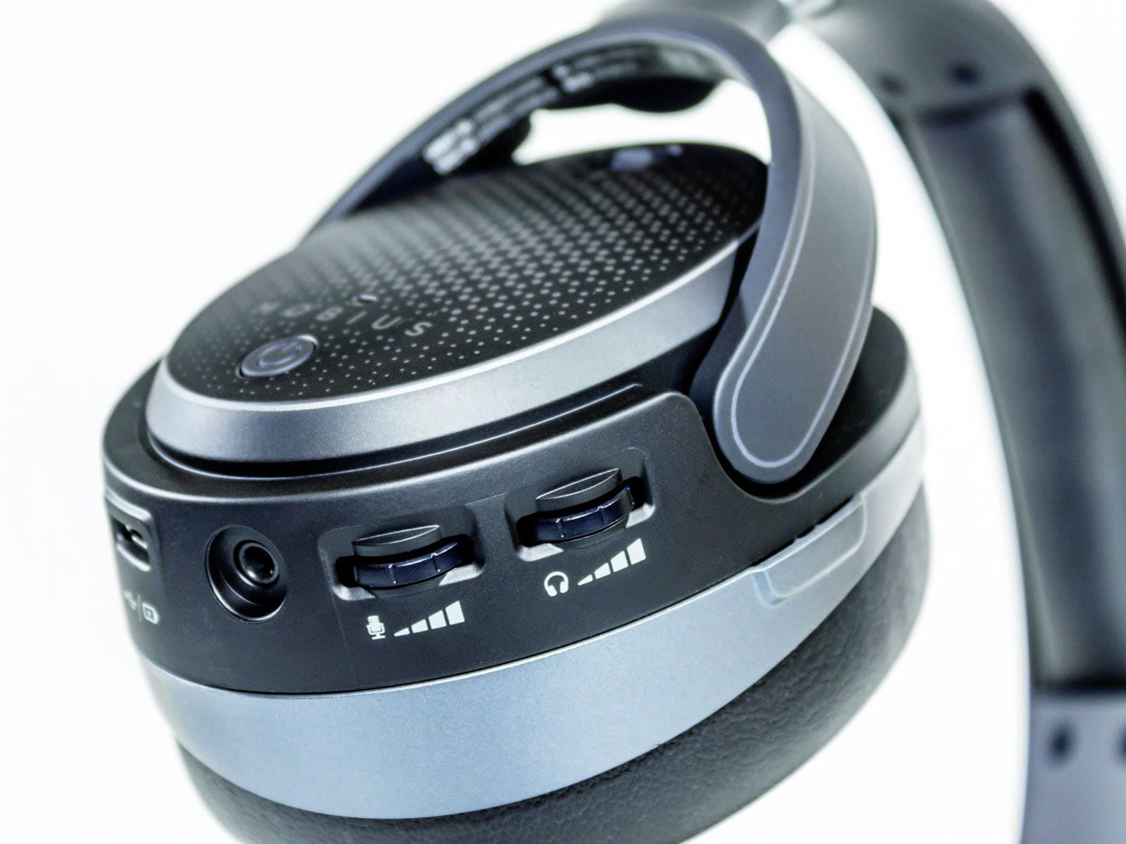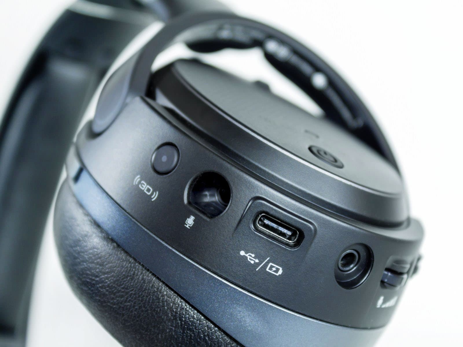 С левой стороны расположены следующие элементы: разъем USB Type-C для зарядки встроенного аккумулятора и работы с компьютером, разъем для подключения микрофона и кнопка, активирующая функцию 3D. В наушниках используется литий-полимерный аккумулятор, способный проработать до 10 часов с включенным 3D-режимом. Время полной зарядки выключенных наушников с помощью 1-амперного зарядного устройства составит около 3 часов. При использовании наушников в качестве USB-устройства аккумулятор будет подзаряжаться.