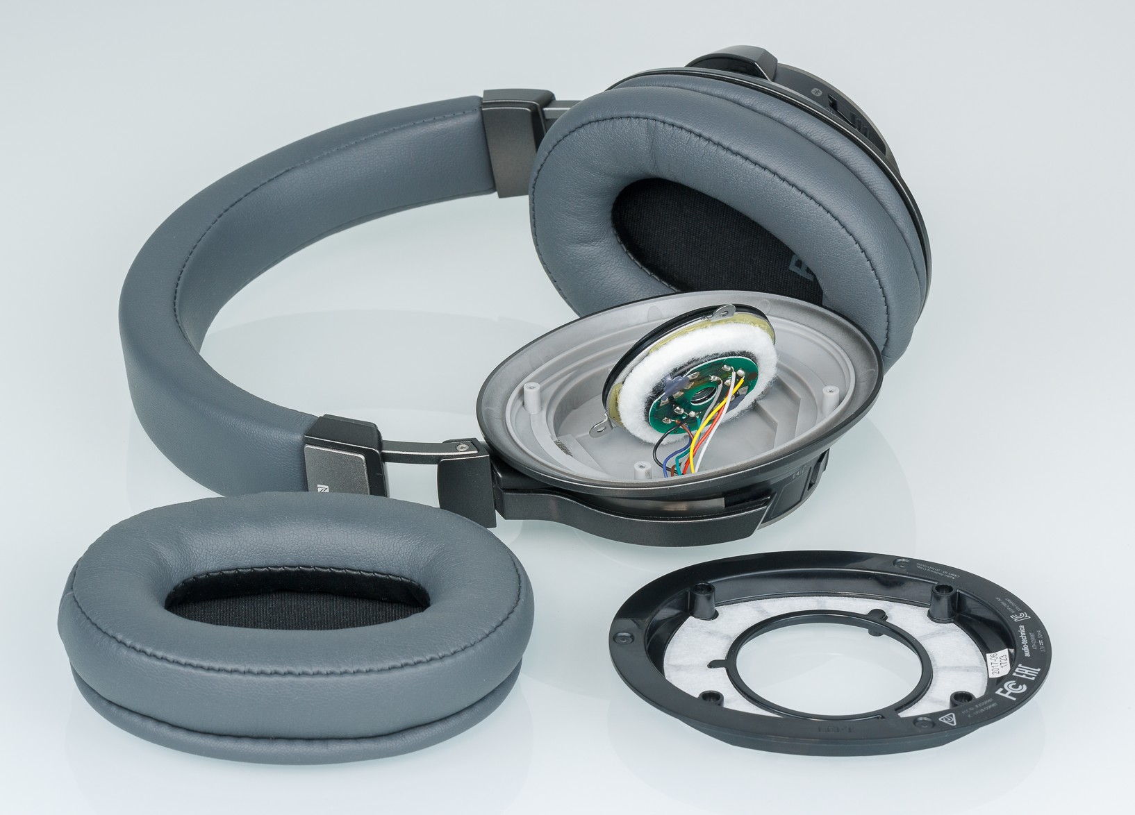 Мы разобрали наушники, чтобы посмотреть внутренности. Действительно, внутри стоят 45-миллиметровые излучатели, к каждому из которых подведено 8 проводов для подключения 4 катушек к отдельным усилителям. Цифровая часть полностью отделена от камеры излучателя. Видно акустическое демпфирование низких частот специальными материалами.