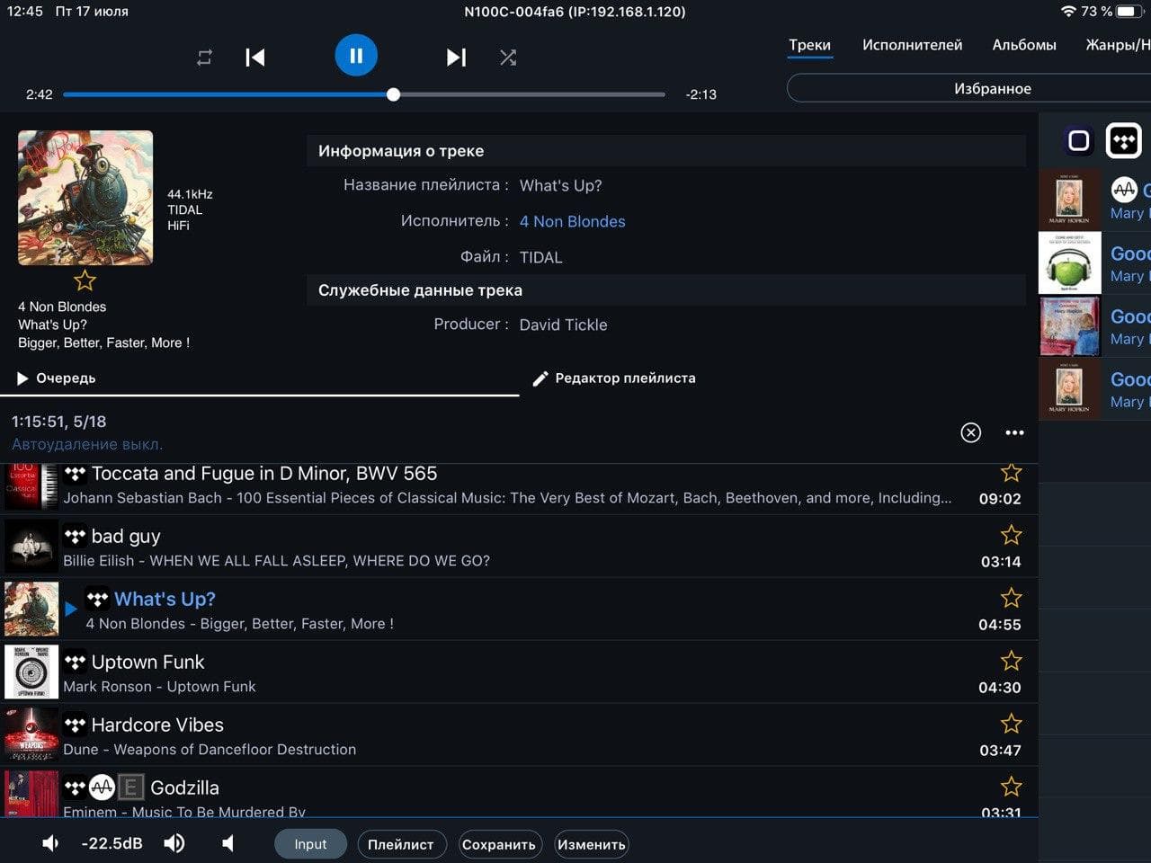 При подключении связки из Aurender X725 с Aurender N100C в нижнем левом углу приложения появляется регулятор громкости.