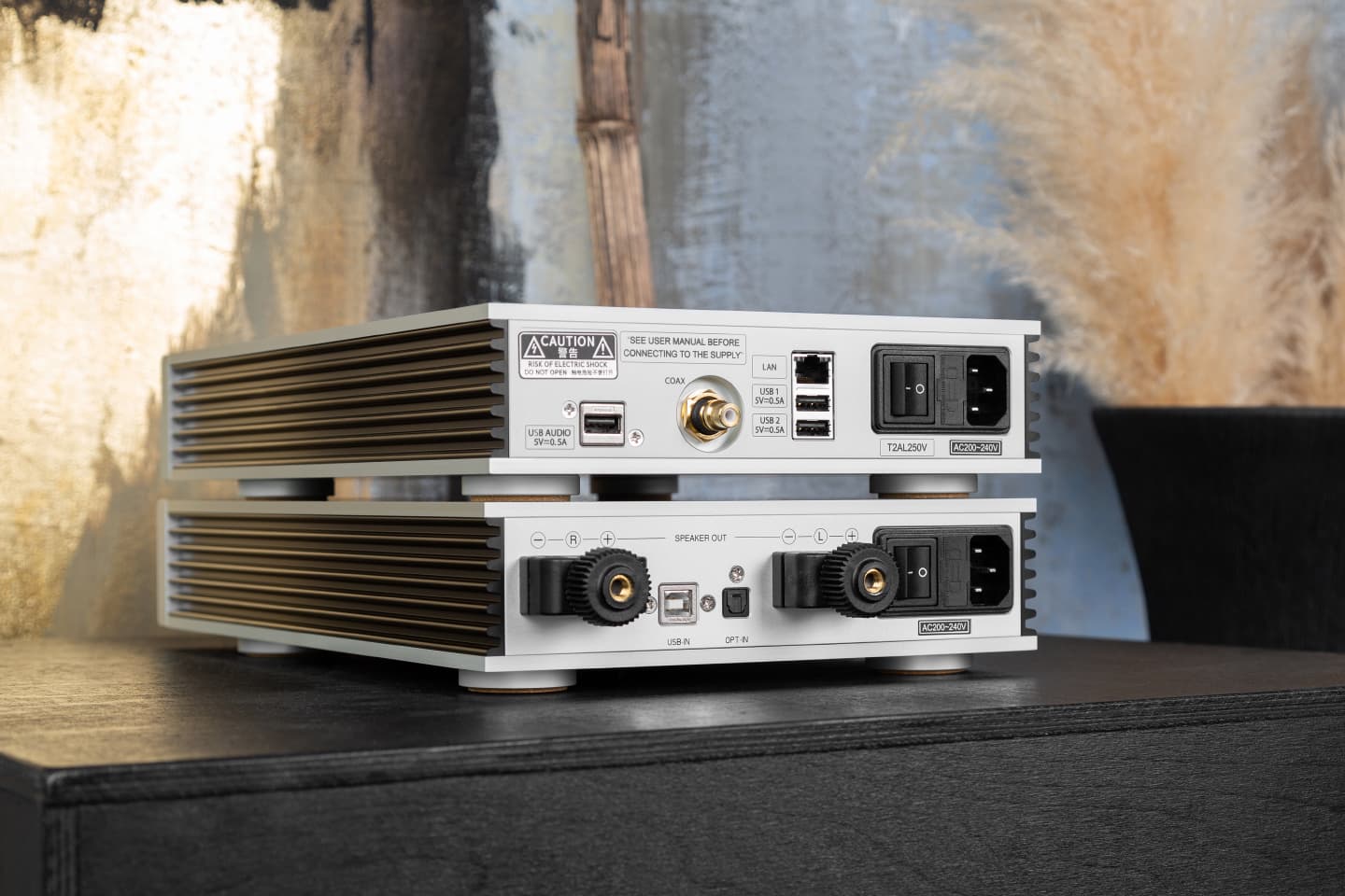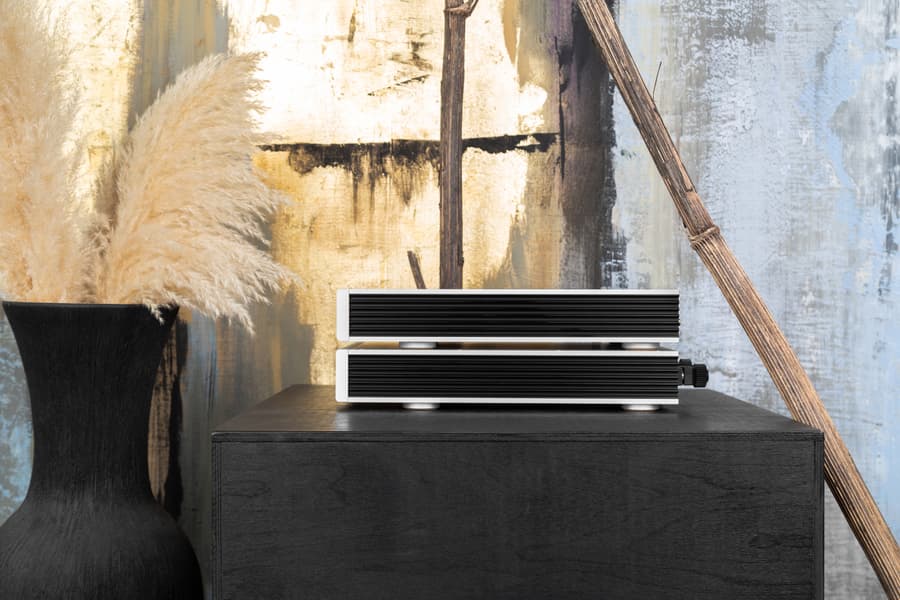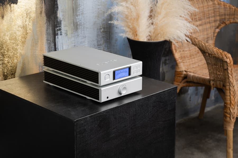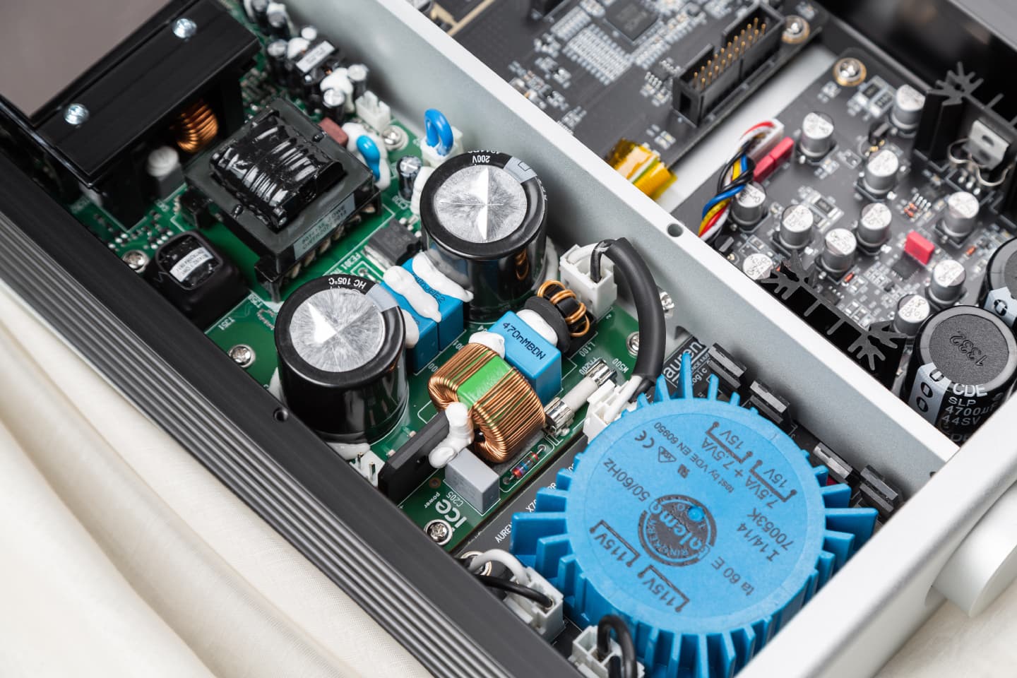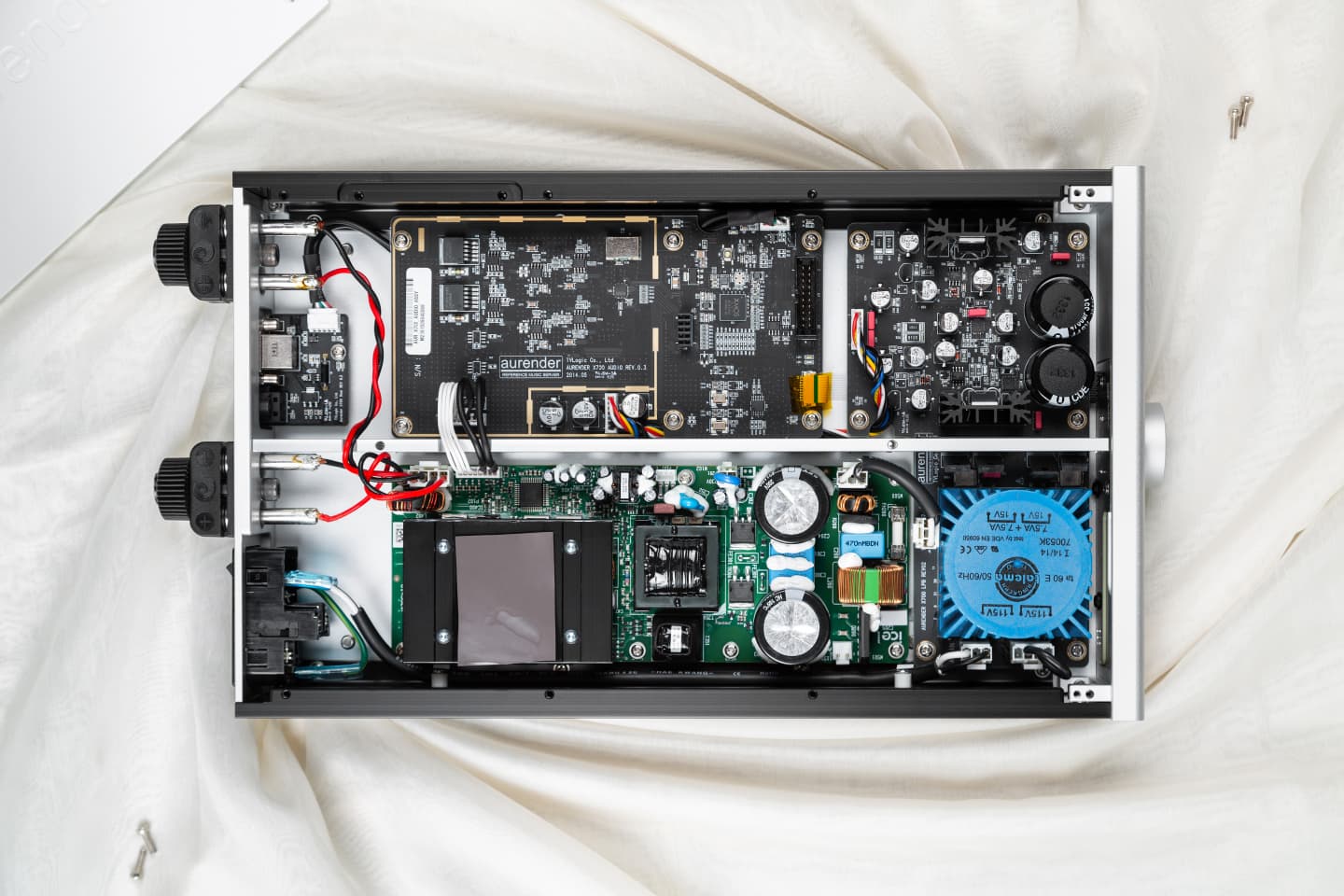 Плата, отвечающая за обработку аудиосигнала, отделена от блока усилителя алюминиевой перегородкой. Линейная система питания с тороидальным трансформатором Talema находится в передней части корпуса.