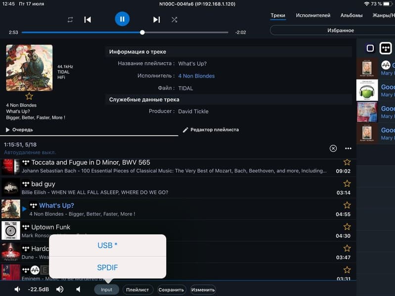 Как уже было сказано выше, разъема для подключения у устройства всего два: USB Type В и оптический SPDIF. С помощью последнего можно, например, соединить Aurender X725 с CD-транспортом. Но основной вариант подключения — естественно, с помощью USB. Можно использовать уже не раз упомянутый сетевой плеер, а можно — ПК или ноутбук. Все будет работать, однако управление по сети с помощью приложения Aurender App окажется недоступным. А оно, надо сказать, весьма удобное — подробный его разбор есть в тестировании плеера Aurender N100C.