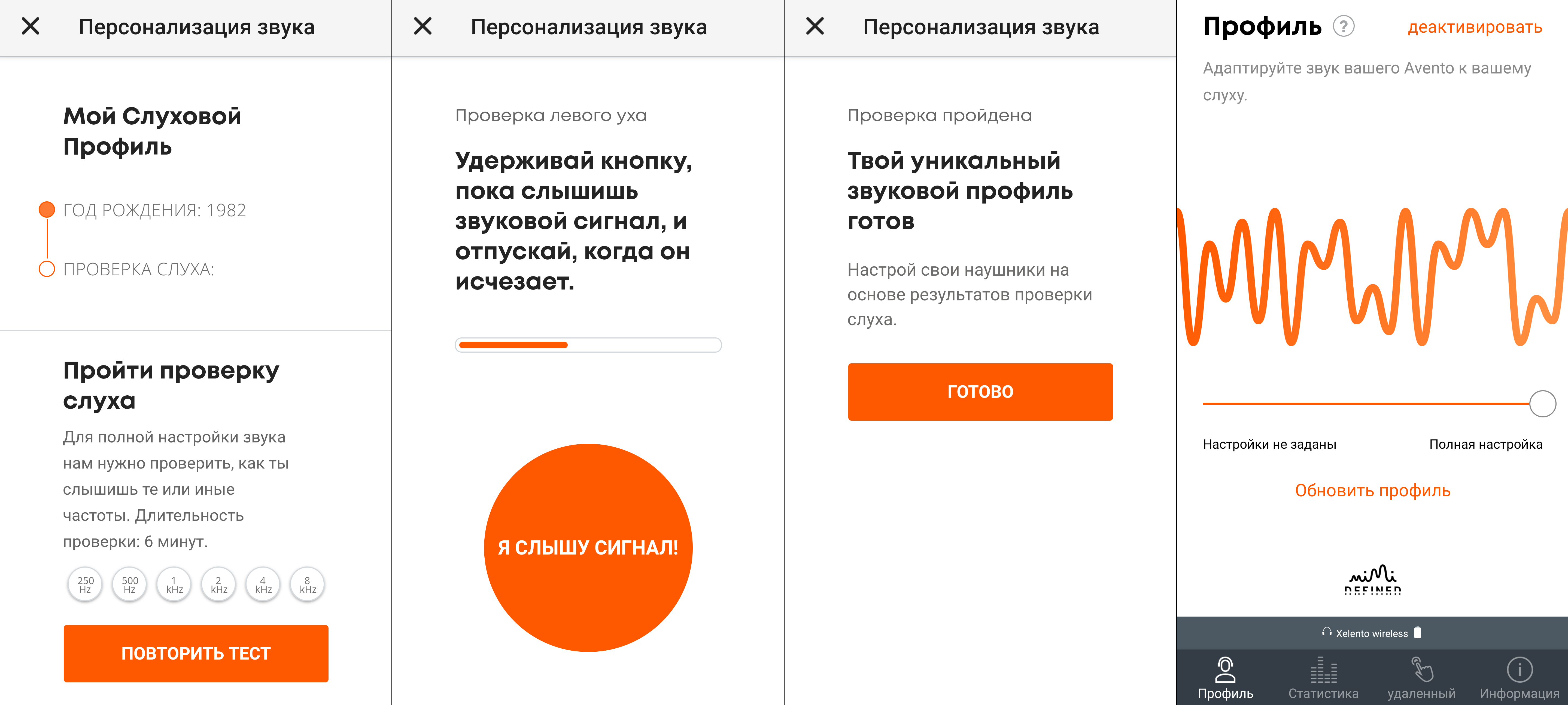 Далее можно продолжить проверку слуха и создать индивидуальный профиль. Для этого нужно надеть гарнитуру, после чего удерживать кнопку на экране в то время, пока вам удается услышать воспроизводимые программой звуки различной частоты и громкости. После того, как профиль сохранен, можно плавно регулировать степень обработки звука с его помощью. О звучании гарнитуры мы еще поговорим подробно, пока же скажем, что изменения при подключении профиля заметны и делают звук несколько более комфортным.