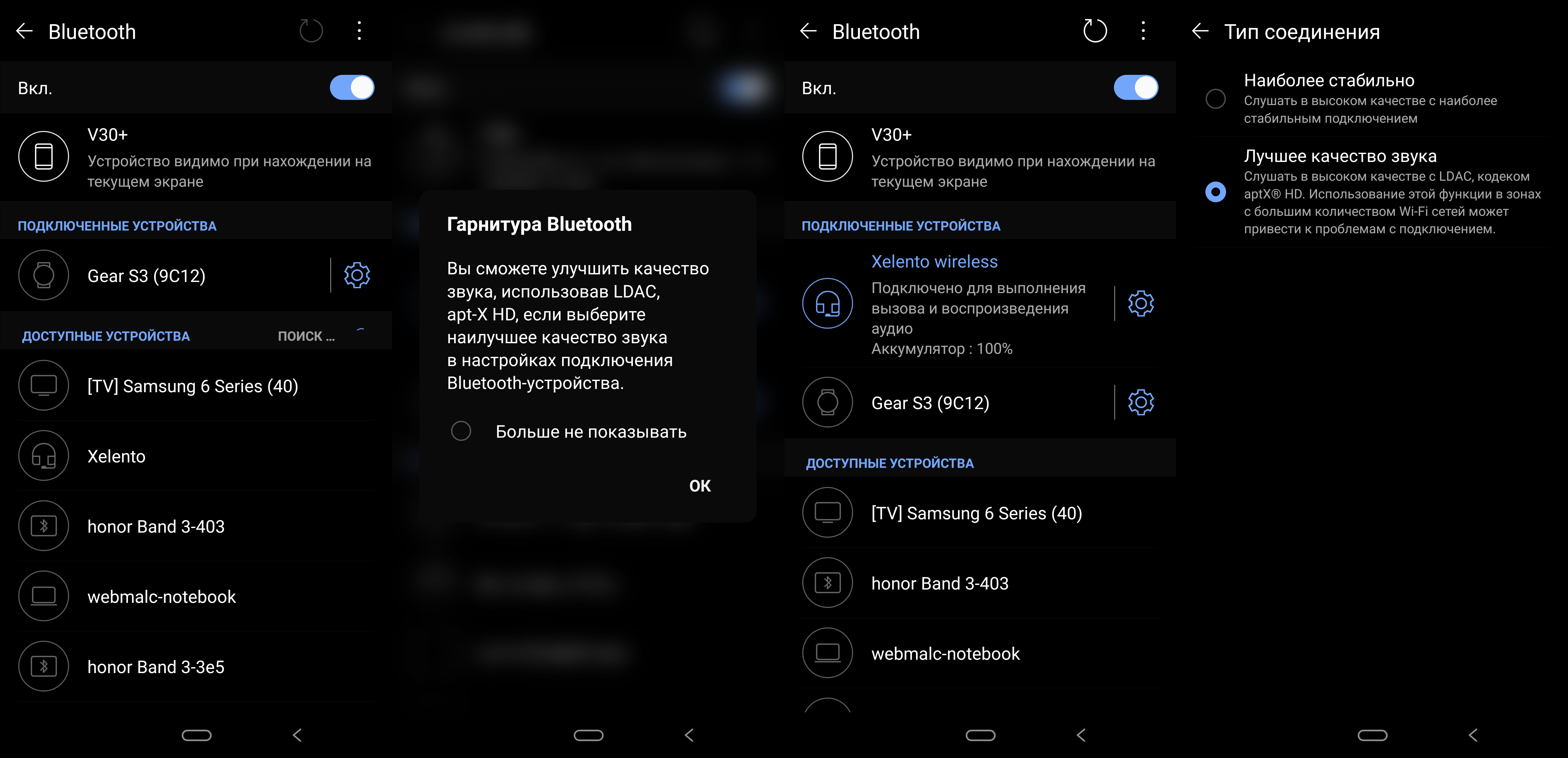 Находим гарнитуру в соответствующем меню гаджета — подключаемся. И вот тут есть один забавный нюанс. Часть устройств под управлением Android по умолчанию использует кодек AptX для передачи звука, так как он обеспечивает более стабильную работу. Причем происходить это может как с появлением соответствующего уведомления, так и без него. Потому всегда есть смысл перейти в свойства подключения и проверить, что кодек AptX HD активирован. О том, какой кодек используется, а также о прочих событиях Beyerdynamic Xelento Wireless извещает голосовыми сообщениями на английском языке.