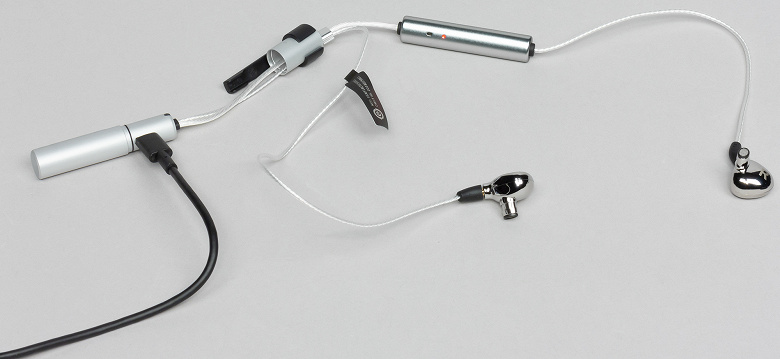 Конструкция Bluetooth-модуля весьма оригинальна и напоминает ювелирную подвеску, что приводит к довольно нестандартному способу крепления и ношения гарнитуры, но об этом мы отдельно поговорим чуть ниже. Состоит он из нескольких частей: коннекторов для наушников, основного блока с приемопередатчиком и пульта управления со встроенным микрофоном. Провода с серебряным напылением покрыты слоем прозрачного изоляционного материала, а потому выглядят ничуть не менее интересно, чем другие части гарнитуры.