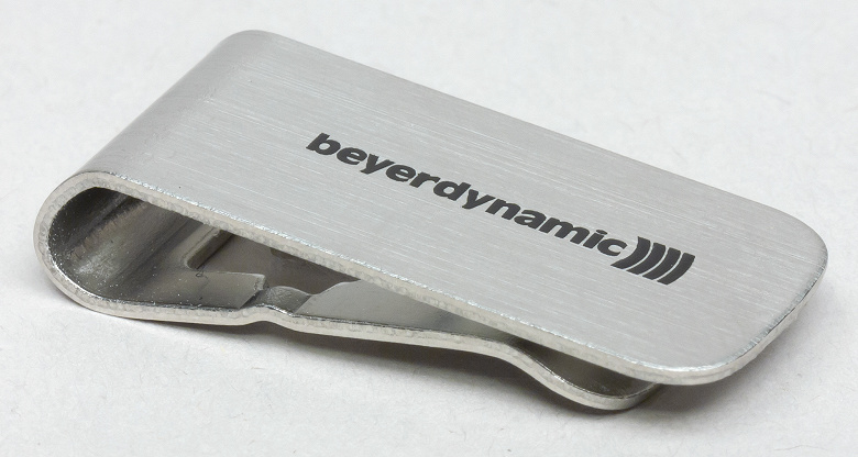Для крепления провода к одежде в комплекте есть специальный металлический зажим с логотипом производителя.