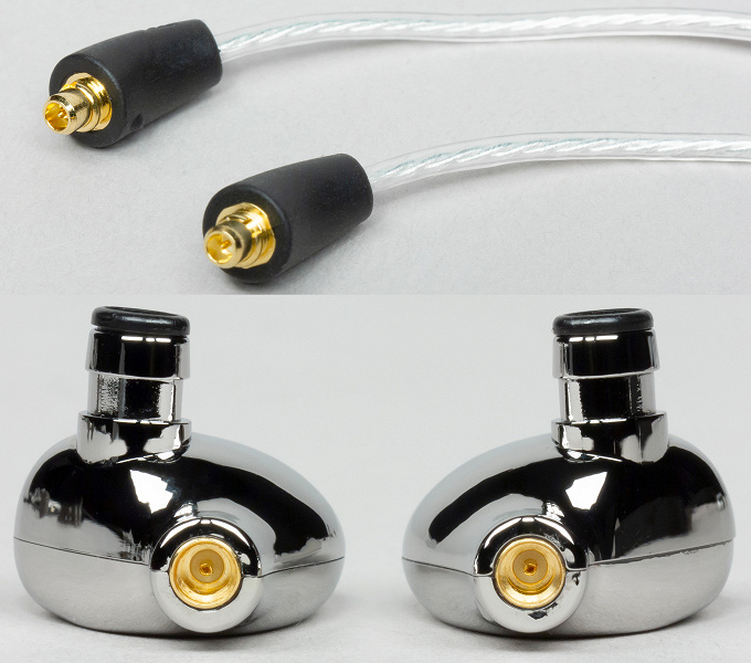 Наушники подключаются к кабелю или Bluetooth-модулю с помощью MMCX-коннекторов. Позолоченных, естественно — куда без этого.