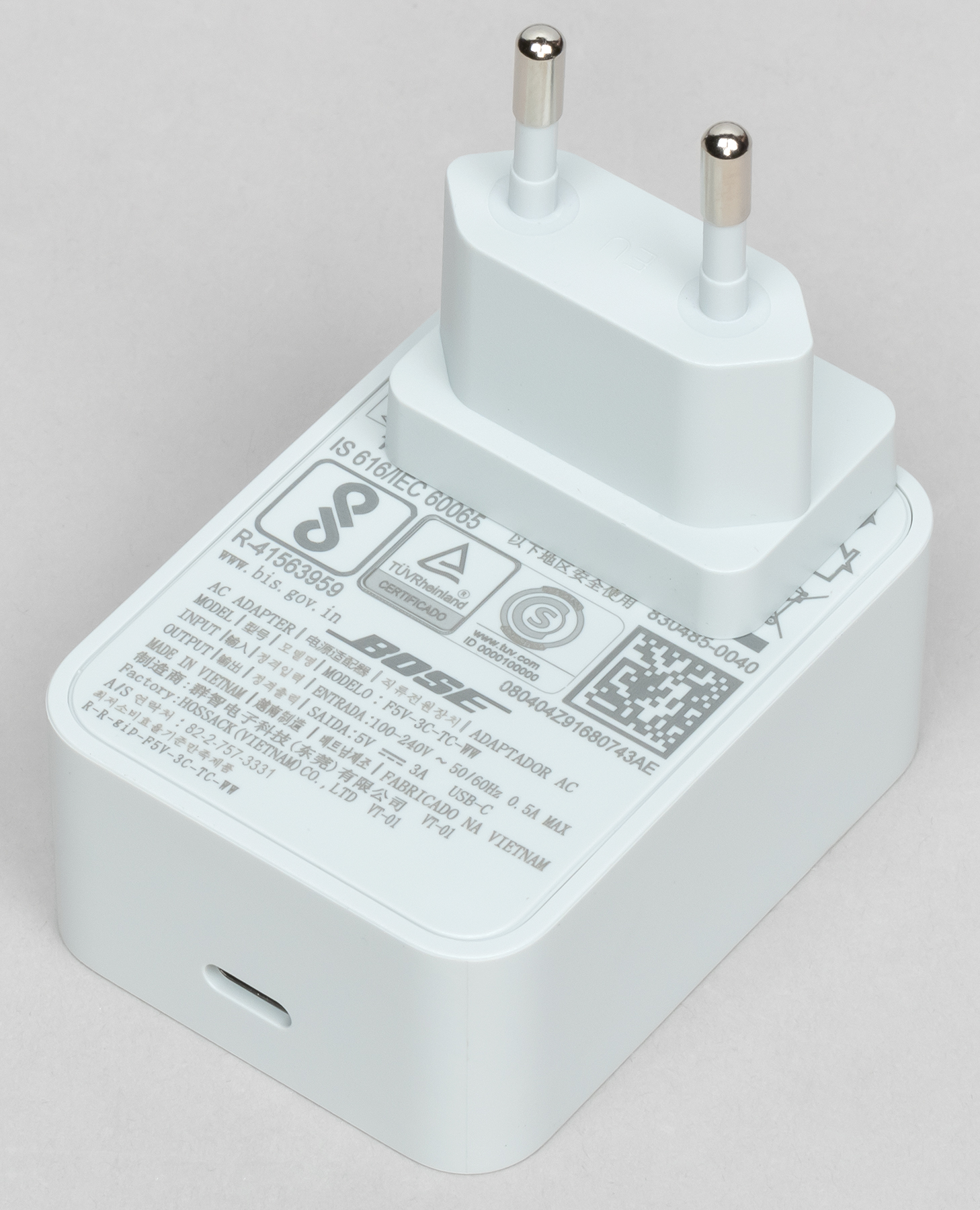 В комплект поставки Bose Portable Home Speaker входят сама колонка, документация, кабель USB-C—USB-C для зарядки, а также ЗУ со съемной вилкой (формат вилки зависит от страны поставки).