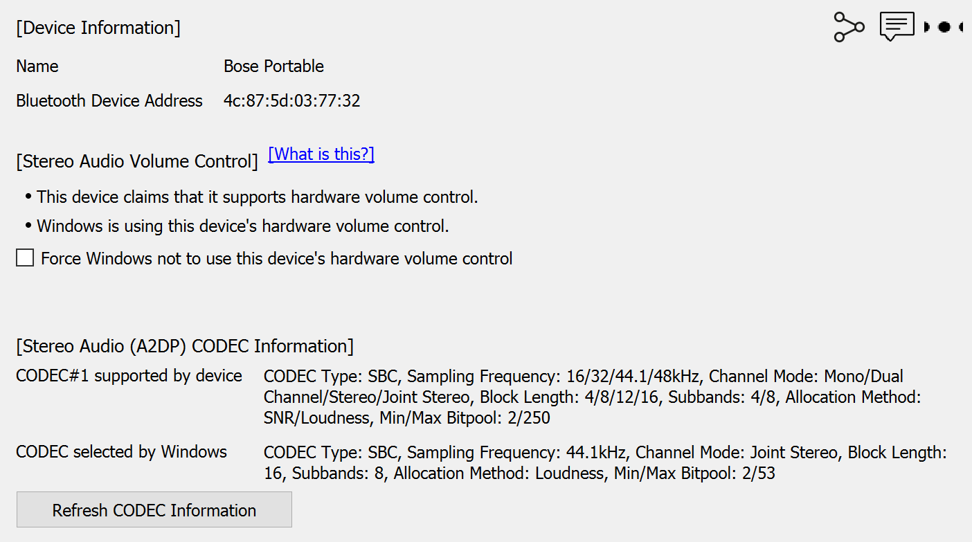 По всей видимости, разработчики решили, что дома в основном будет использоваться сетевое подключение, а на свежем воздухе вполне хватит и базового кодека. В целом, своя логика в этом есть, да и SBC не так плох, как о нем принято думать. Большинство производителей устанавливает параметр Max Bitpool в 53, что ограничивает битрейт 328 килобитами в секунду — немного, но для потока с какого-нибудь Spotify вполне достаточно. У Bose Portable Home Speaker значение Max Bitpool намного выше — 250, но по факту большинство ОС будет использовать стандартное значение 53 — в частности, Windows 10 в нашем случае поступила именно так.