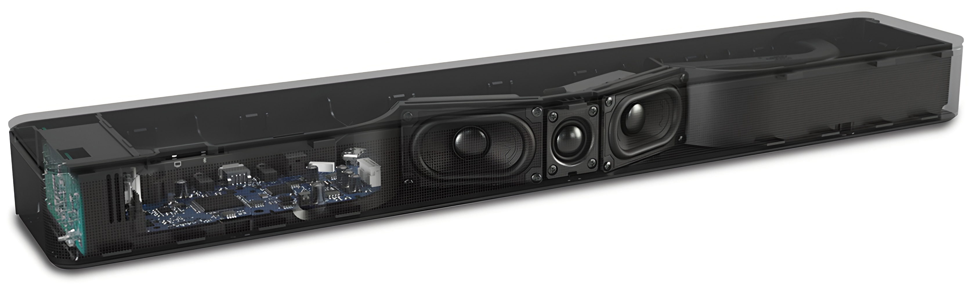 Как уже отмечалось в разделе с техническими характеристиками, Bose традиционно не раскрывает подробностей о том, какие динамики установлены в устройстве. Разобрать саундбар без риска не собрать его обратно вряд ли получится — слишком много непредсказуемых креплений, защелок и хрупких элементов, которые легко повредить при демонтаже. Однако на сайте производителя удалось найти иллюстрацию, где хорошо видны три активных излучателя: центральный твитер и два широкополосных динамика формата Racetrack, направленные в разные стороны для создания стереоэффекта. Внутри правой части корпуса угадывается изогнутая труба фазоинвертора.