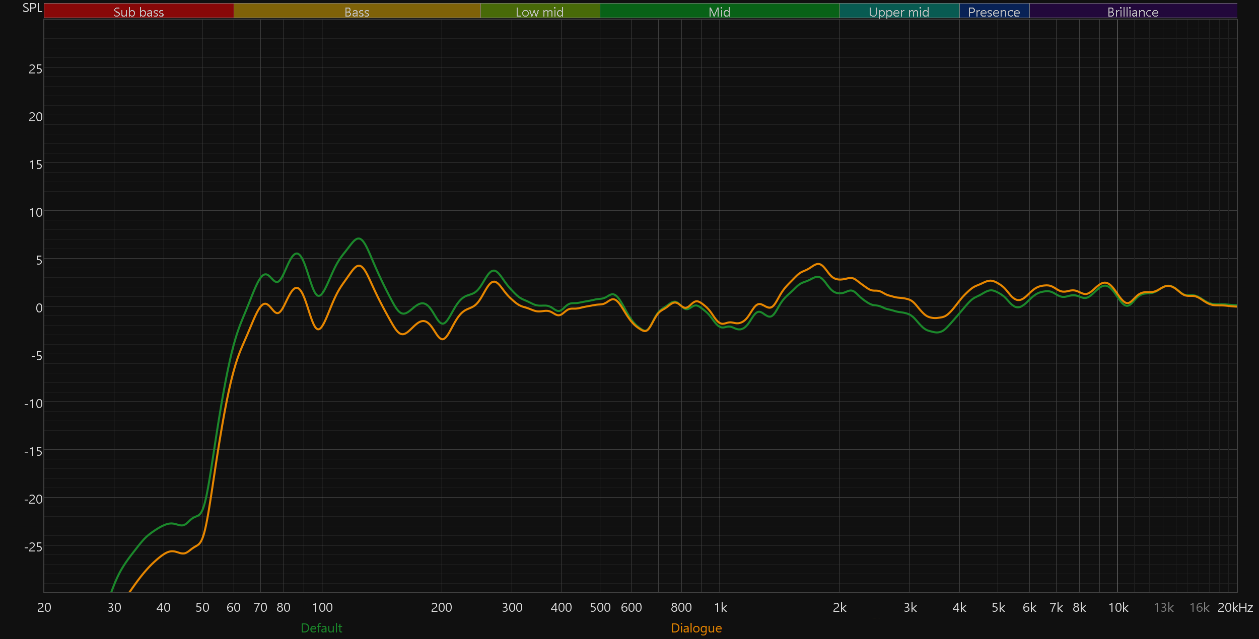 Режим «Диалог» работает логичным образом: НЧ-диапазон основательно уводится назад, а средние частоты получают заметный акцент, что делает речь более читаемой.