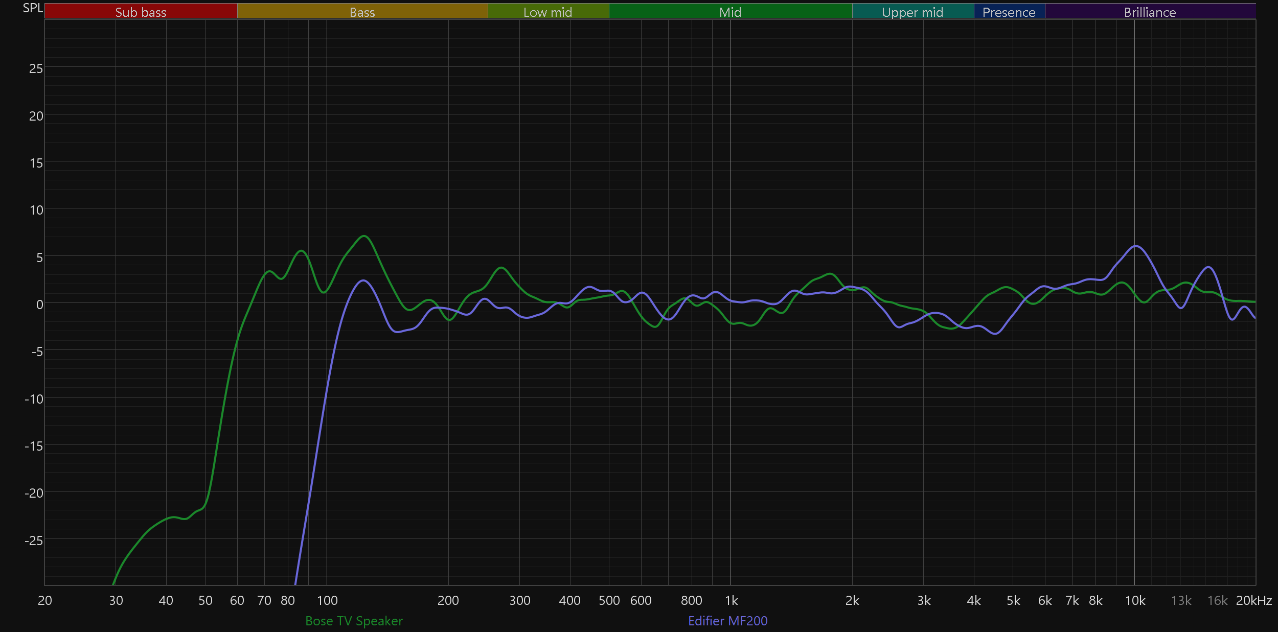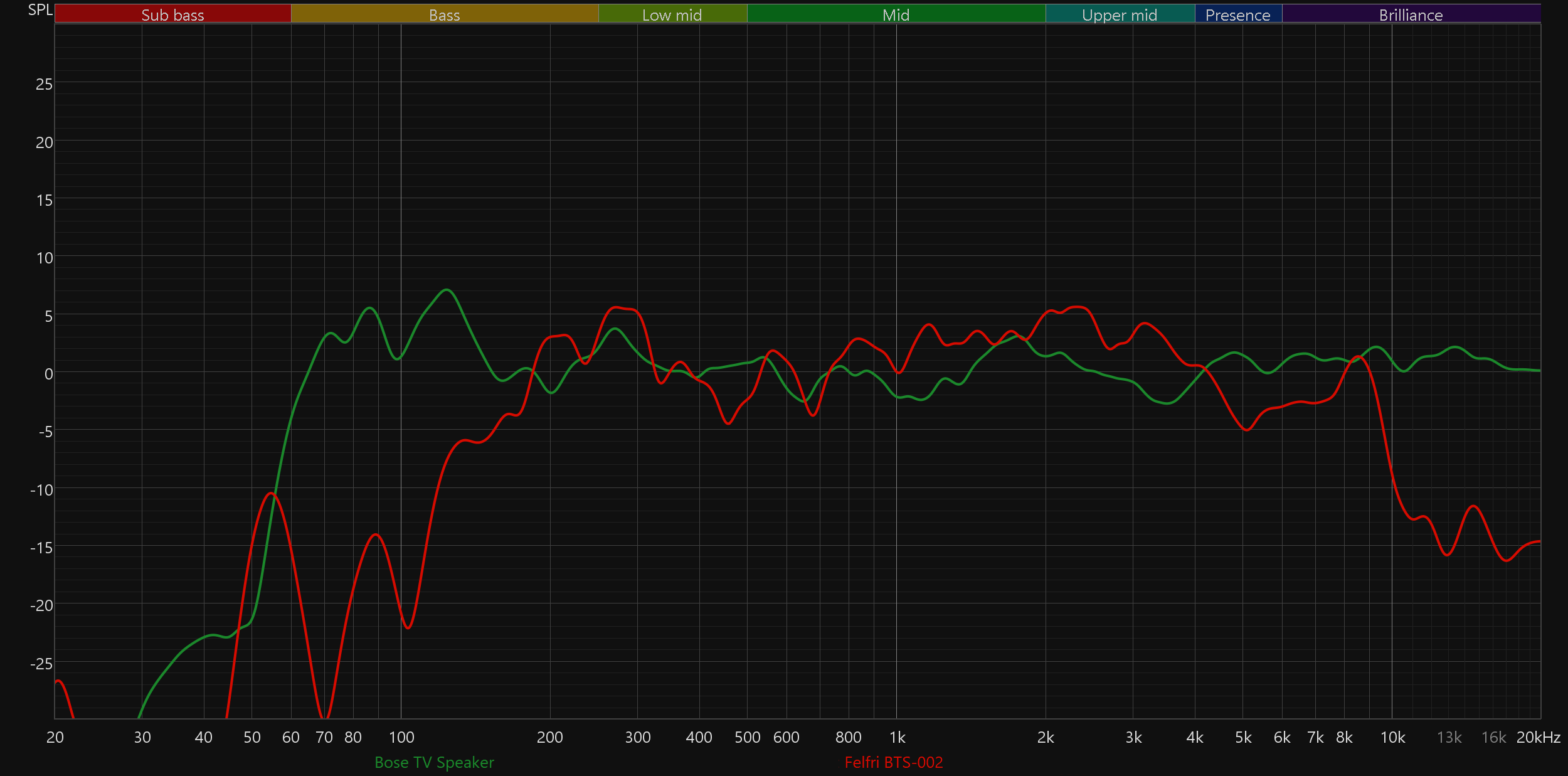 Сравним АЧХ Bose TV Speaker с результатами других протестированных нами саундбаров, для начала — из бюджетного сегмента. Здесь все предсказуемо: Bose заметно увереннее воспроизводит крайние участки диапазона, да и середину подает намного ровнее.