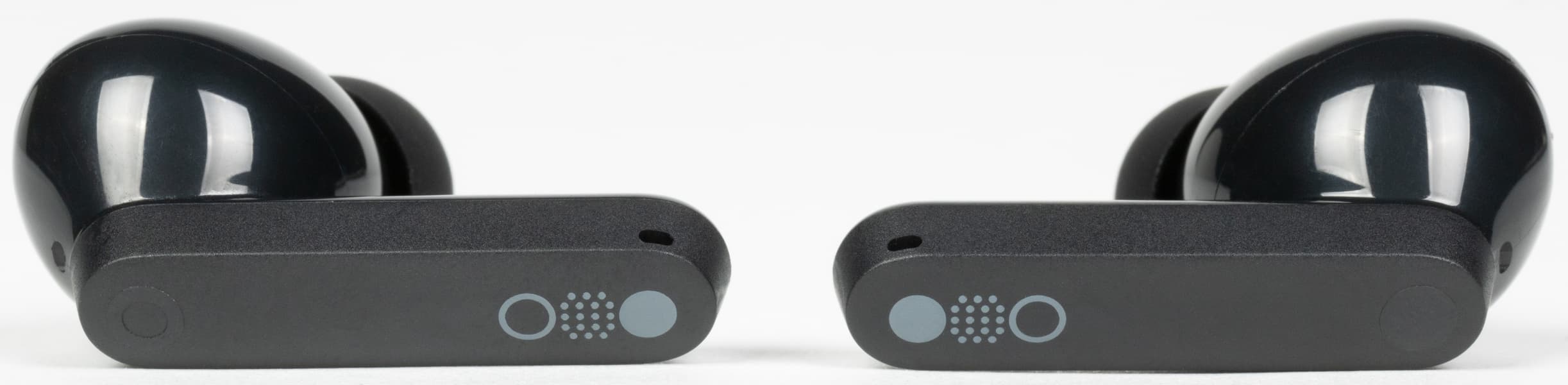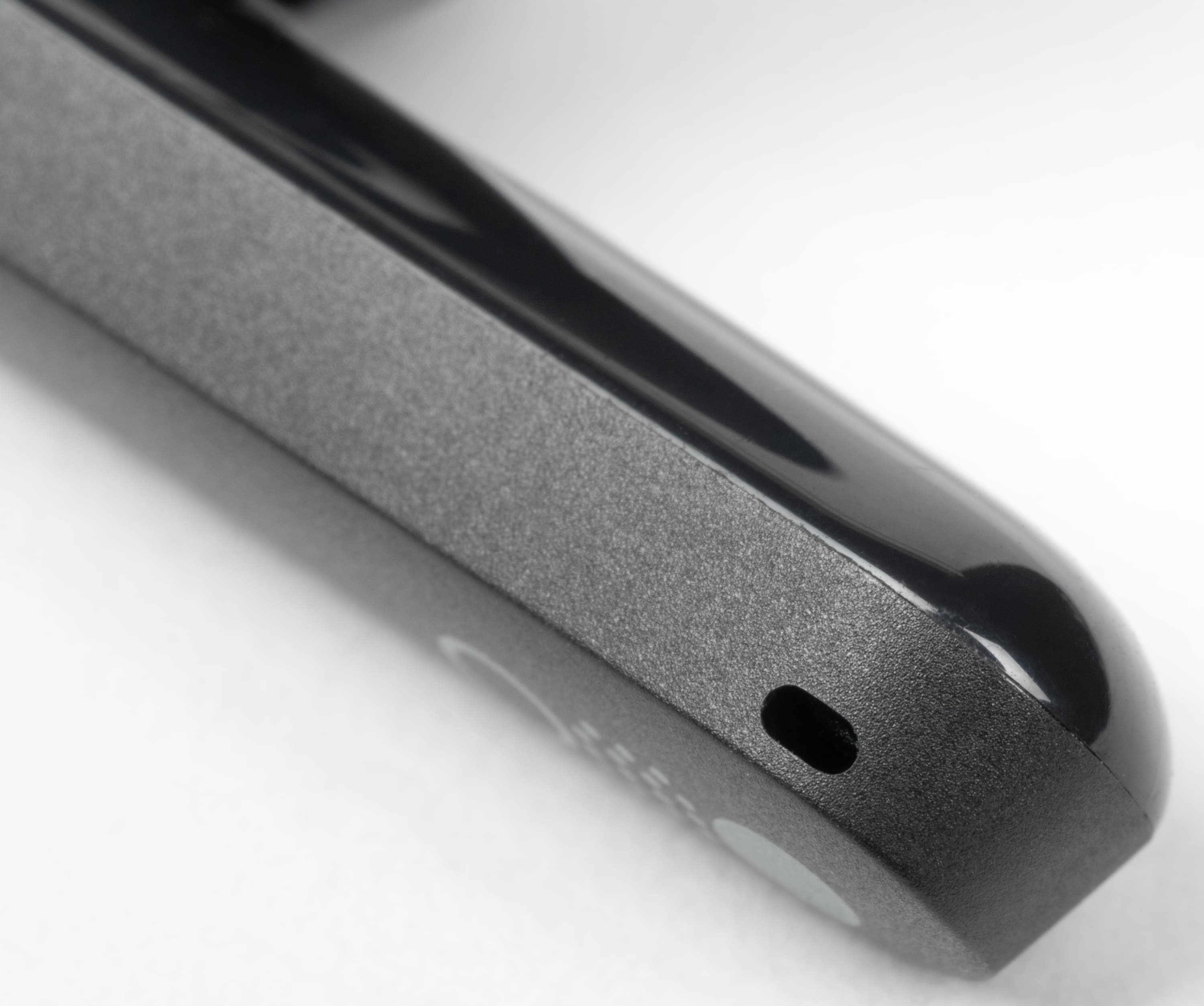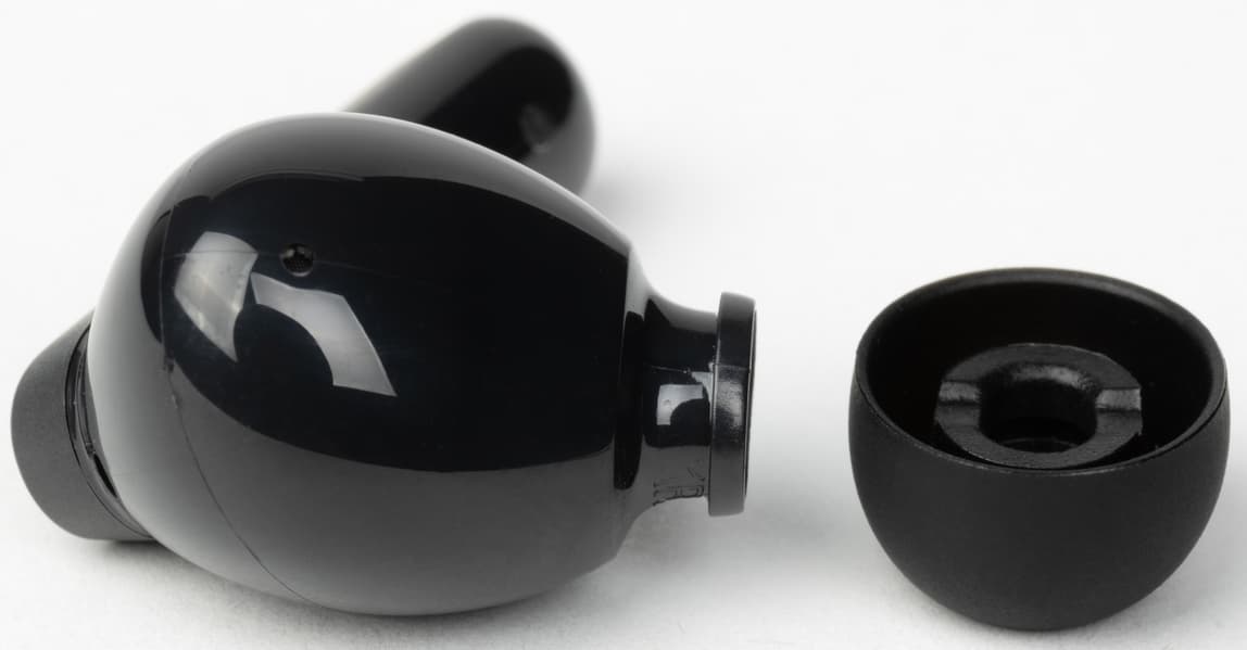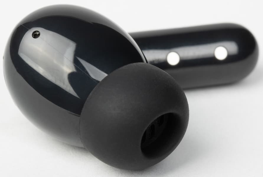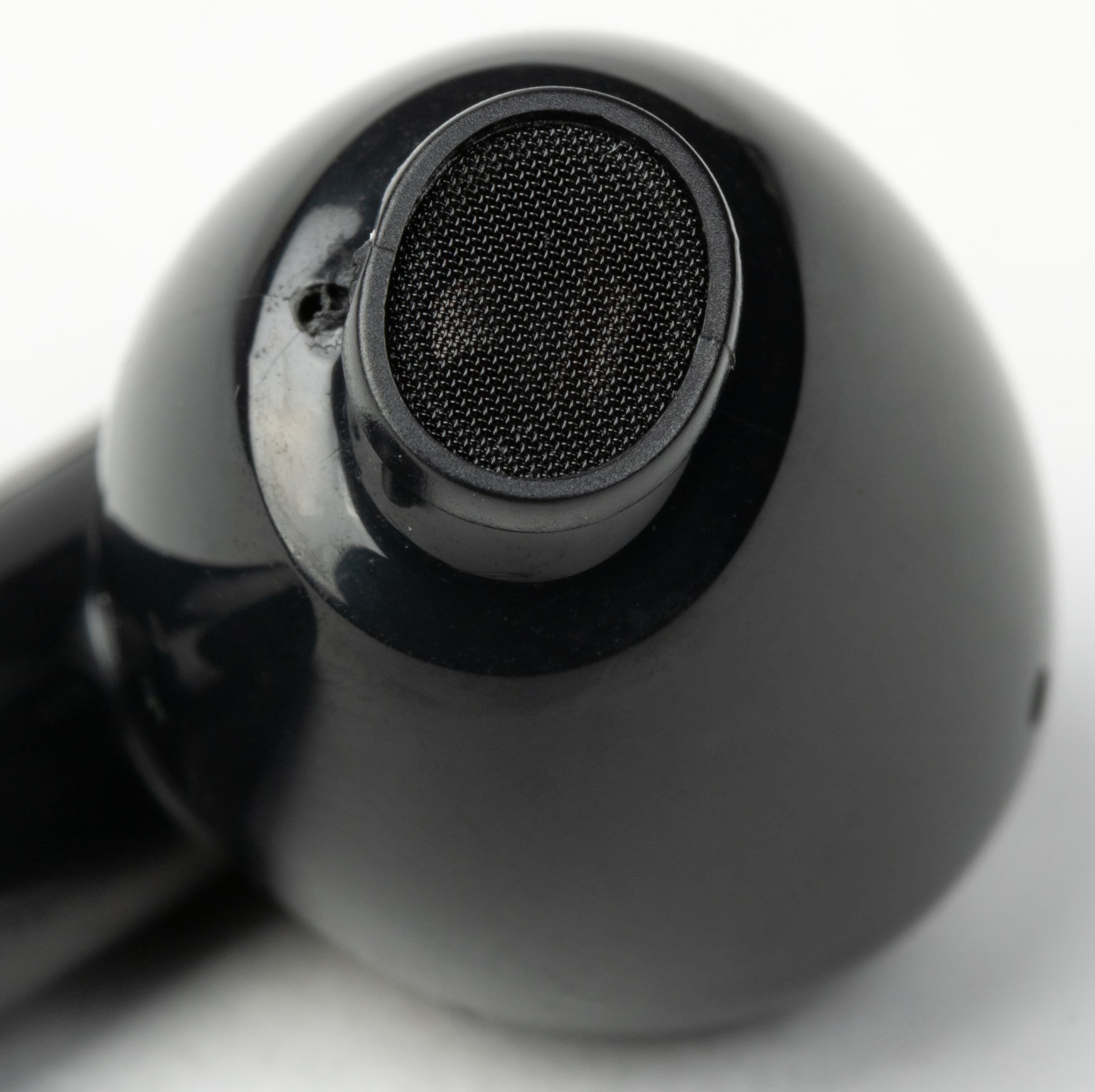 Отверстие внешнего микрофона гибридной системы активного шумоподавления размещено чуть выше основания «палочки» на округлой части.