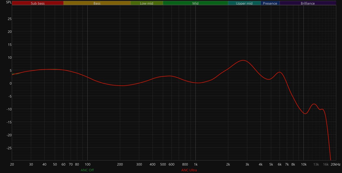 Система активного шумоподавления не блещет эффективностью, зато и на звучание влияет минимально: графики до и после ее задействования полностью совпали.