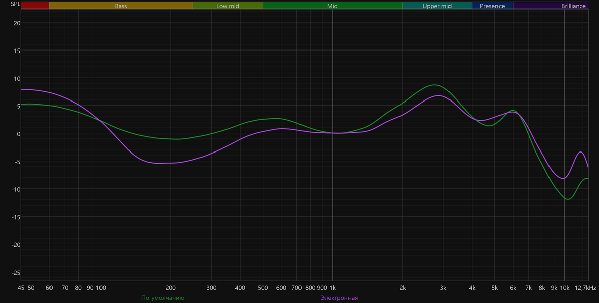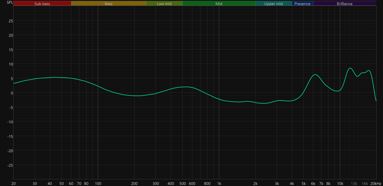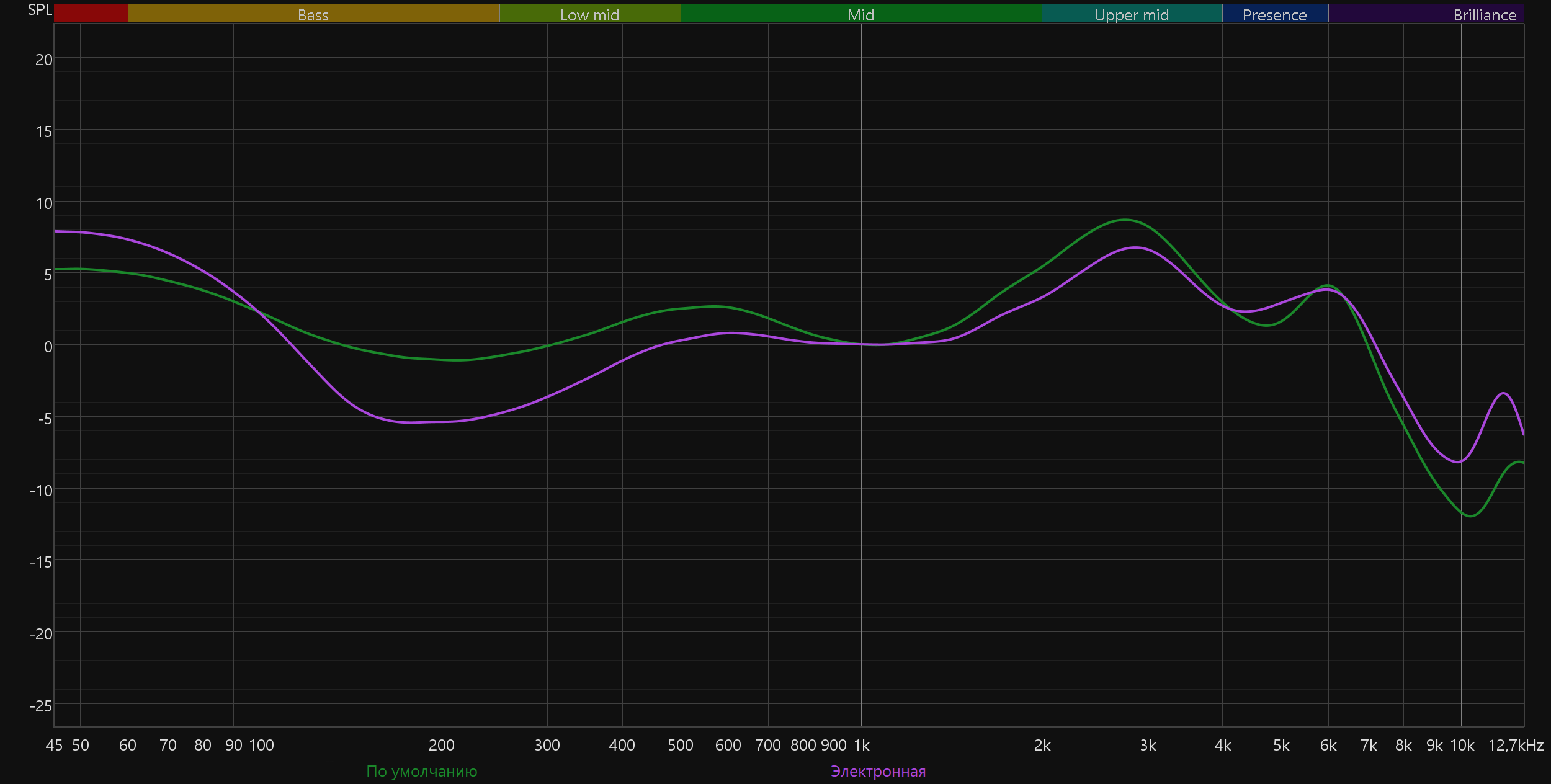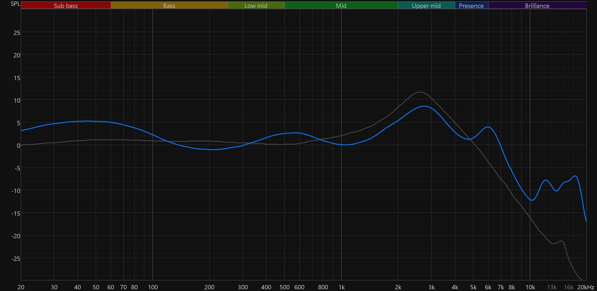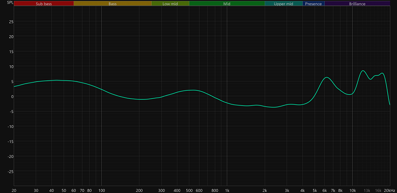 График АЧХ показан на фоне кривой IDF (IEM diffuse field compensation), предоставленной производителем используемого стенда. Ее задача — помочь скомпенсировать резонансные явления в имитированном слуховом канале и особенности оборудования, создав «звуковой профиль», максимально корректно иллюстрирующий то, как звучание наушников воспринимается слушателем. Ее можно рассматривать как адаптированный под конкретное устройство аналог так называемой «кривой Хармана», созданной командой Harman International под руководством доктора Шона Олива.