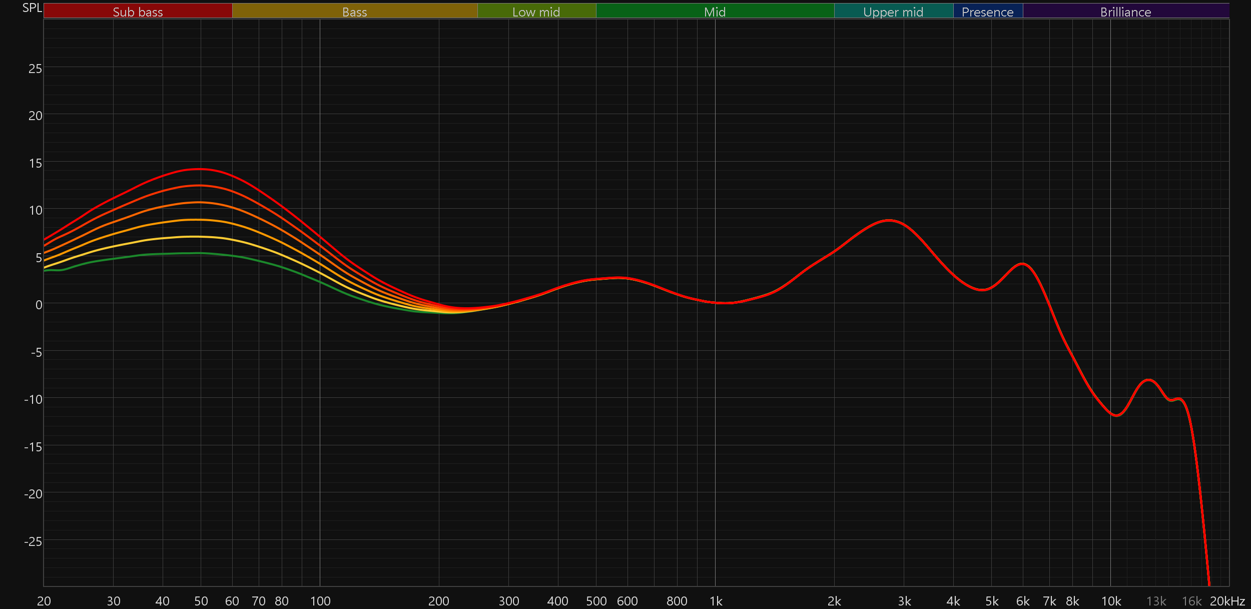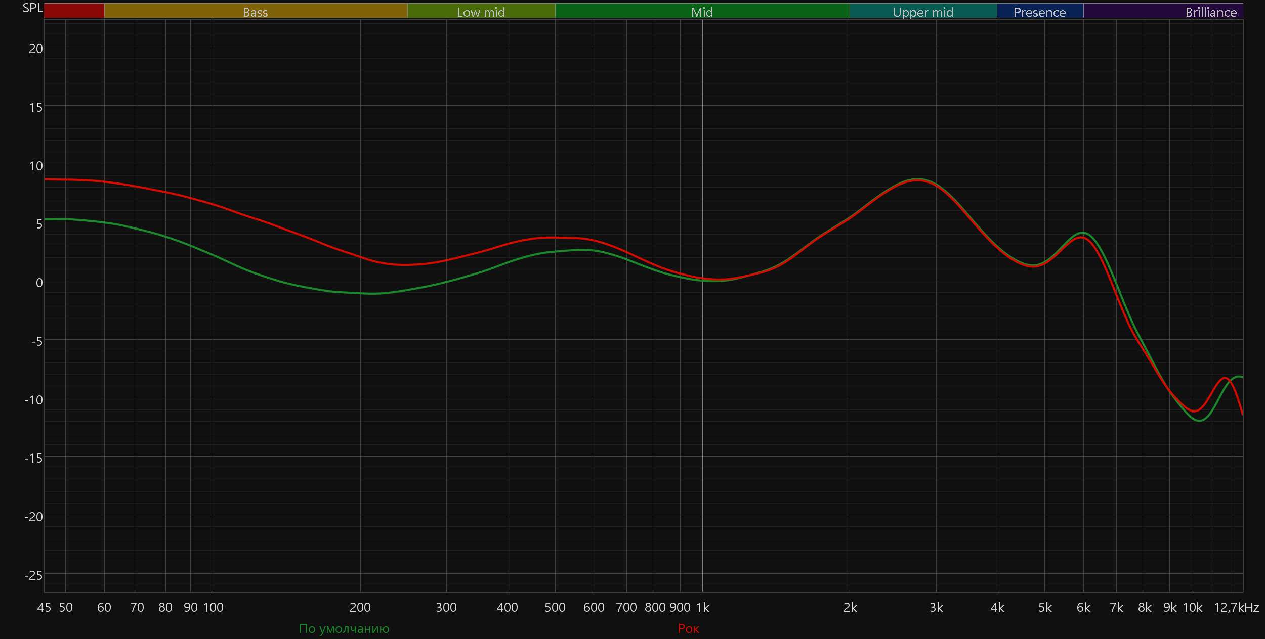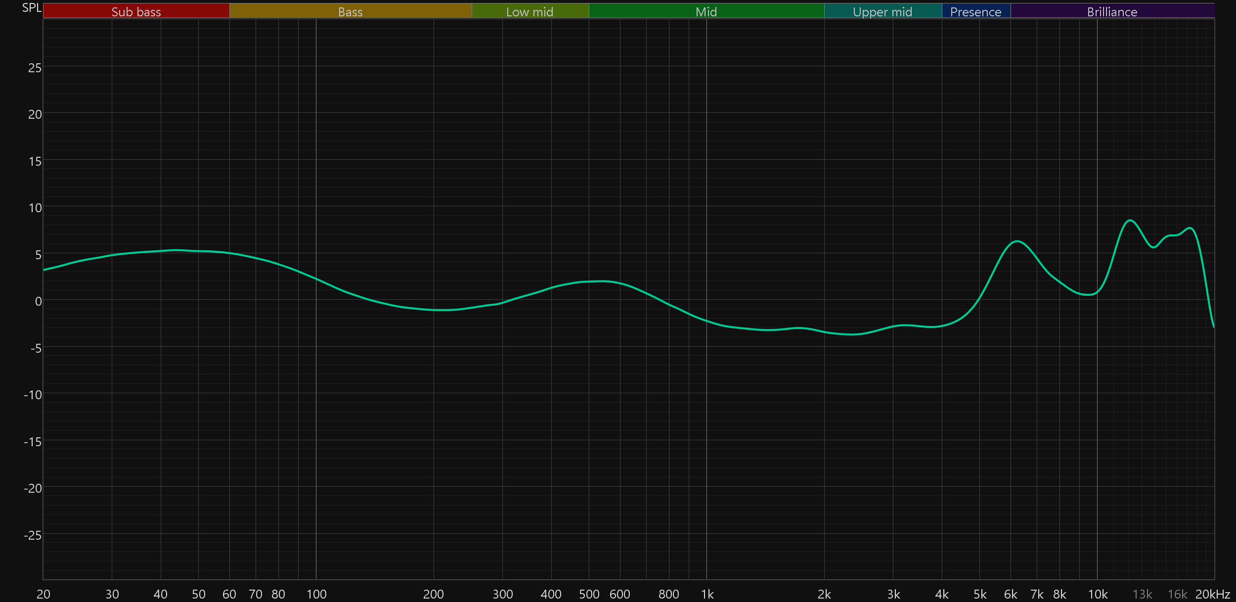 График АЧХ показан на фоне кривой IDF (IEM diffuse field compensation), предоставленной производителем используемого стенда. Ее задача — помочь скомпенсировать резонансные явления в имитированном слуховом канале и особенности оборудования, создав «звуковой профиль», максимально корректно иллюстрирующий то, как звучание наушников воспринимается слушателем. Ее можно рассматривать как адаптированный под конкретное устройство аналог так называемой «кривой Хармана», созданной командой Harman International под руководством доктора Шона Олива.