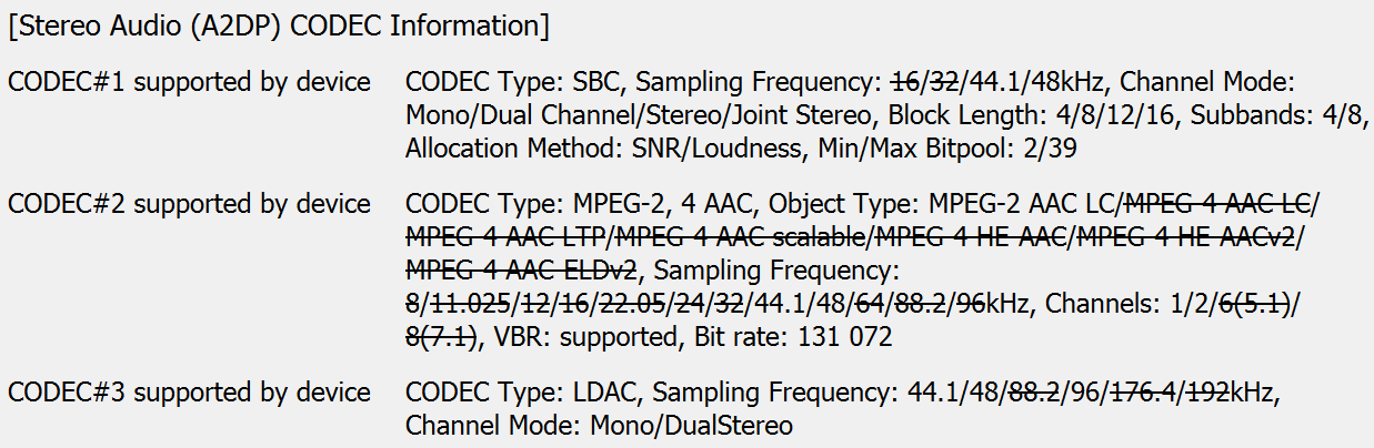 Обо всем, что с ней происходит, гарнитура CMF Buds Pro 2 сообщает громкими «бульками» — чуть резковатыми, но в целом терпимыми. Список поддерживаемых кодеков и их режимов мы традиционно получили с помощью утилиты Bluetooth Tweaker.