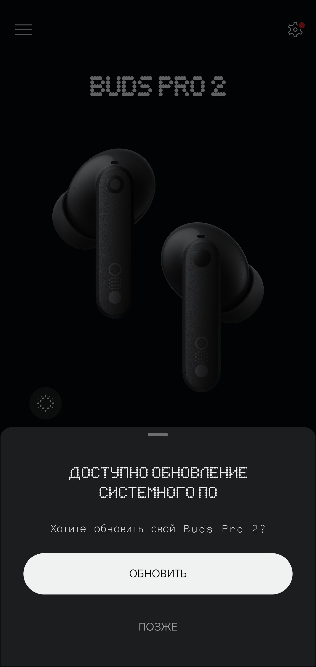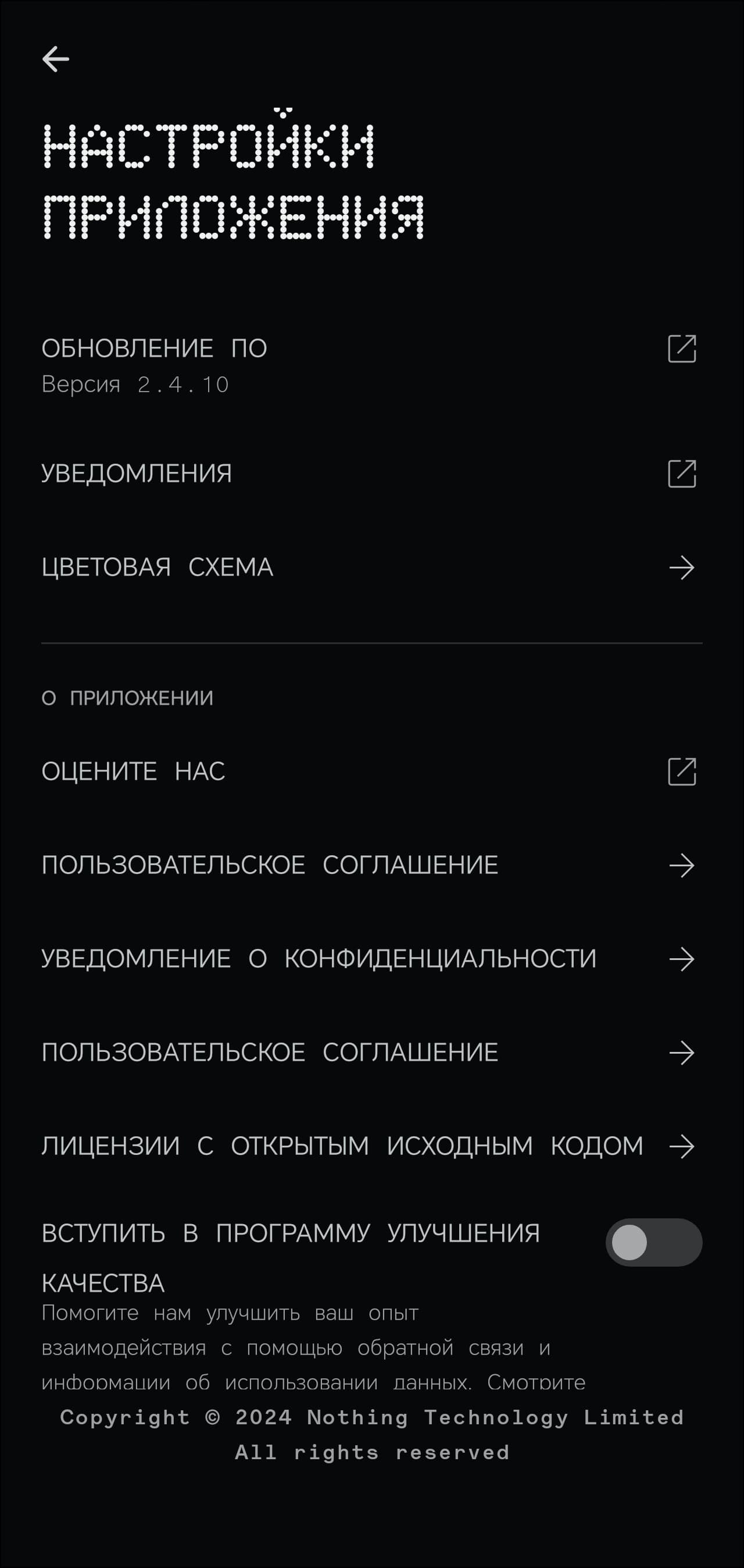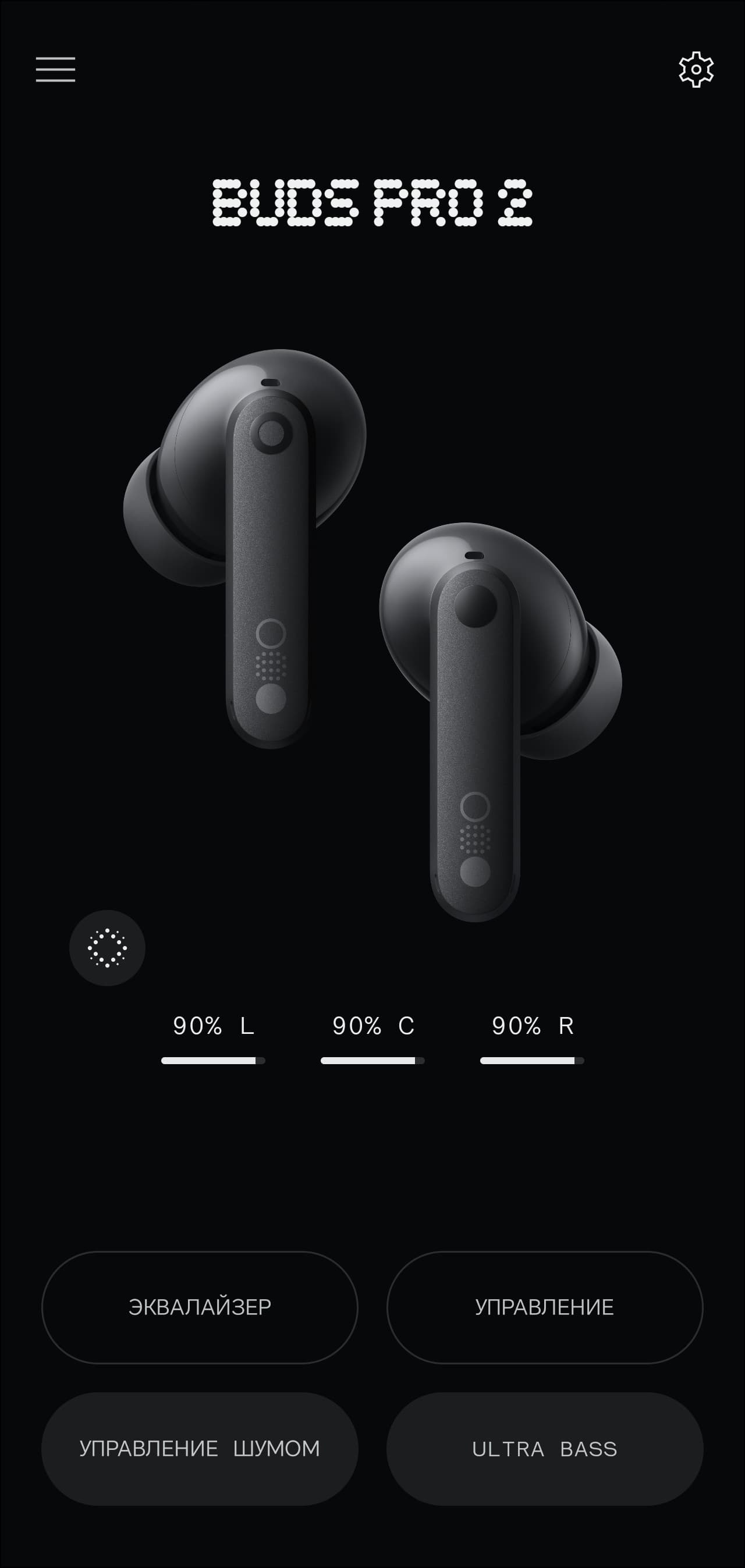 Возвращаемся на главный экран. Тут можно увидеть зарядку отдельно каждого из наушников, а также кейса, это удобно. На странице настройки приложения можно посмотреть версию прошивки, изменить цветовую схему и настроить уведомления. Там же доступна всяческая дополнительная информация — от пользовательского соглашения до лицензий. По тапу на иконку шестеренки в правом верхнем углу открывается меню настройки устройства, в котором есть масса всего интересного — на нем остановимся поподробнее.