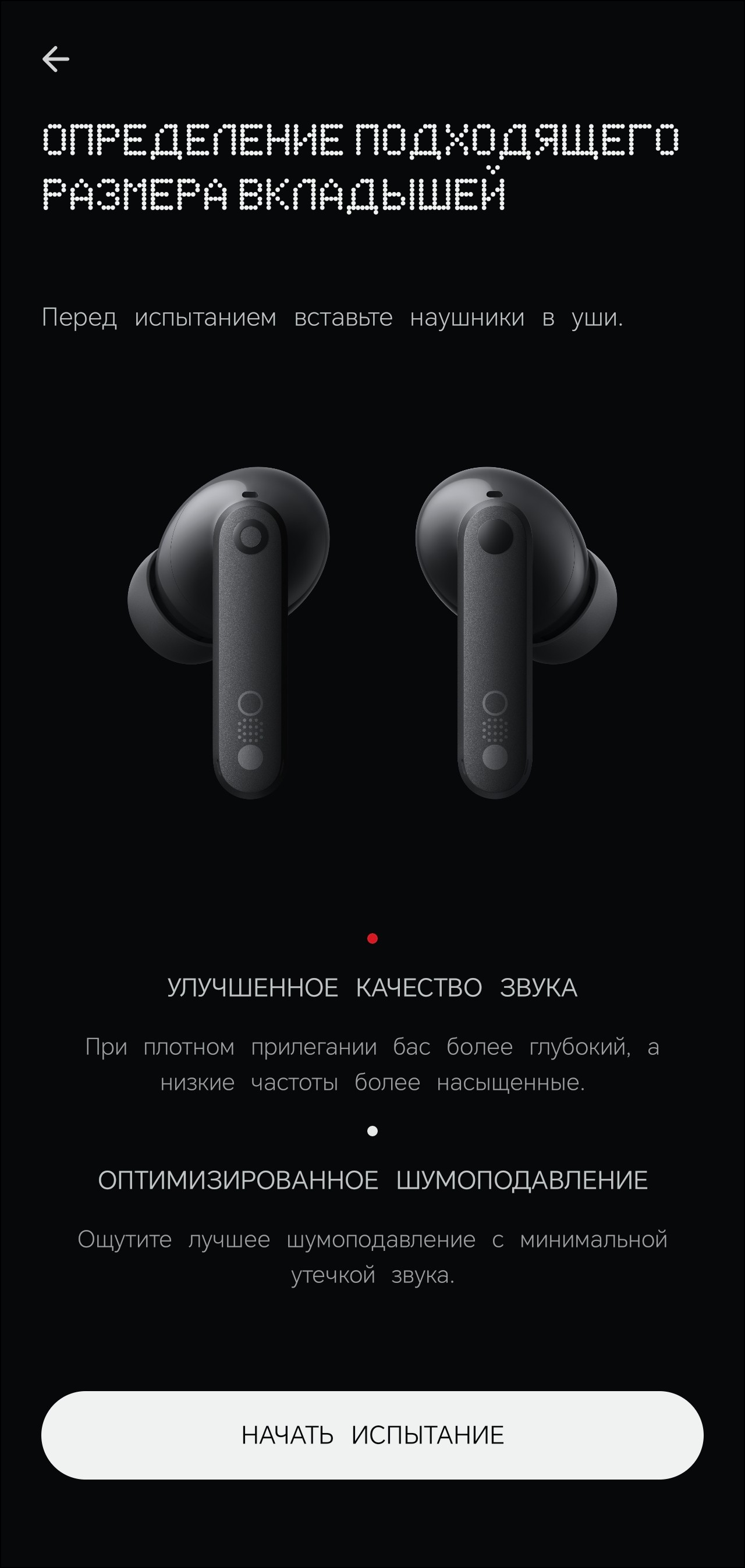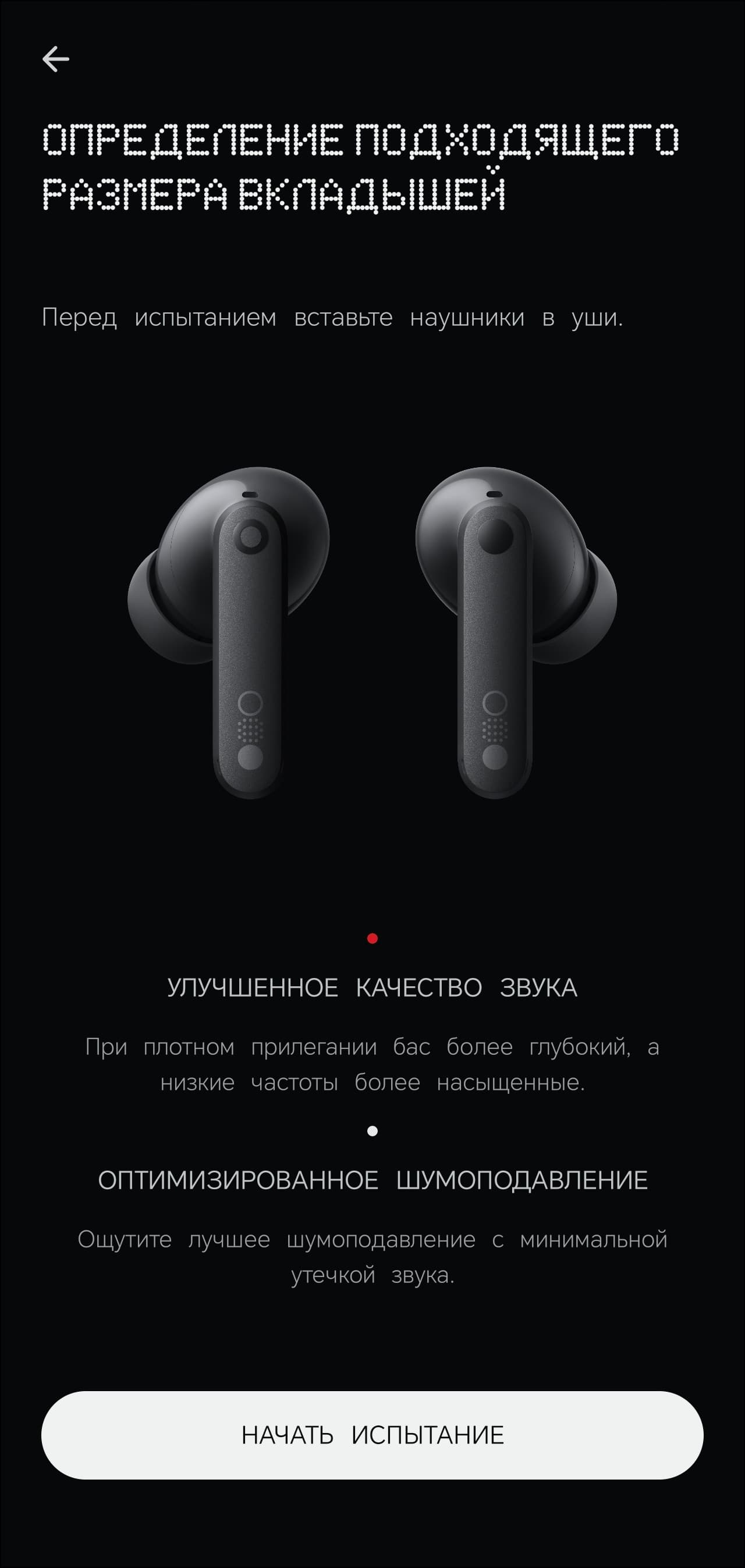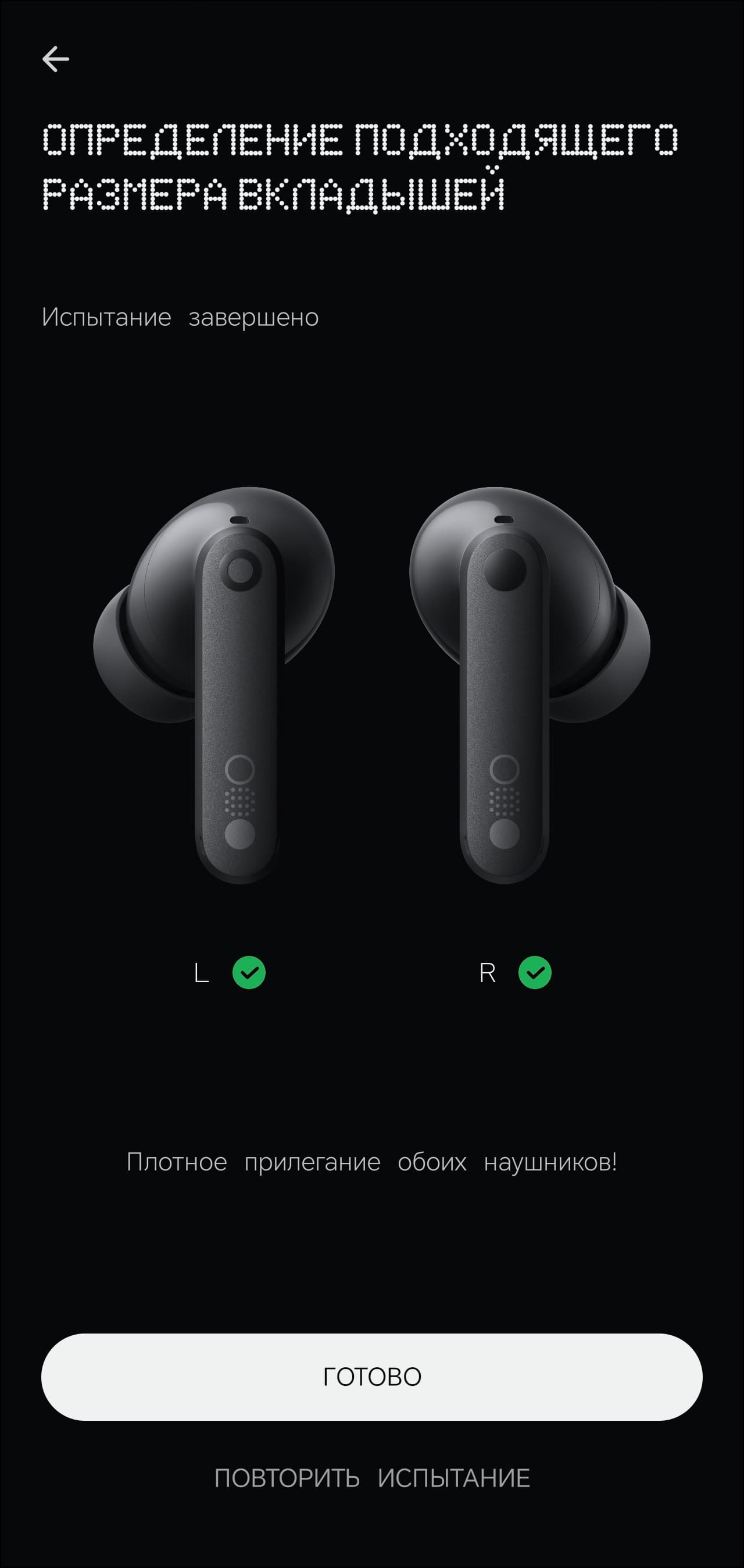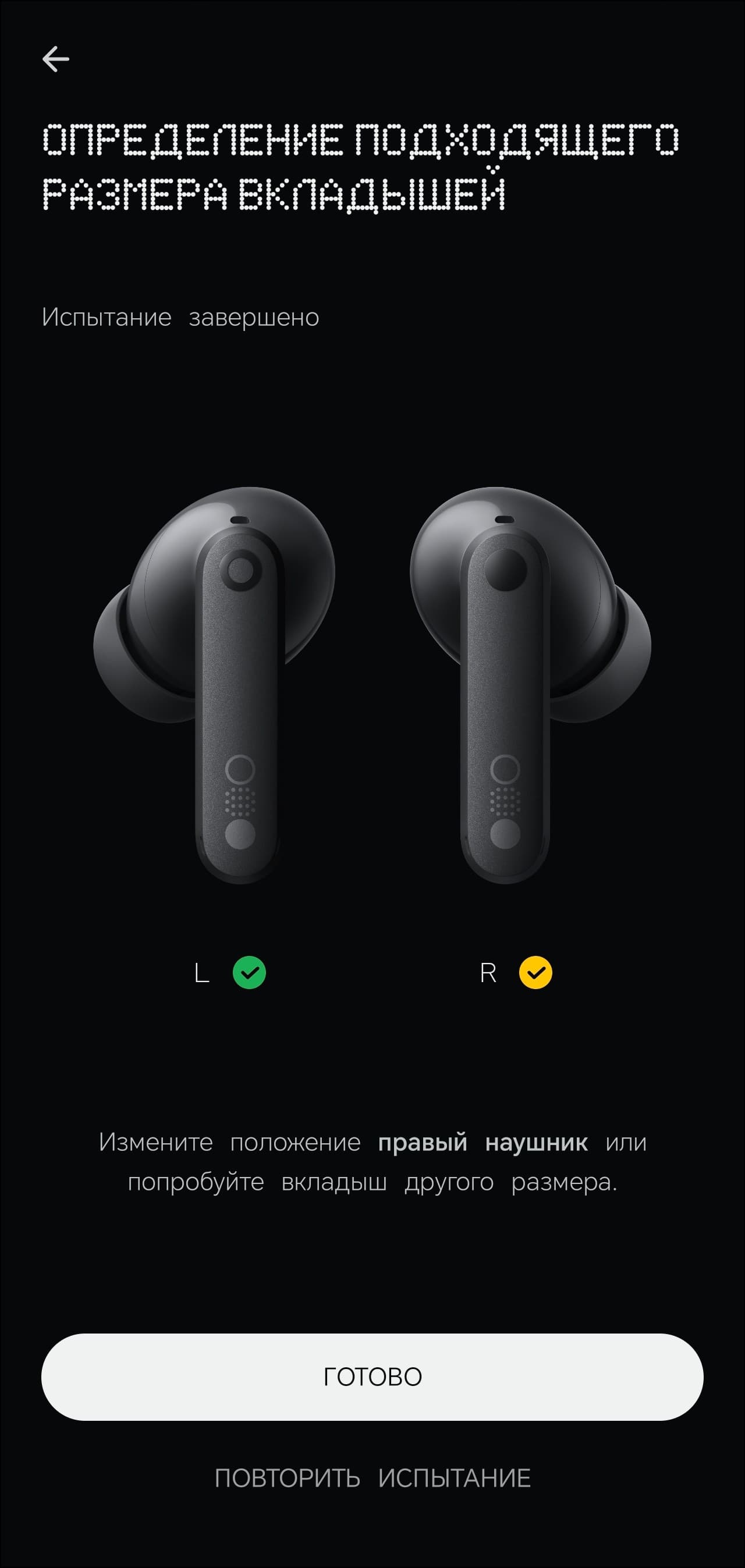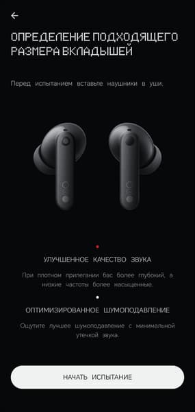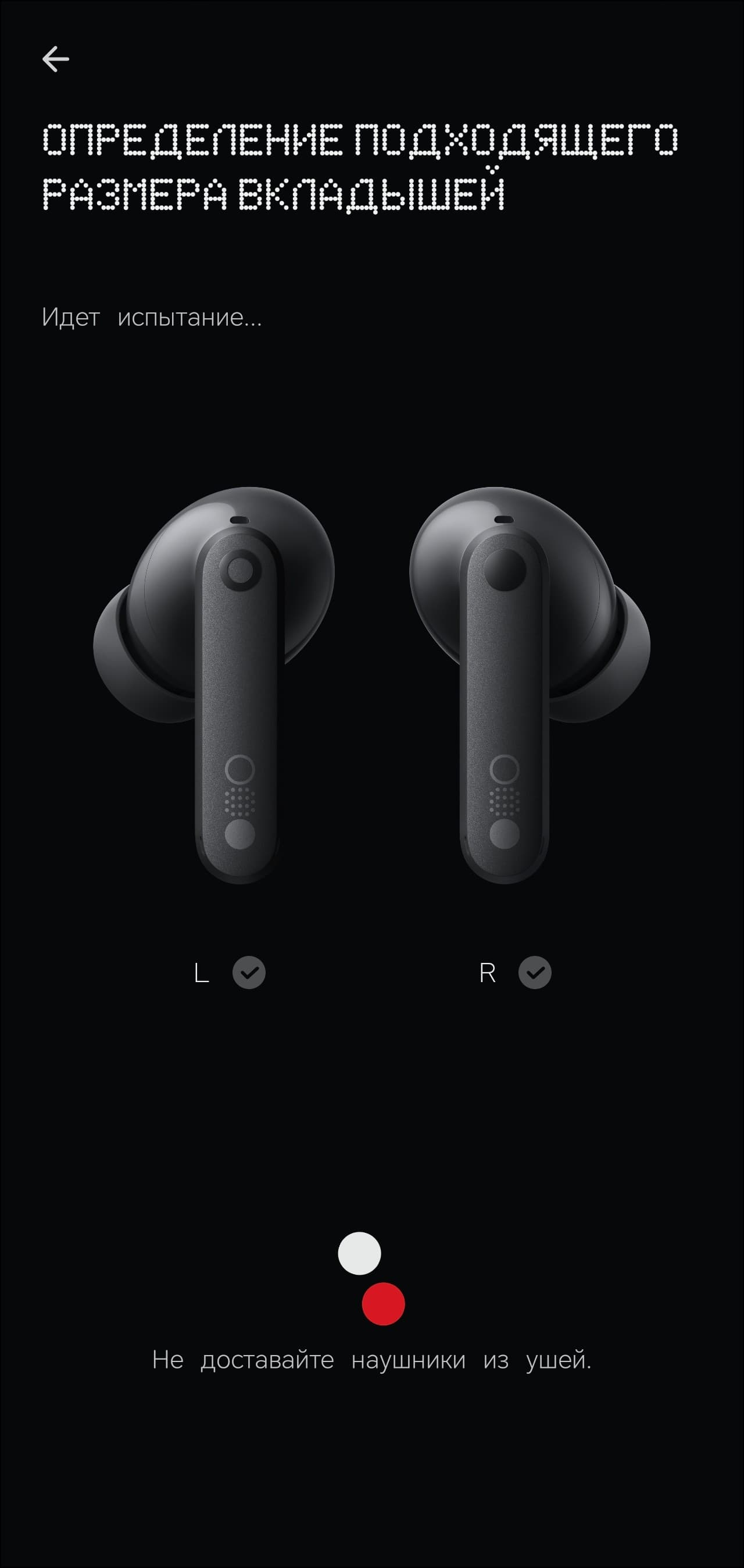 Сервис определения качества посадки и «подходящести» размера вкладышей работает стандартным образом: динамики наушников воспроизводят специальный сигнал, а внешние микрофоны пытаются его уловить. Если у них это получается, значит, уровень утечек слишком велик, наушники сидят плохо, есть смысл сменить силиконовые насадки. Мы протестировали работу системы, чуть ослабив крепление правого наушника — приложение тут же нам об этом сообщило.