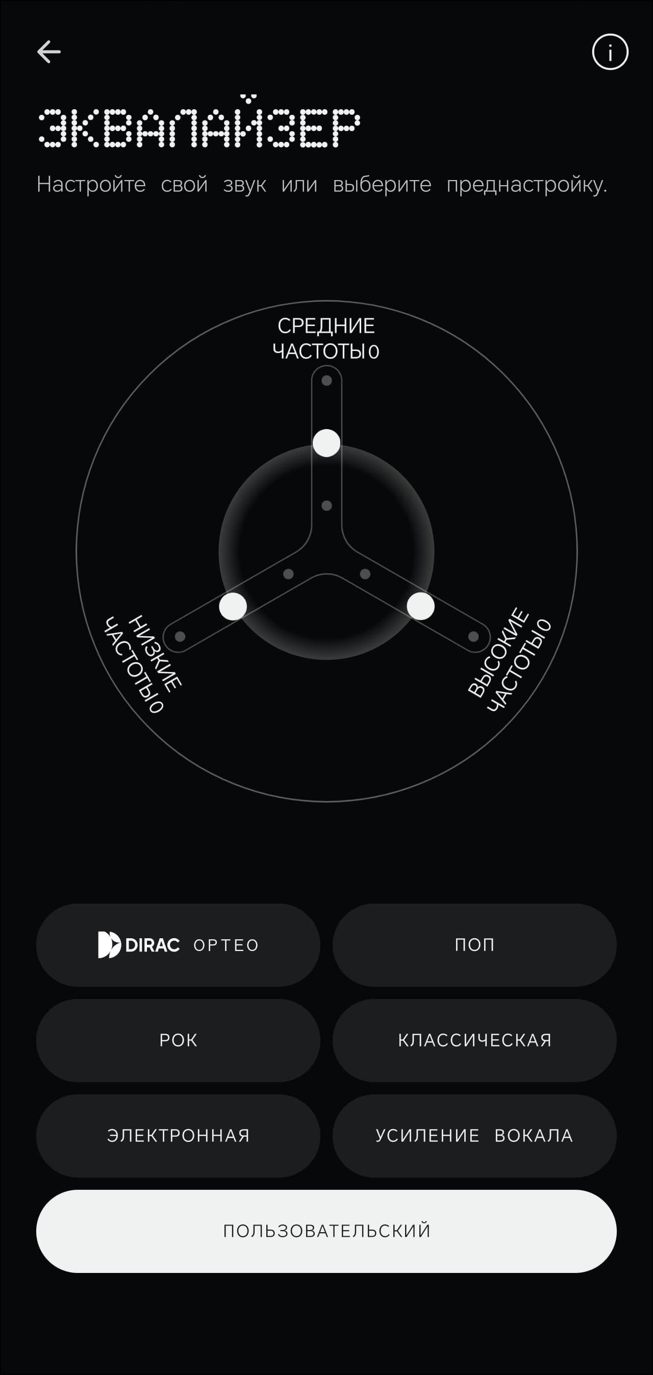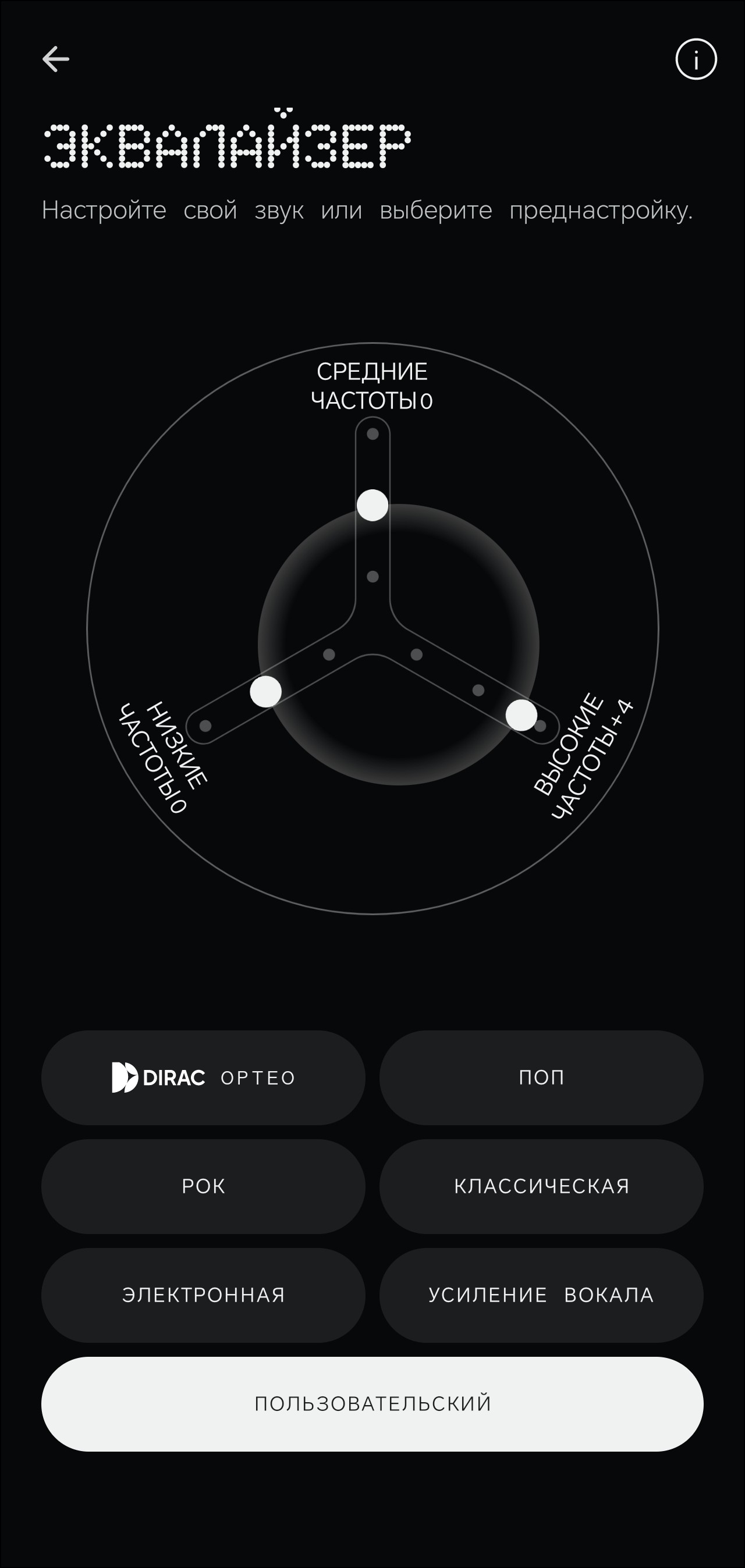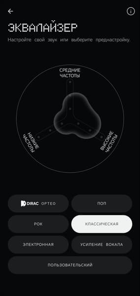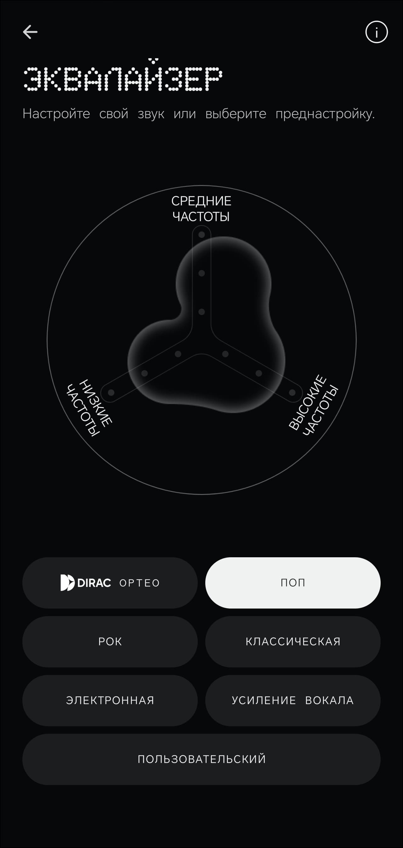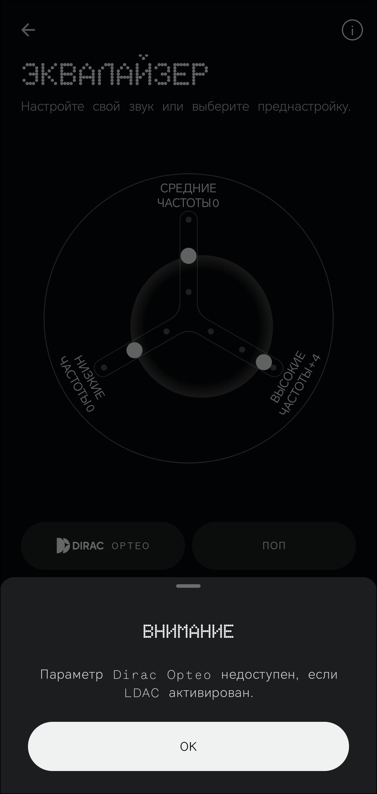 По умолчанию доступны шесть пресетов, самый интересный из которых — это Dirac, названный так по имени компании-разработчика, хорошо известной своими продуктами коррекции сигнала под различные условия: помещение, используемое оборудование и так далее. Сама же компания, кстати, названа в честь британского физика Поля Дирака, чье имя связано с математической функцией, положенной в основу алгоритмов акустической коррекции. Однако пресет Dirac недоступен при использовании LDAC, только с AAC — так что тут придется выбирать.