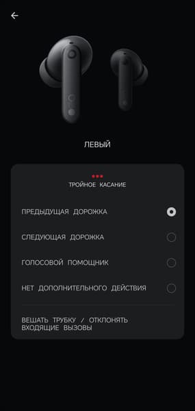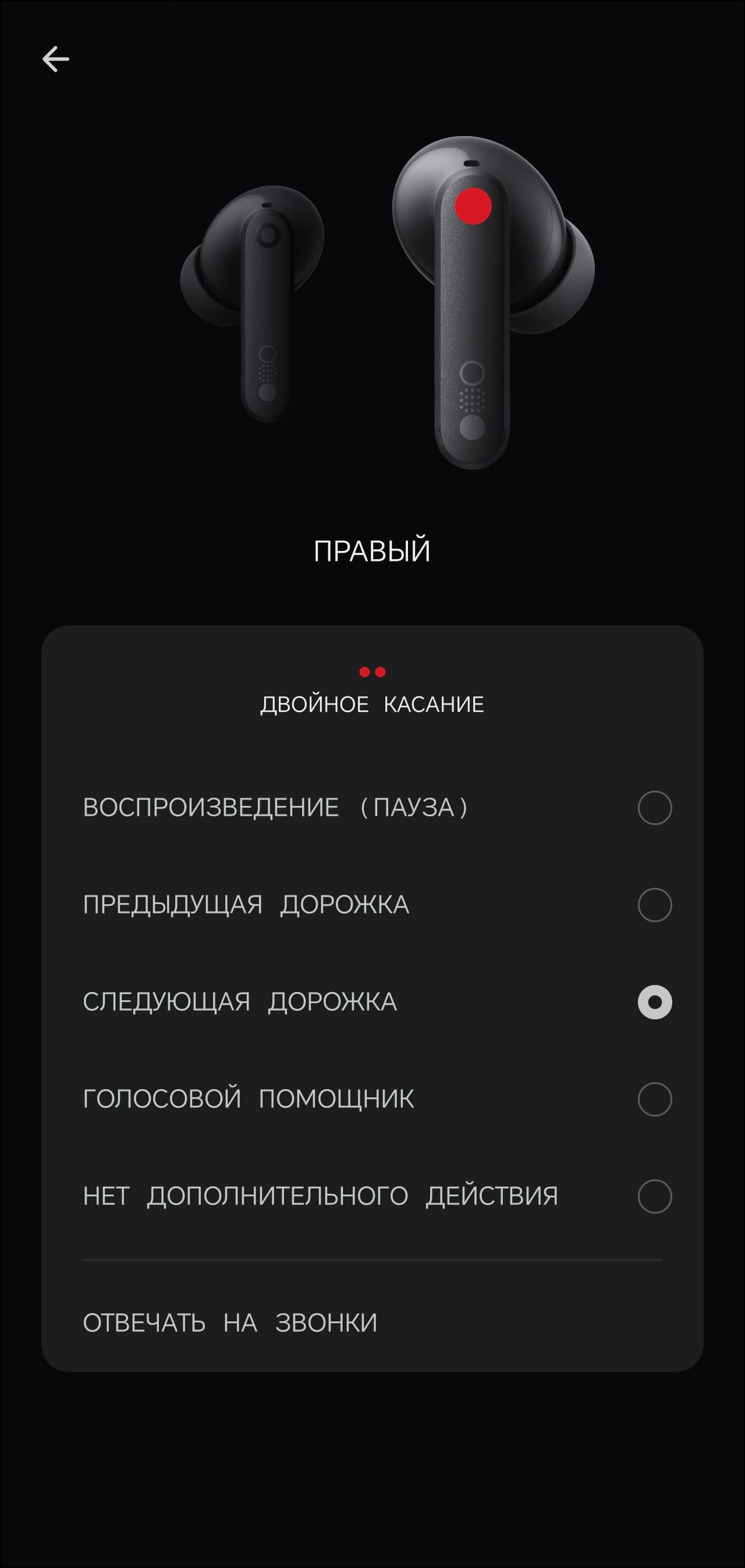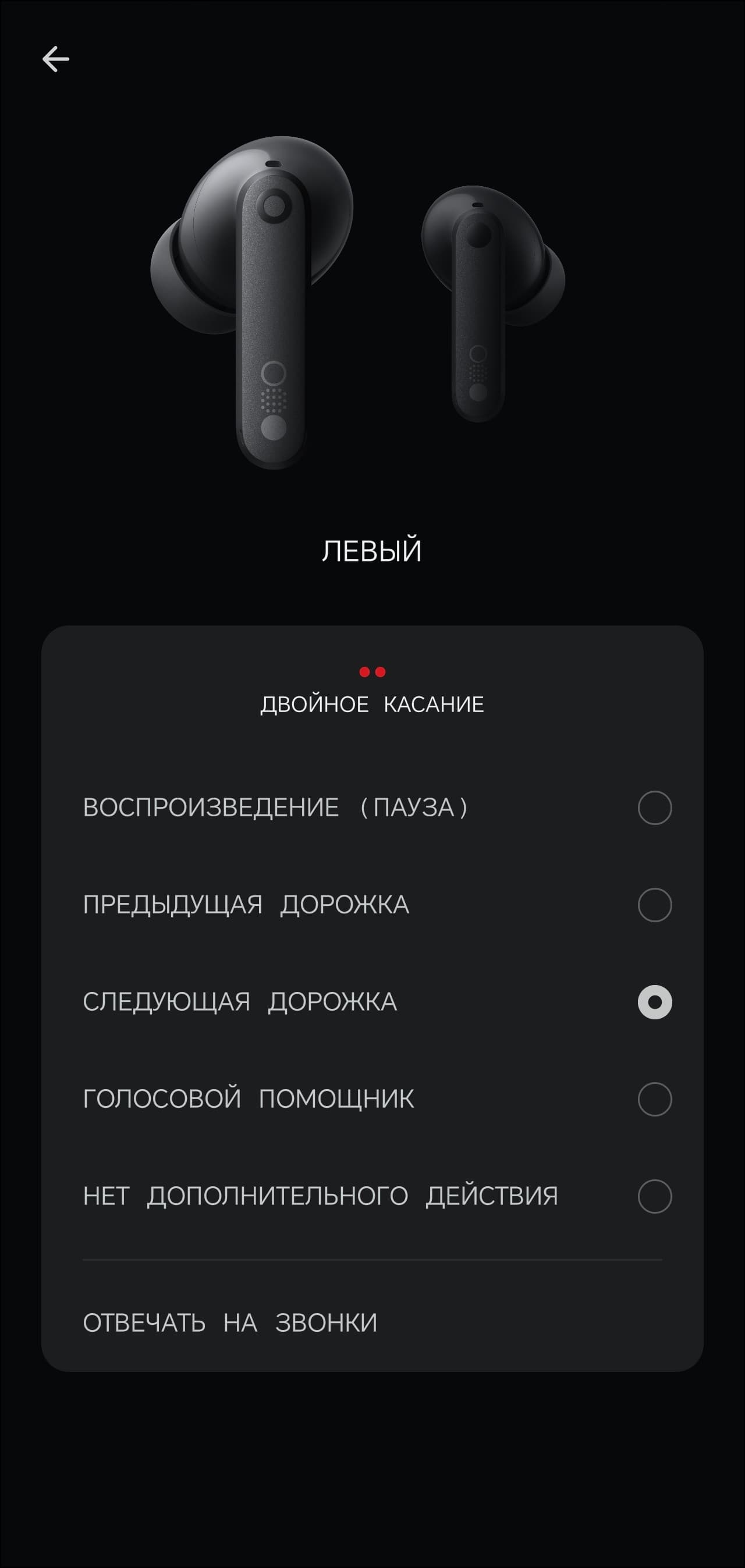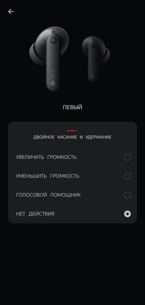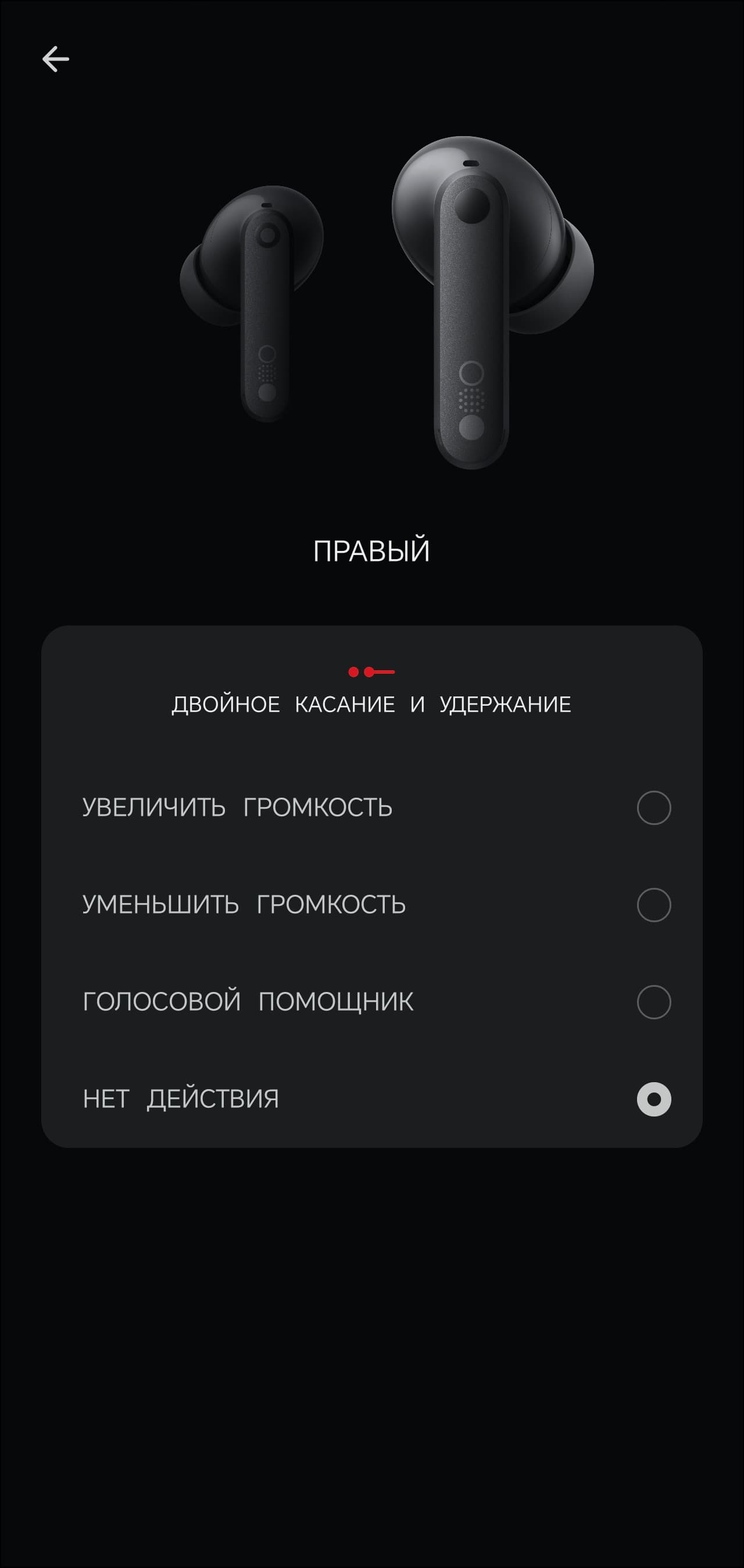 Система умеет различать касания правого и левого наушников, одинарное заблокировано во избежание фантомных срабатываний. При этом всего типов касания распознаётся аж четыре штуки: двойное, тройное, одинарное с удержанием и двойное с удержанием. На последнее можно «повесить» регулировку громкости, и хотя это явно не самый удобный вариант, как альтернатива колесику на всякий случай сгодится.