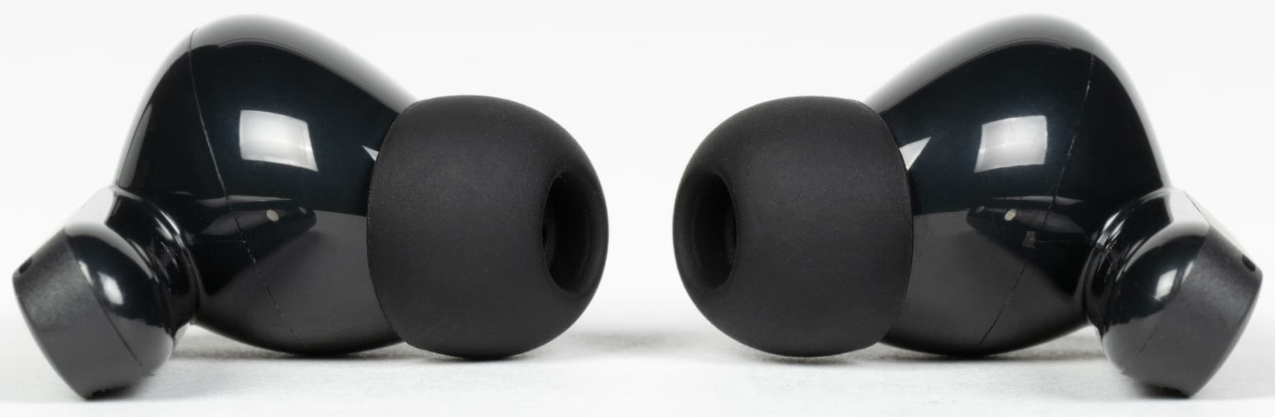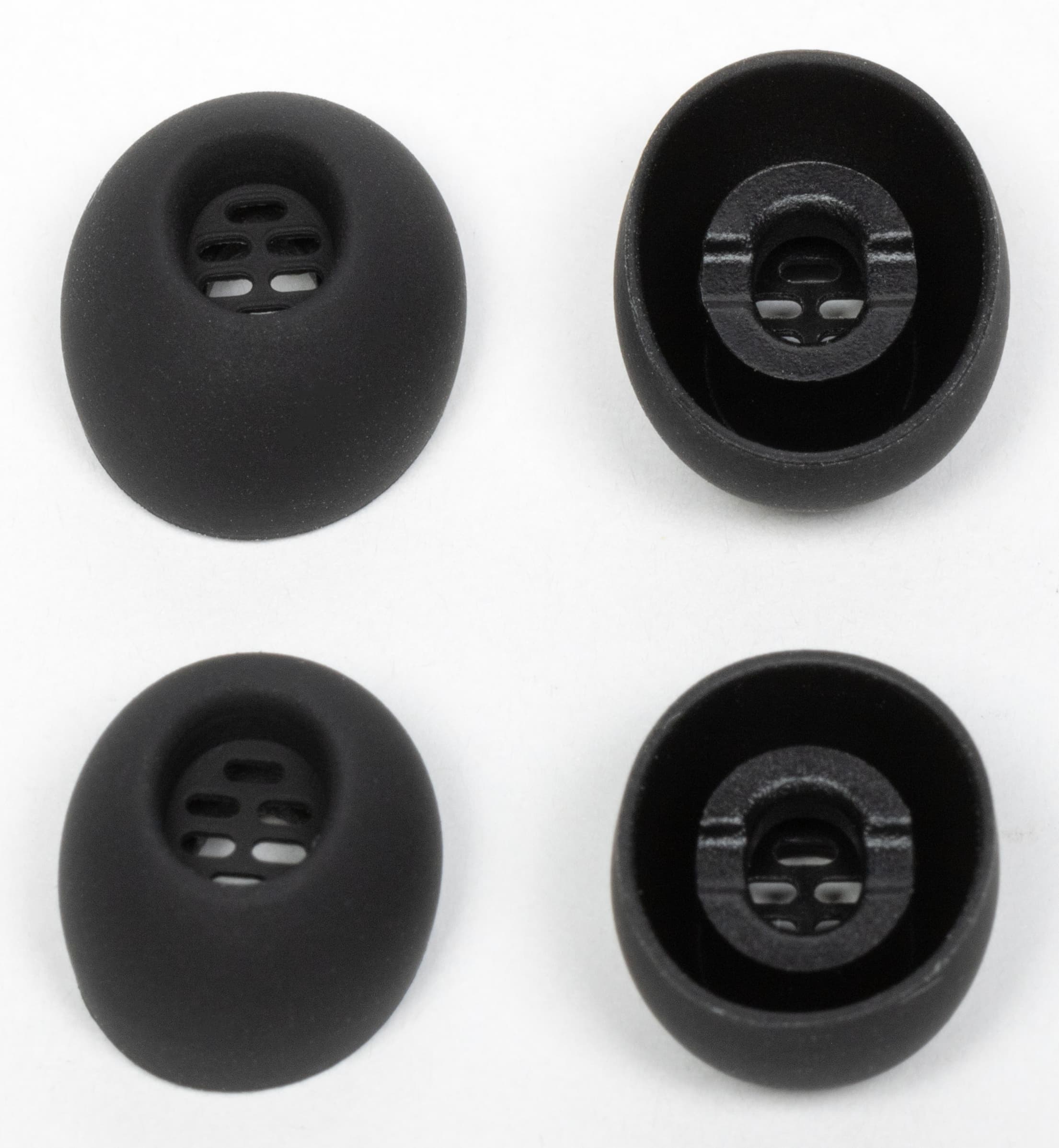 Насадки выполнены из мягкого и приятного на ощупь силикона, внутреннее отверстие прикрыто сеточкой, предотвращающей проникновение загрязнений в звуковод.