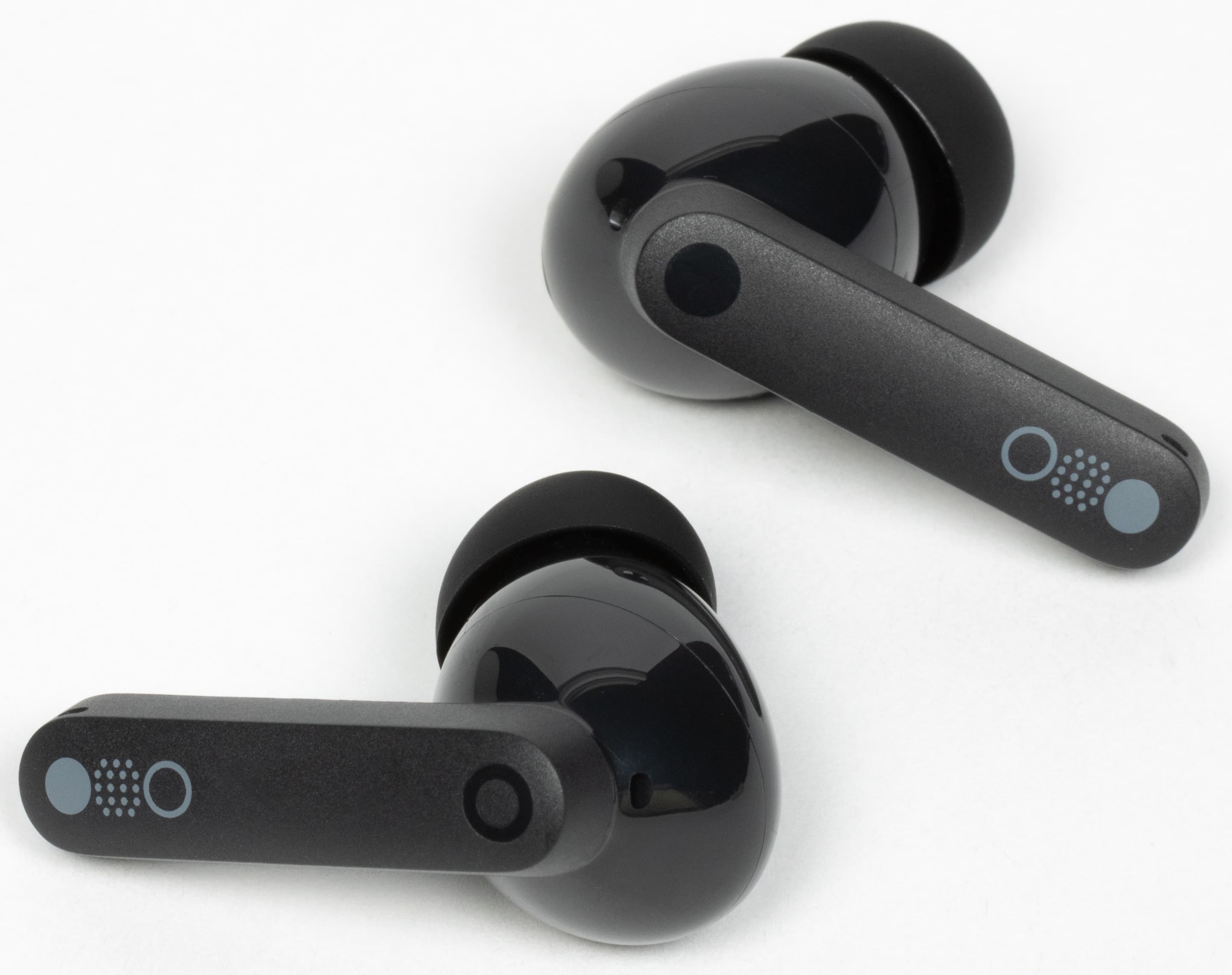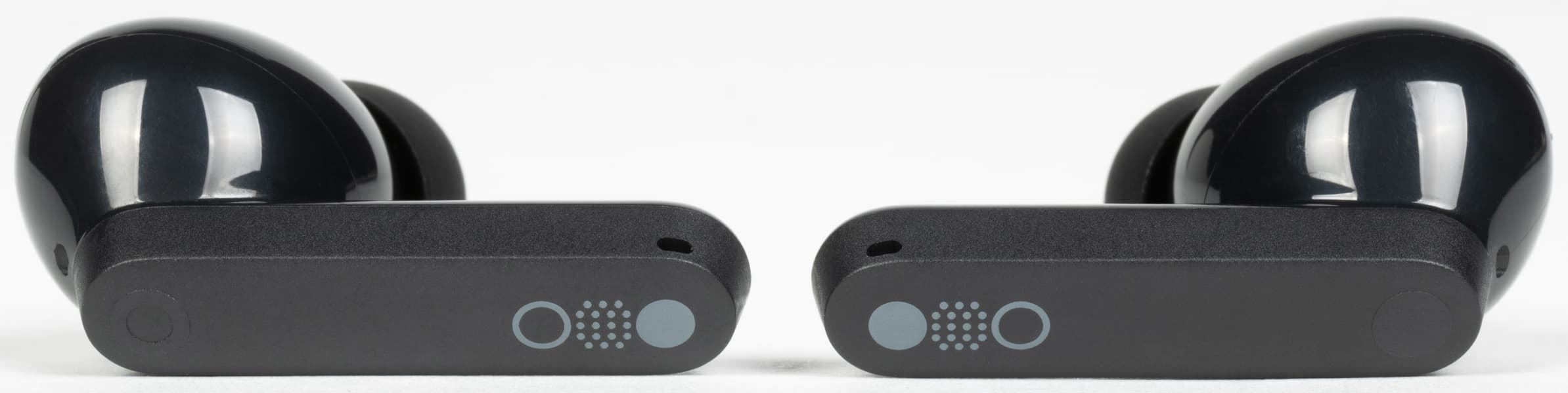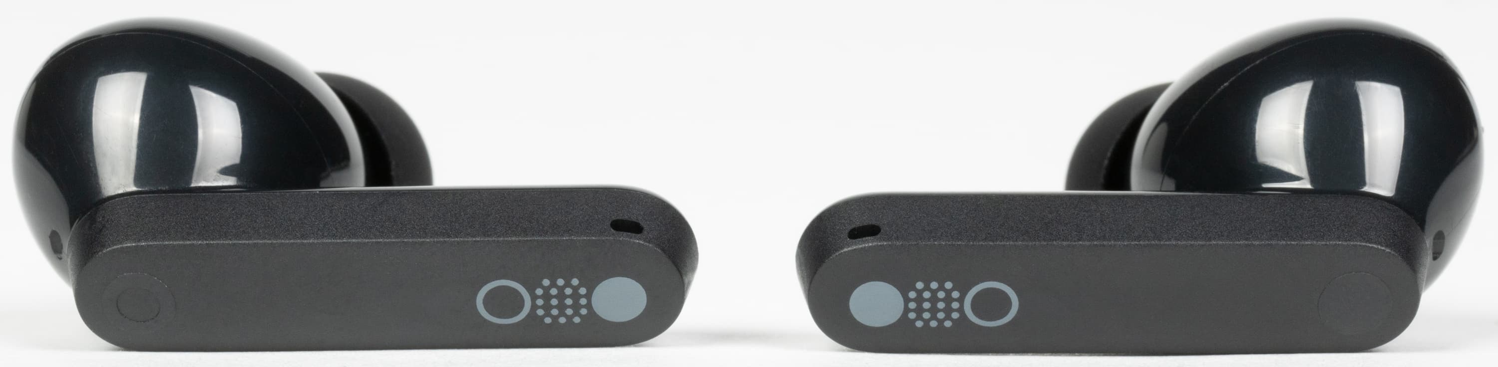 На внешнюю сторону «палочек» нанесен логотип производителя, а служащая для управления гарнитурой сенсорная зона выделена слегка выступающим над поверхностью округлым глянцевым элементом, который отлично определяется на ощупь.