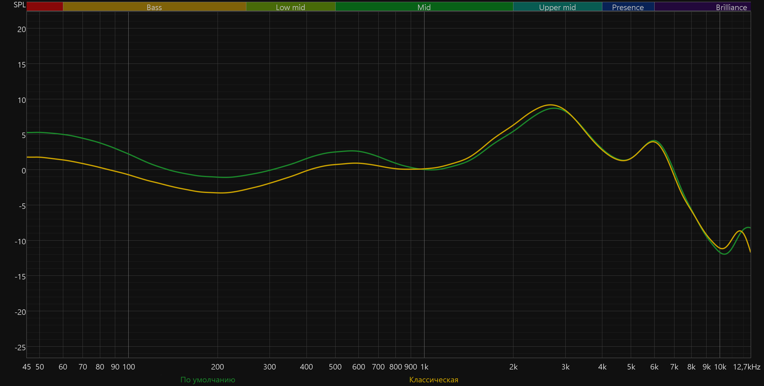 Средние частоты подаются немножко своеобразно — с выделенной нижней их частью, что немного подчеркивает вокал и повышает субъективно воспринимаемую «естественность» подачи музыкального материала. Высокие частоты очень хорошо уложены в общий тональный баланс — читаются, но при этом звучат не слишком резко и лишены характерных для них проблем. Традиционно проиллюстрируем сказанное с помощью графиков АЧХ. Начнем с того, что получен при использовании кодека LDAC.