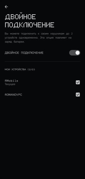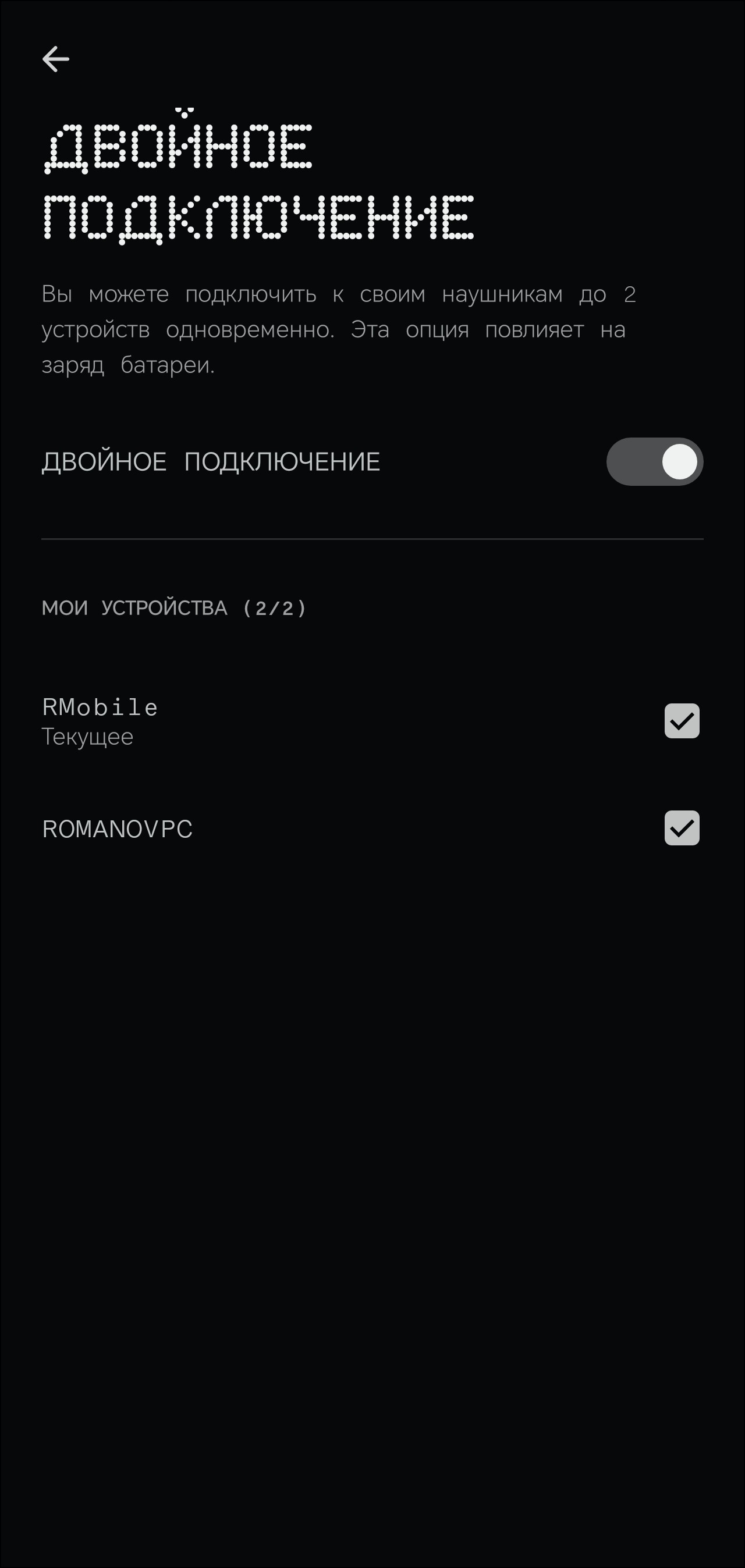 Датчики ношения работают корректно, но при необходимости их можно отключить. Режим малой задержки (он же игровой) мы обсудили чуть выше — работает, но не так эффективно, как хотелось бы. Поддержка LDAC по умолчанию отключена — если нужно, включаем. Устройство перезагружается, кодек активируется. То же самое и с мультипойнтом, оно же «двойное подключение». Все «знакомые» устройства добавляются в список, в котором всегда можно выбрать те два, к которым необходимо подключаться в данный момент — очень удобно, за подобную организацию мультипойнта мы неоднократно хвалили гарнитуры Huawei, наконец-то идея была подхвачена еще одним производителем.