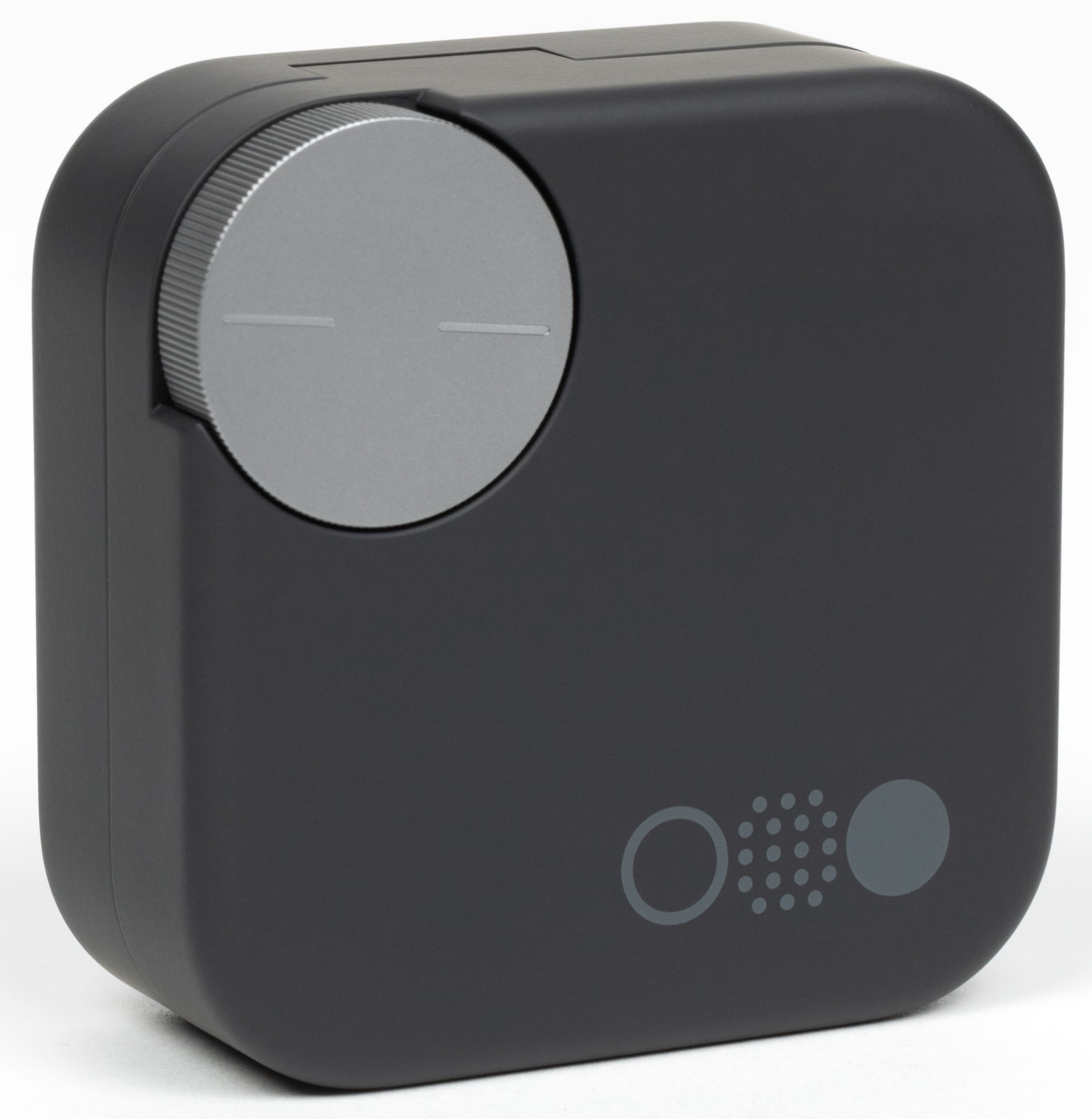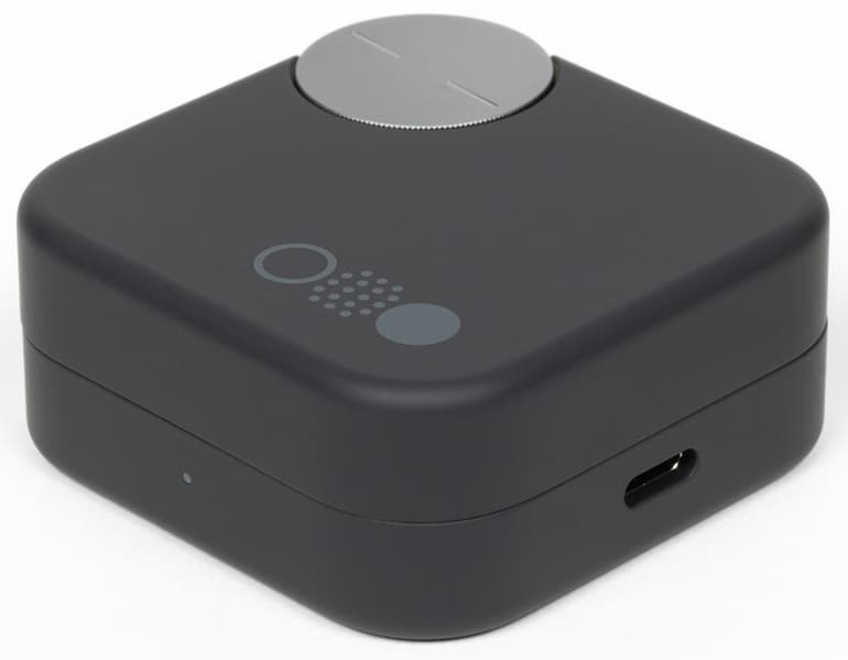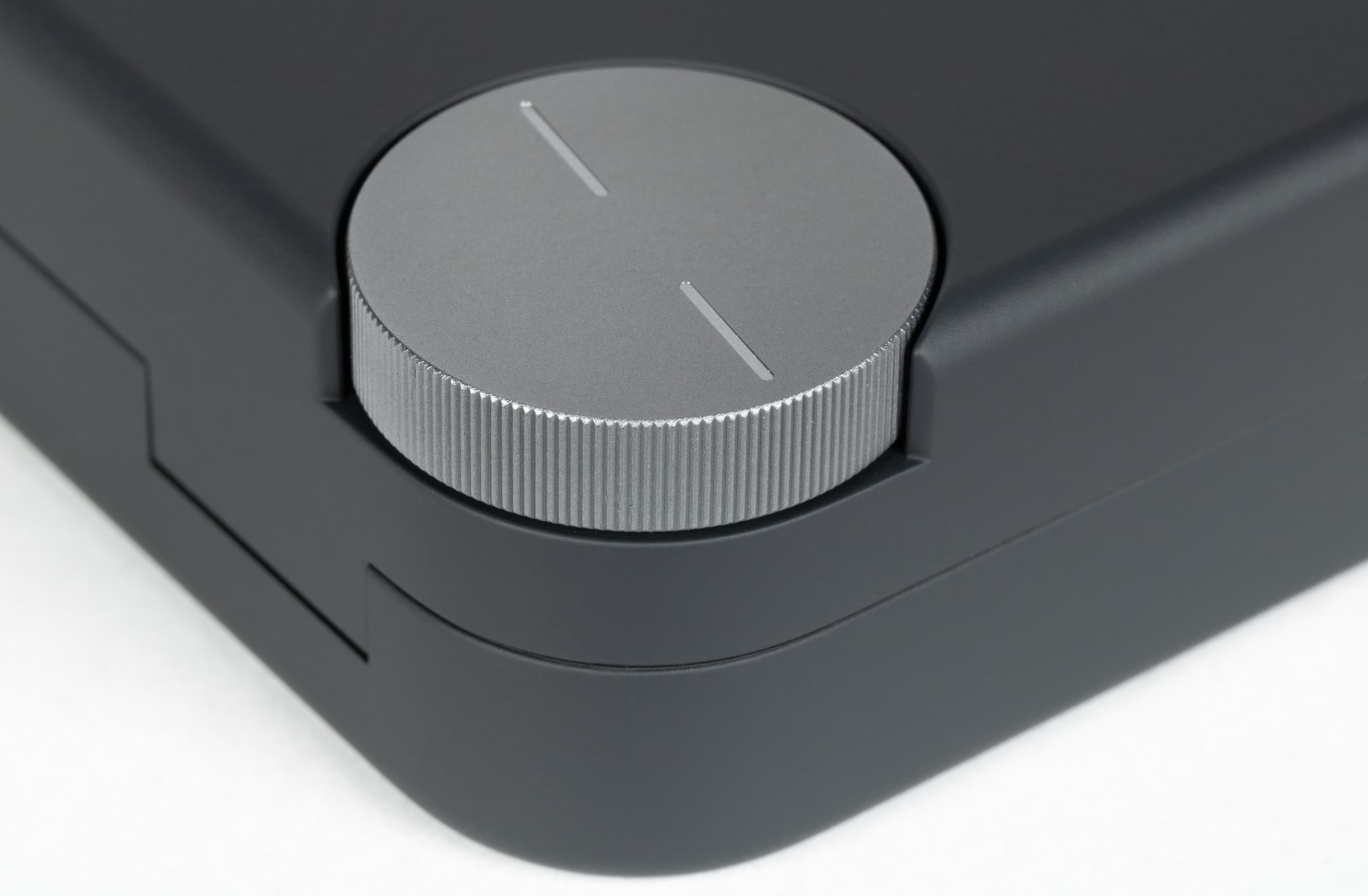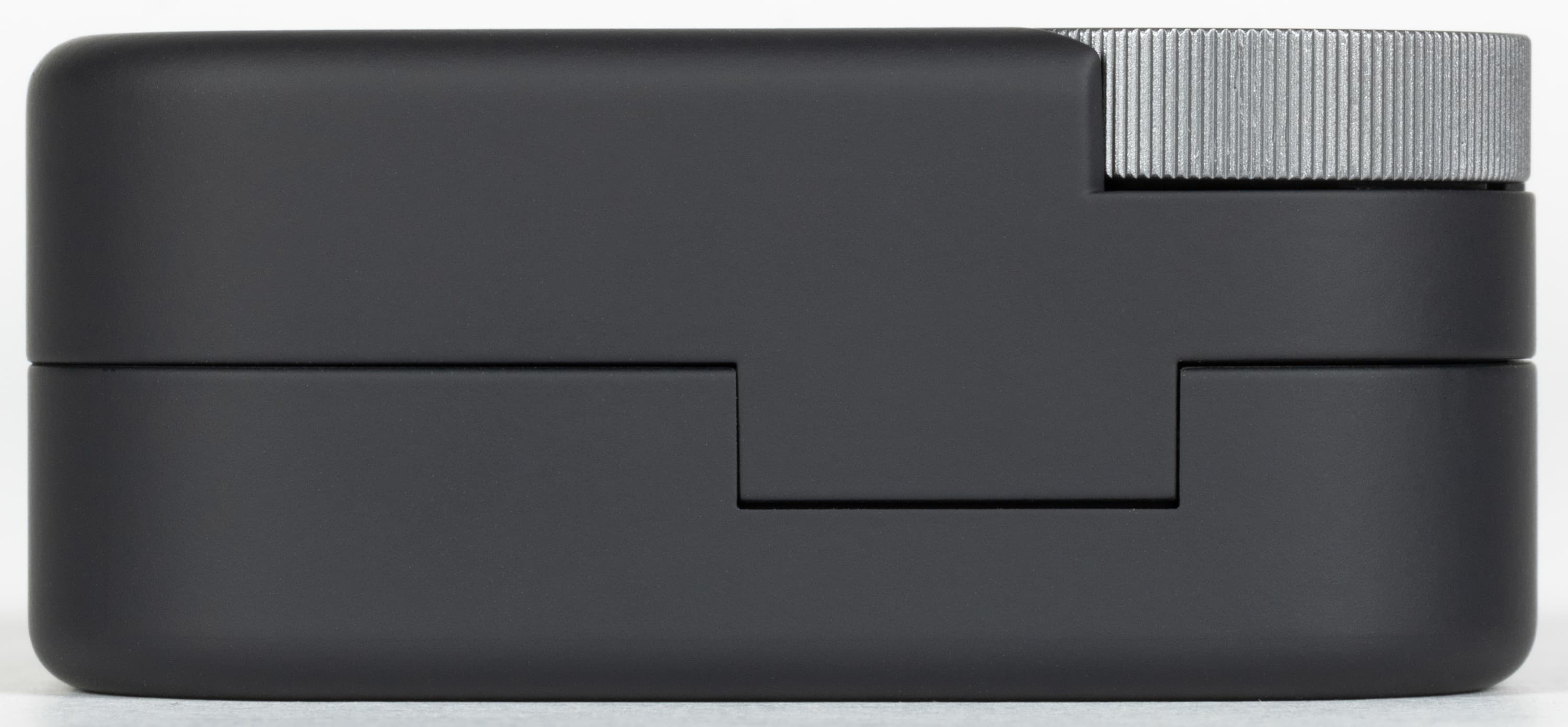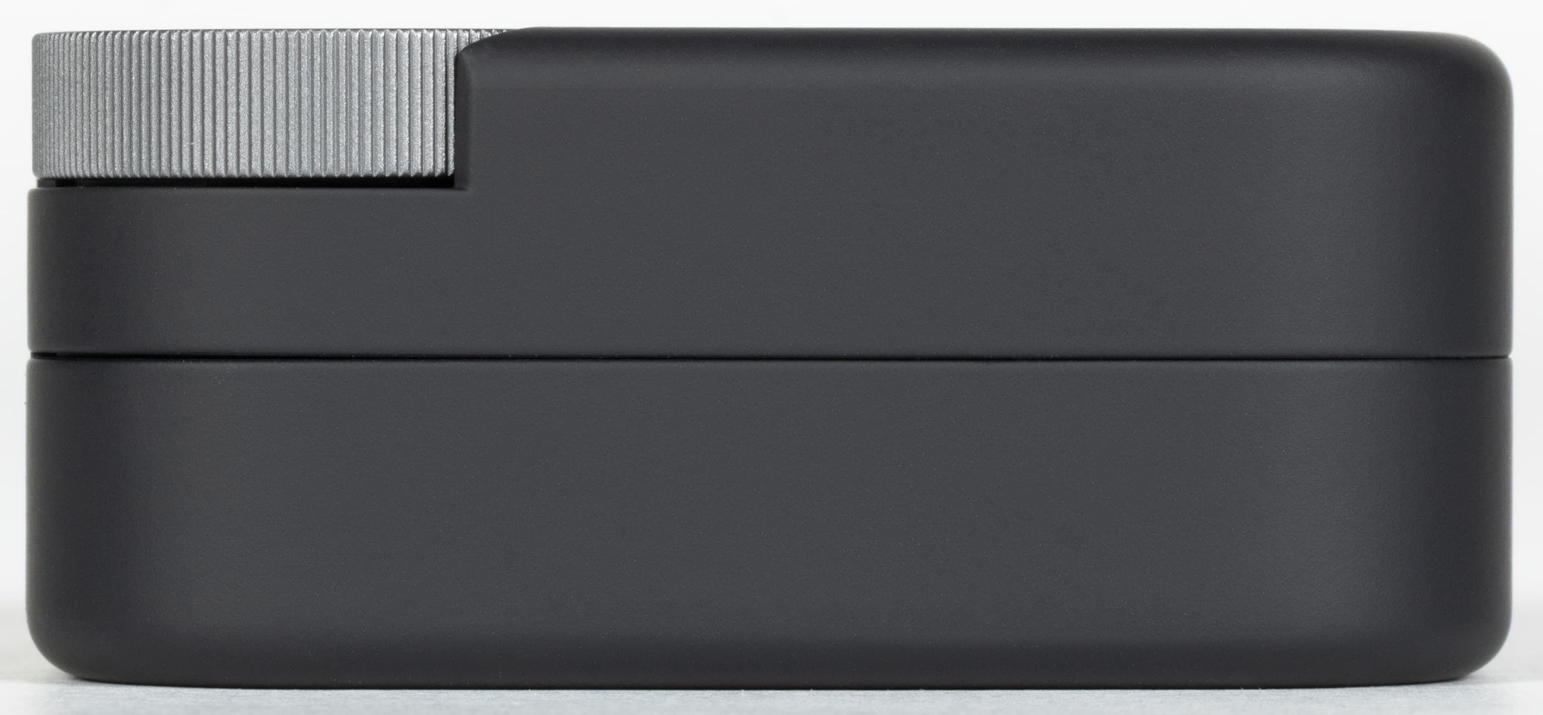 Кейс выполнен из крайне приятного на ощупь матового пластика с покрытием софт-тач. Следы от прикосновений на нем остаются, но не слишком активно. В правом ближнем углу верхней панели нанесен логотип производителя, который не привлекает лишнего внимания и не нарушает общей строгости дизайна. Самый же заметный элемент здесь — это, конечно, металлическая «крутилка», которую мы сегодня еще многократно обсудим.