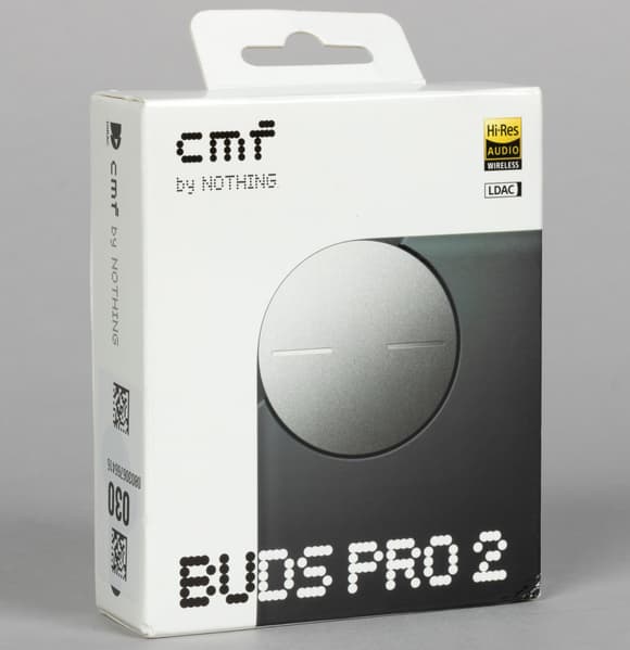 Поставляются CMF Buds Pro 2 в белой коробке из тонкого картона, на которую нанесены изображения устройства и его краткие характеристики. В правом верхнем углу красуются значки, напоминающие о наличии у наушников сертификации Hi-Res и поддержки кодека LDAC.