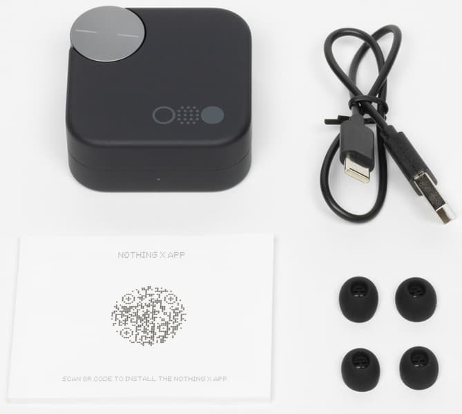 В комплект поставки входят сами наушники, зарядный кейс, документация, две пары сменных силиконовых насадок (еще одна установлена по умолчанию), а также кабель для зарядки. Кабель в очередной раз положен «для галочки» — он короткий (30 см), тонкий и в целом довольно хлипкий. При взгляде на него начинает казаться, что отказ целого ряда производителей от кабеля в комплекте — не самая плохая идея.