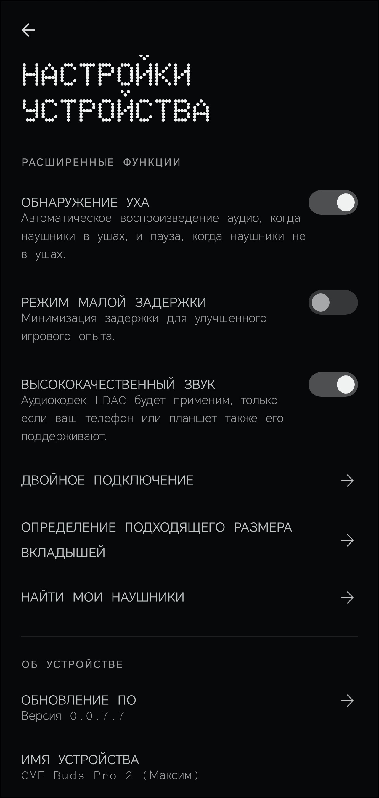 Кроме того, у «шумодава» CMF Buds Pro 2 есть странный нюанс: при активации самого агрессивного варианта его работы в наушниках отчетливо слышен свистящий шум. Он легко маскируется звучащей на среднем уровне громкости музыкой, но где-нибудь в самолете, когда хочется подремать в тишине с тихой или вообще выключенной музыкой, эта особенность будет крайне некстати. Плюс в максимальном режиме очень быстро возникает знакомое многим пользователям чувство «давления в голове», так что лучше сразу ориентироваться на более комфортный средний режим шумоподавления.