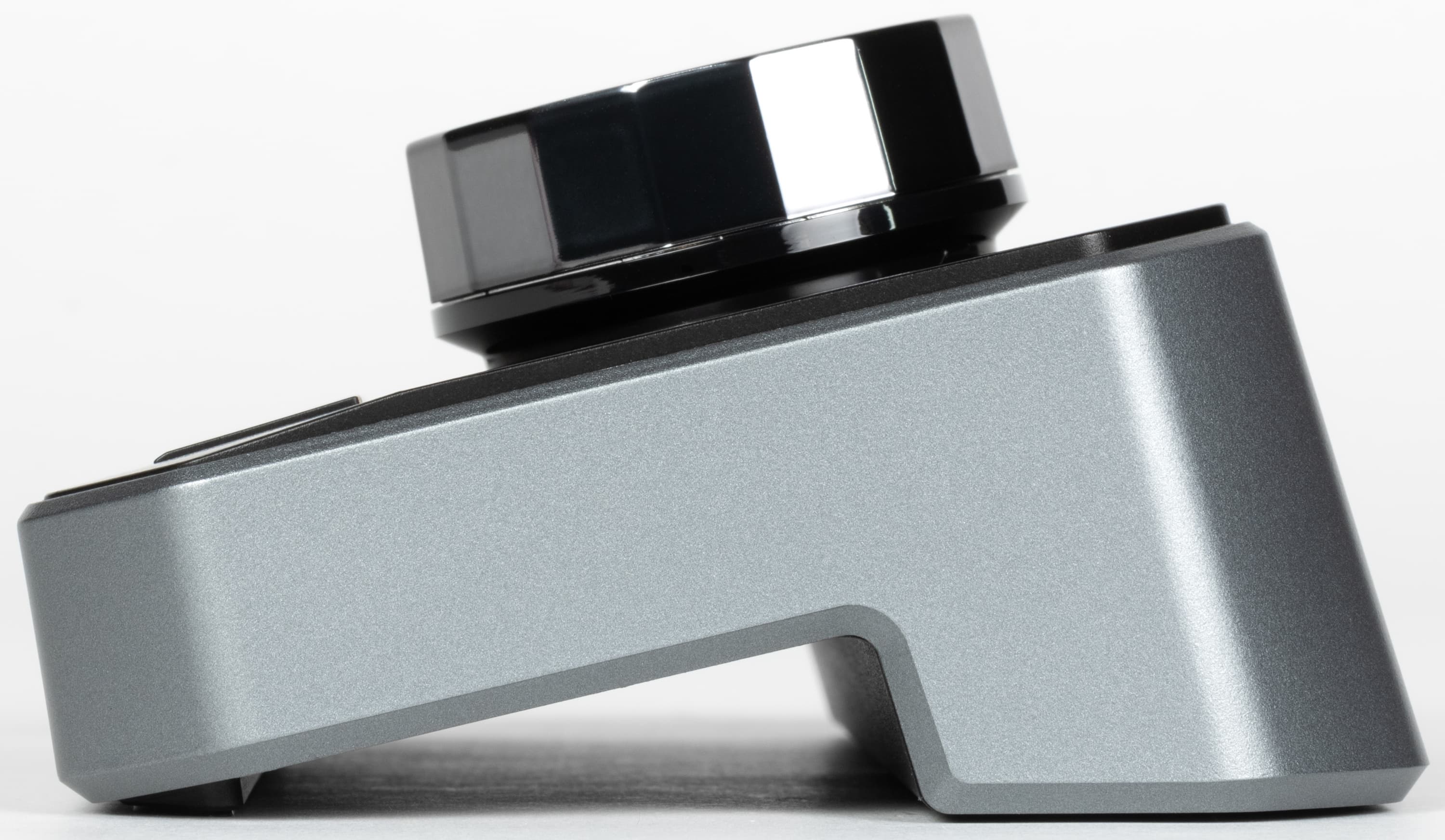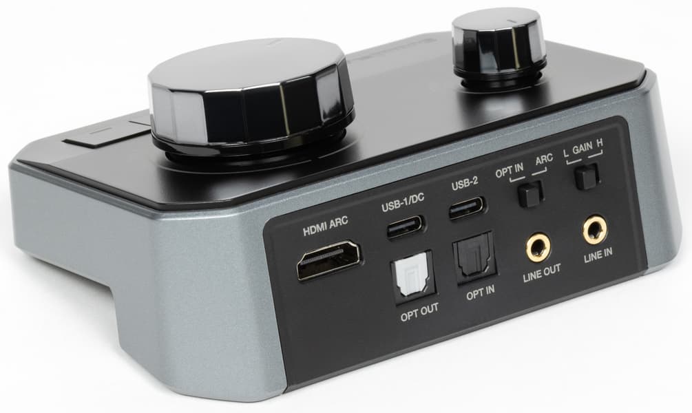 Массивный выступ в задней части корпуса обеспечивает наклон, дающий возможность комфортно взаимодействовать с поворотными регуляторами и кнопками при установке звуковой карты на столе.