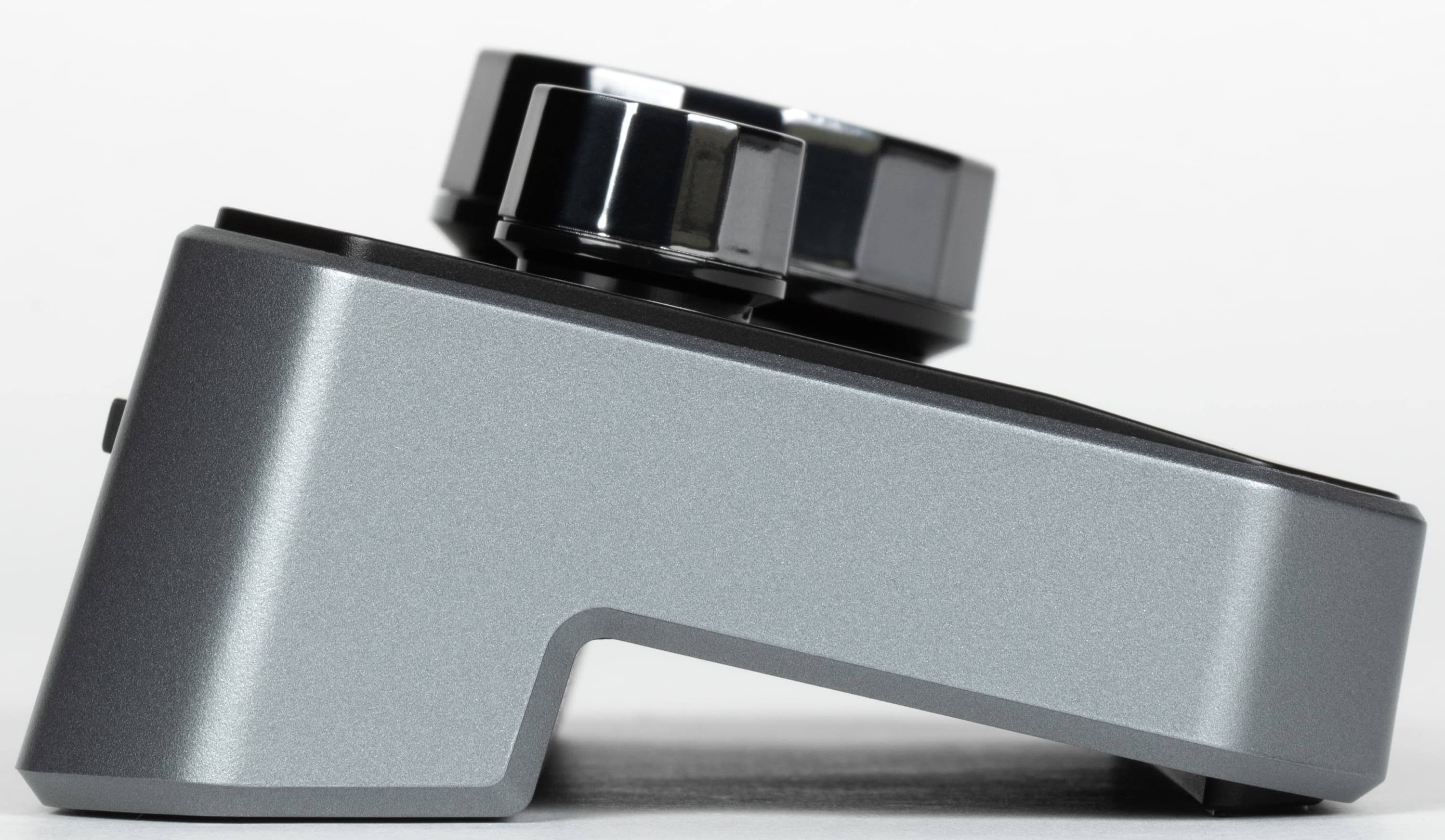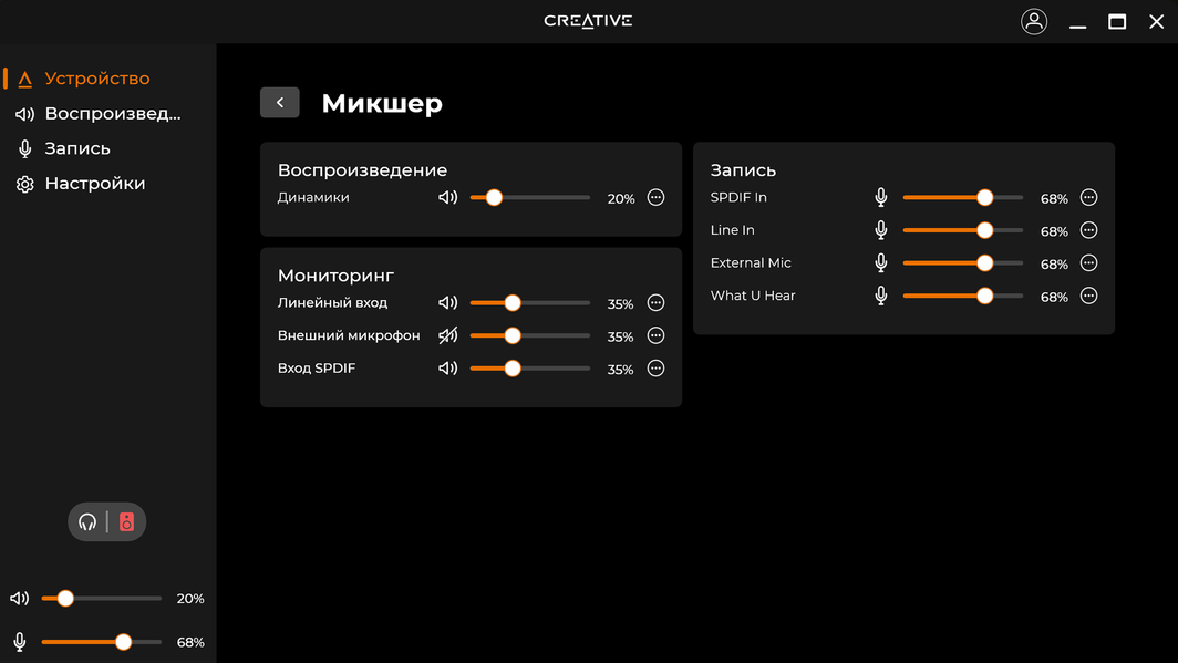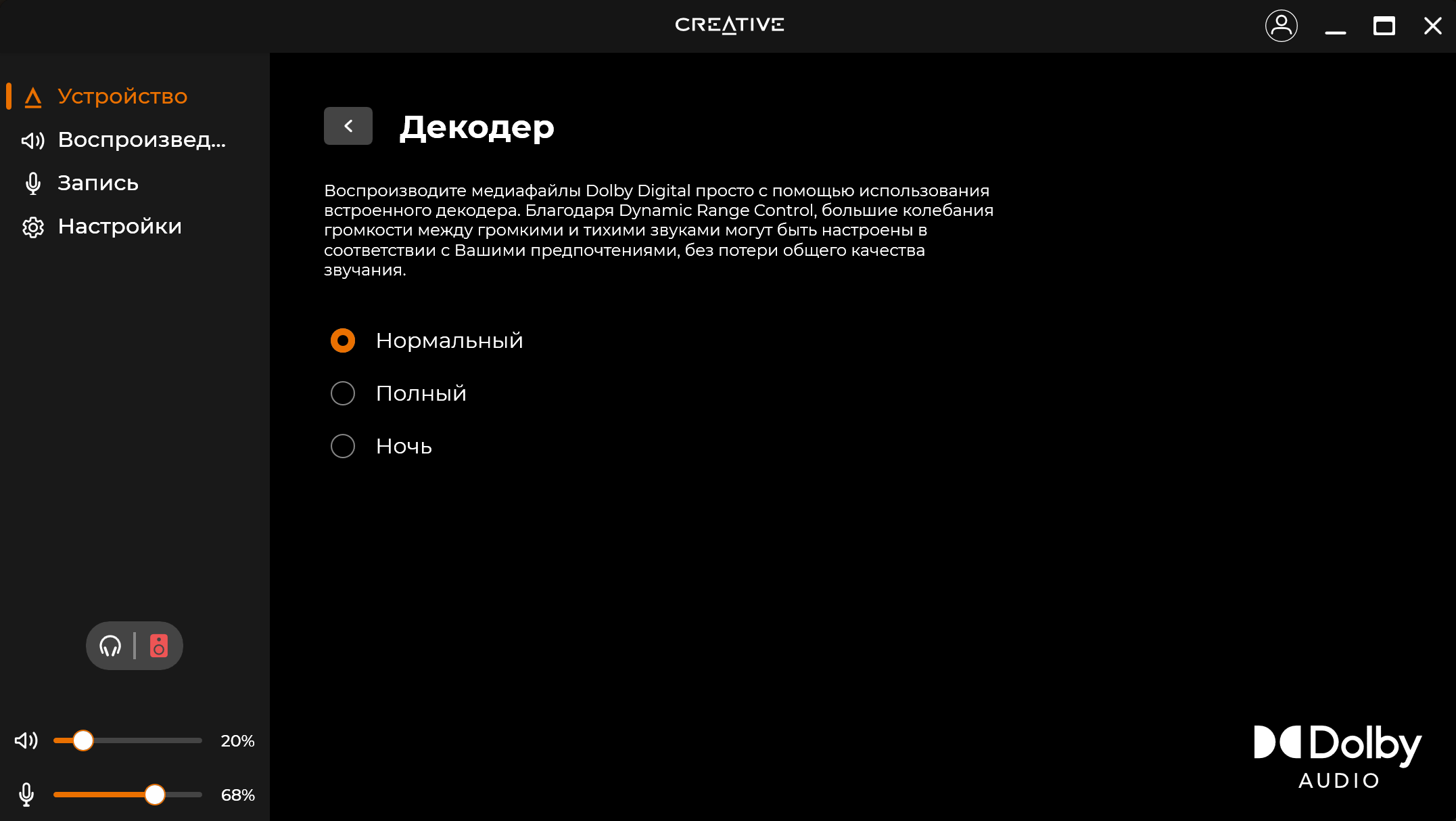 Правее мы видим крупную ручку регулятора громкости — потенциометра с ограничением угла вращения. Работает он не менее мягко и приятно. Громкость можно также изменять из приложения Creative App, передвигая соответствующий «ползунок». Если после этого вновь воспользоваться ручкой на панели управления — его положение сразу «прыгает» на соответствующее значение.