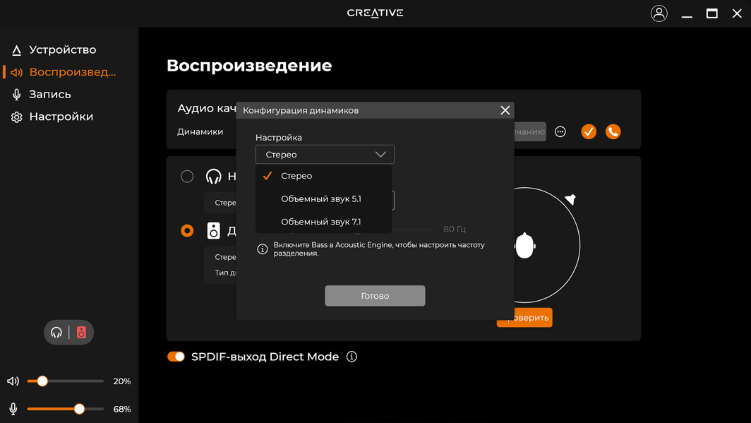 Доступно два режима «виртуального объемного звука», про который мы уже говорили — попробовать можно, но на «вау-эффект» сильно рассчитывать не стоит. Хотя в играх иногда бывает довольно интересно: мы с удовольствием немного побегали в Assassin’s Creed Valhalla в «многоканальном» режиме, но потом всё же вернулись в старый добрый Direct Mode.