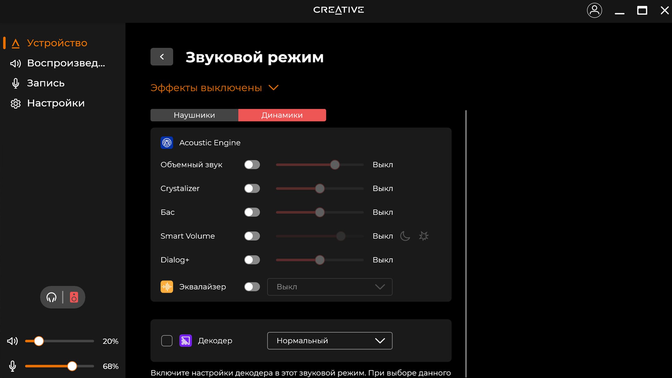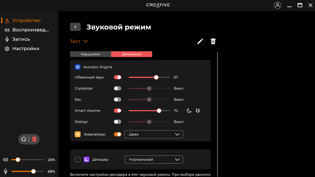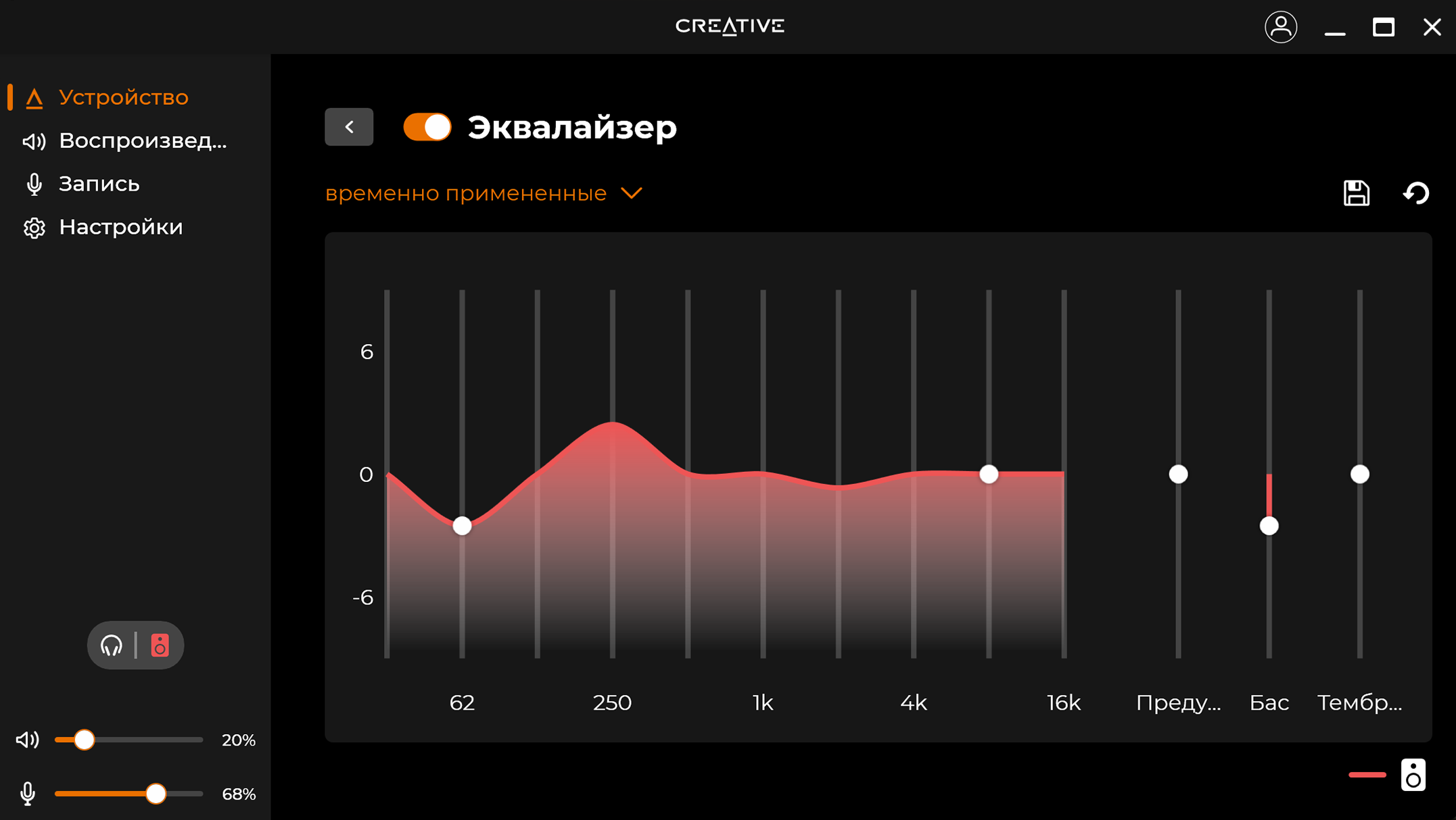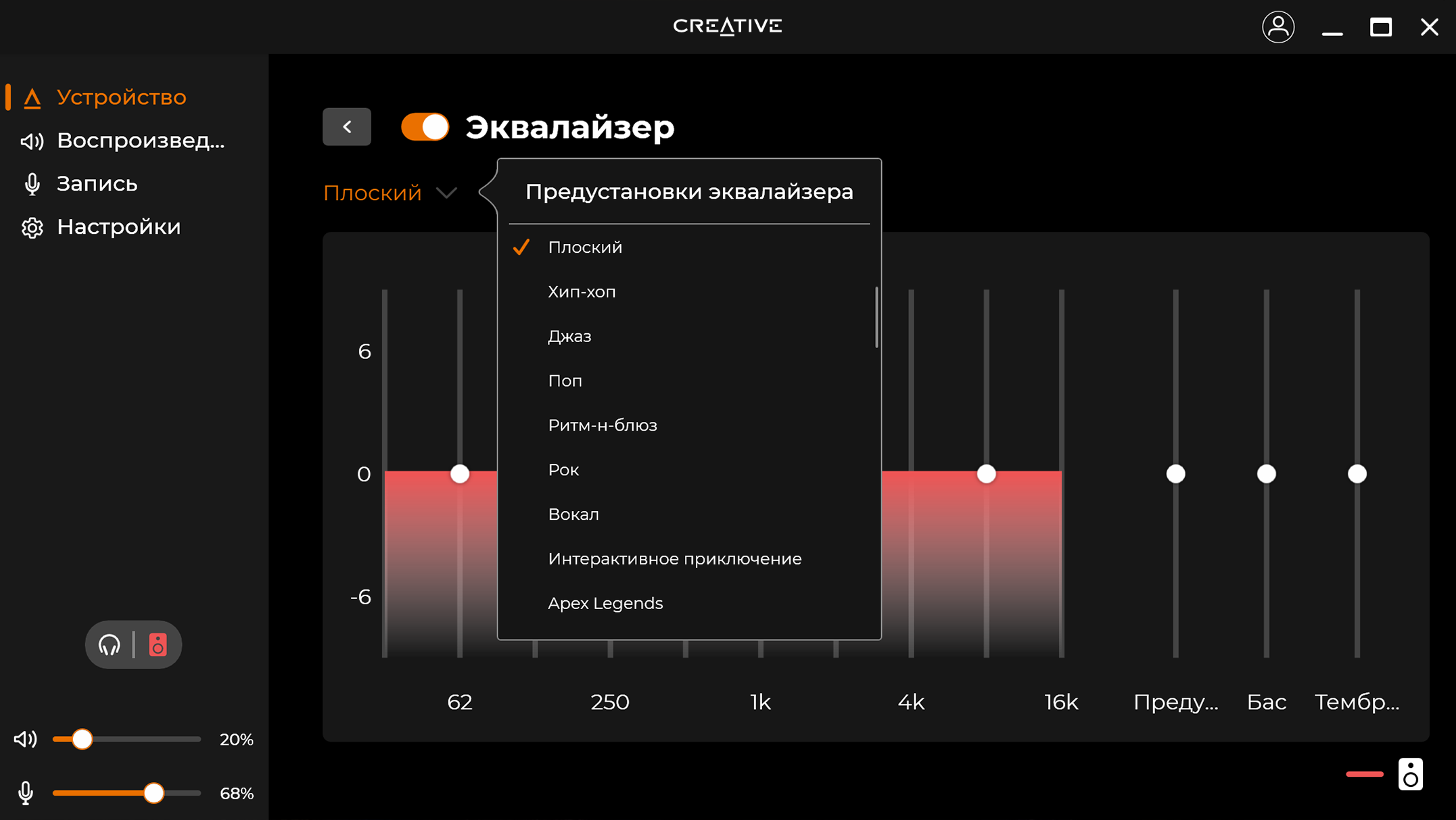 С помощью ПО Creative App пользователи могут получить доступ к огромному количеству настроек звучания устройства: от полноценного 10-полосного эквалайзера со множеством готовых пресетов (в том числе — под ряд популярных игр) до режима Scout Mode, в котором устройство усиливает критически важные звуковые сигналы в играх, такие как шаги. Для микрофонов тоже предусмотрен целый ряд настроек, включая систему шумоподавления и собственный эквалайзер. Так что стримерам и создателям контента есть на что посмотреть. Стоит заметить, что у «аудиофильской» Sound Blaster X5 эти возможности также доступны — производитель не стал ограничивать использование «игровых» функций в «неигровом» устройстве, за что ему отдельный респект.