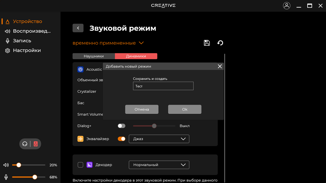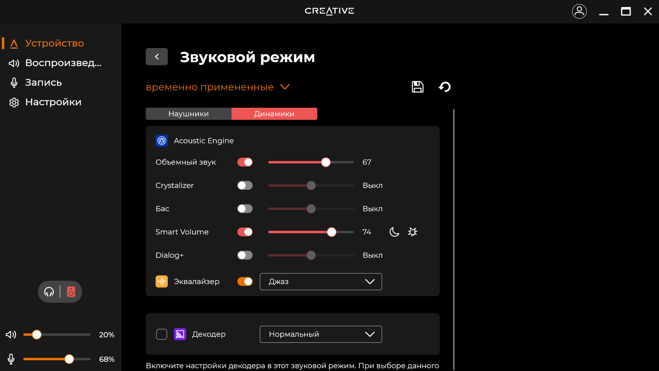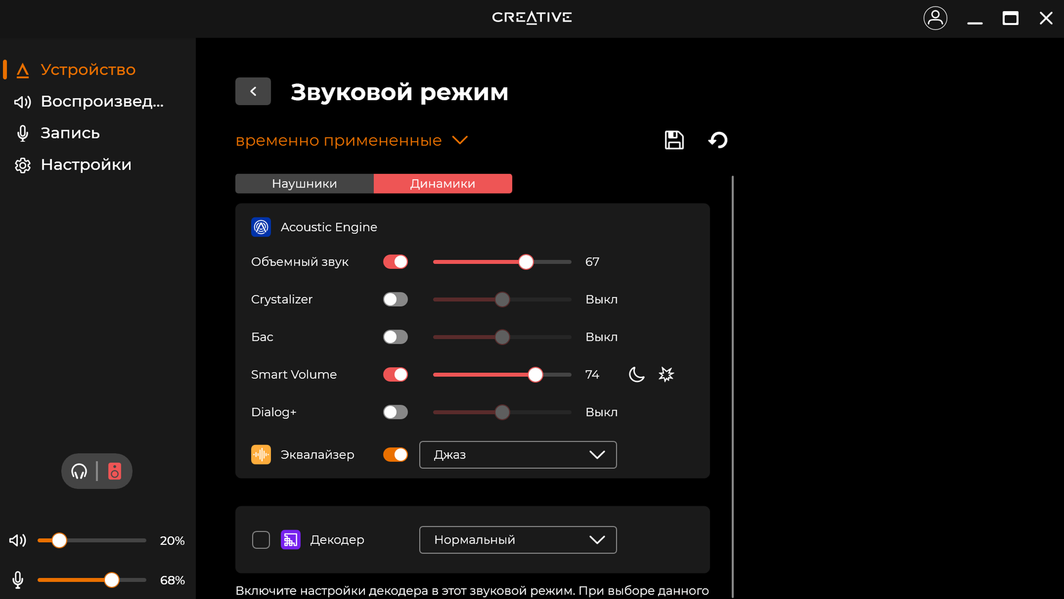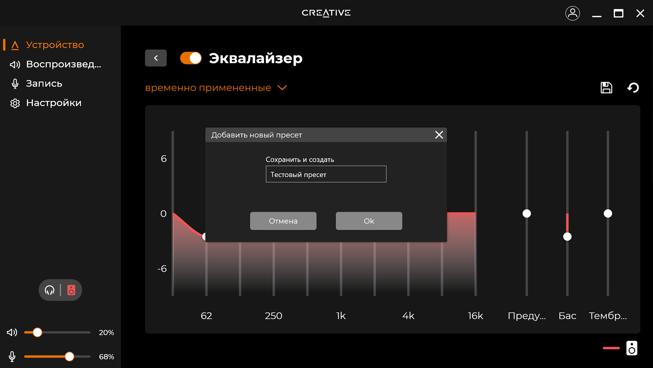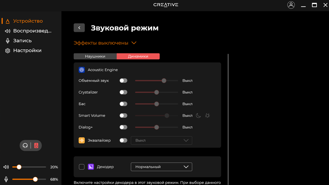 С помощью ПО Creative App пользователи могут получить доступ к огромному количеству настроек звучания устройства: от полноценного 10-полосного эквалайзера со множеством готовых пресетов (в том числе — под ряд популярных игр) до режима Scout Mode, в котором устройство усиливает критически важные звуковые сигналы в играх, такие как шаги. Для микрофонов тоже предусмотрен целый ряд настроек, включая систему шумоподавления и собственный эквалайзер. Так что стримерам и создателям контента есть на что посмотреть. Стоит заметить, что у «аудиофильской» Sound Blaster X5 эти возможности также доступны — производитель не стал ограничивать использование «игровых» функций в «неигровом» устройстве, за что ему отдельный респект.