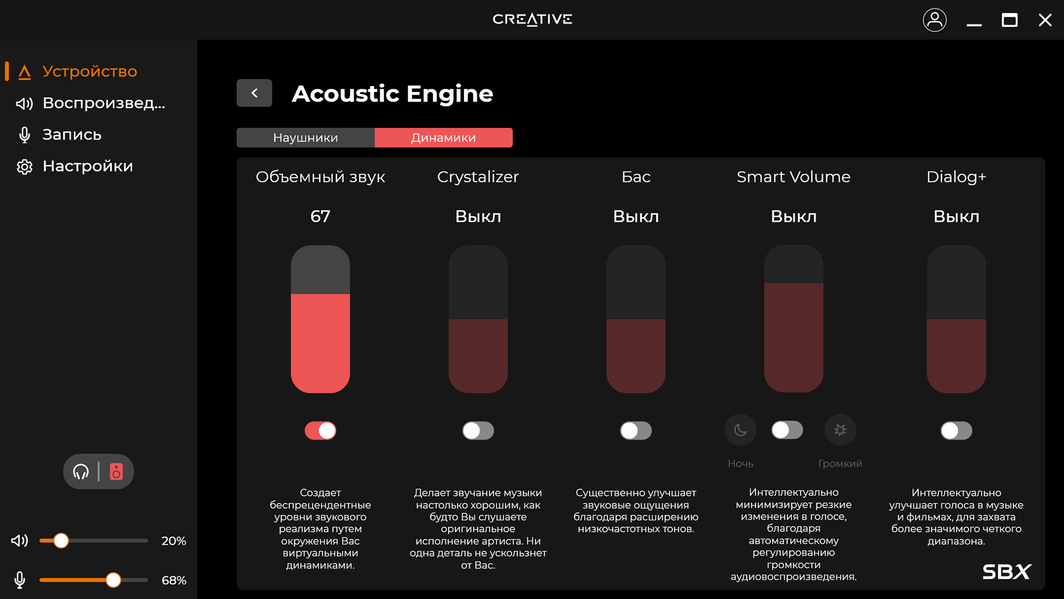 - SBX отвечает за быструю активацию последнего из выбранных в приложении «звуковых режимов» — комплектов настроек всех доступных параметров, в том числе созданных пользователем самостоятельно