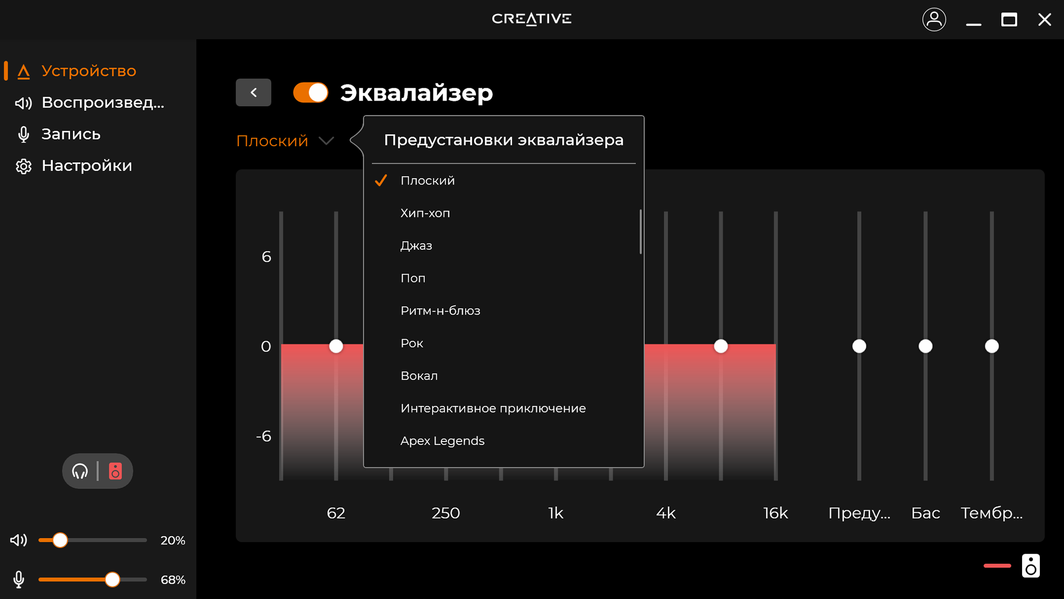 Есть в приложении и полноценный 10-полосный эквалайзер, на работу которого мы еще посмотрим чуть ниже. Предустановок вновь множество, в том числе — под популярные игры.
