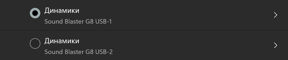 Конечно, реализуемо это всё и просто с помощью виртуального микшера операционной системы, но так гораздо удобнее. Появляется возможность управлять воспроизведением с экрана смартфона, а соотношением громкости с двух источников — с помощью «крутилки» Game/Voice на верхней панели звуковой карты. Ну и, конечно, никто не мешает подключить оба разъема к одному ПК, например. Sound Blaster G8 определяется как два отдельных устройства, которые можно выбрать для обработки звука в разных приложениях, самый очевидный вариант — игра и какой-нибудь мессенджер.