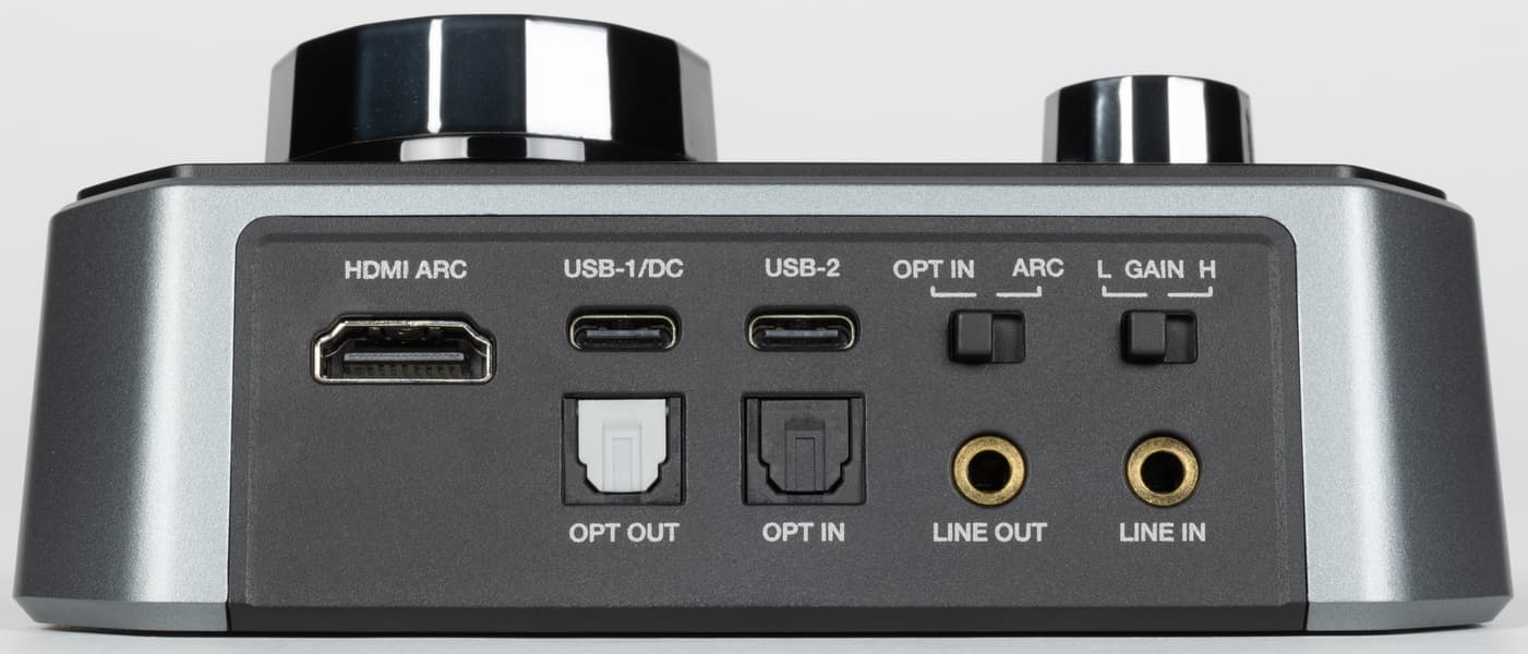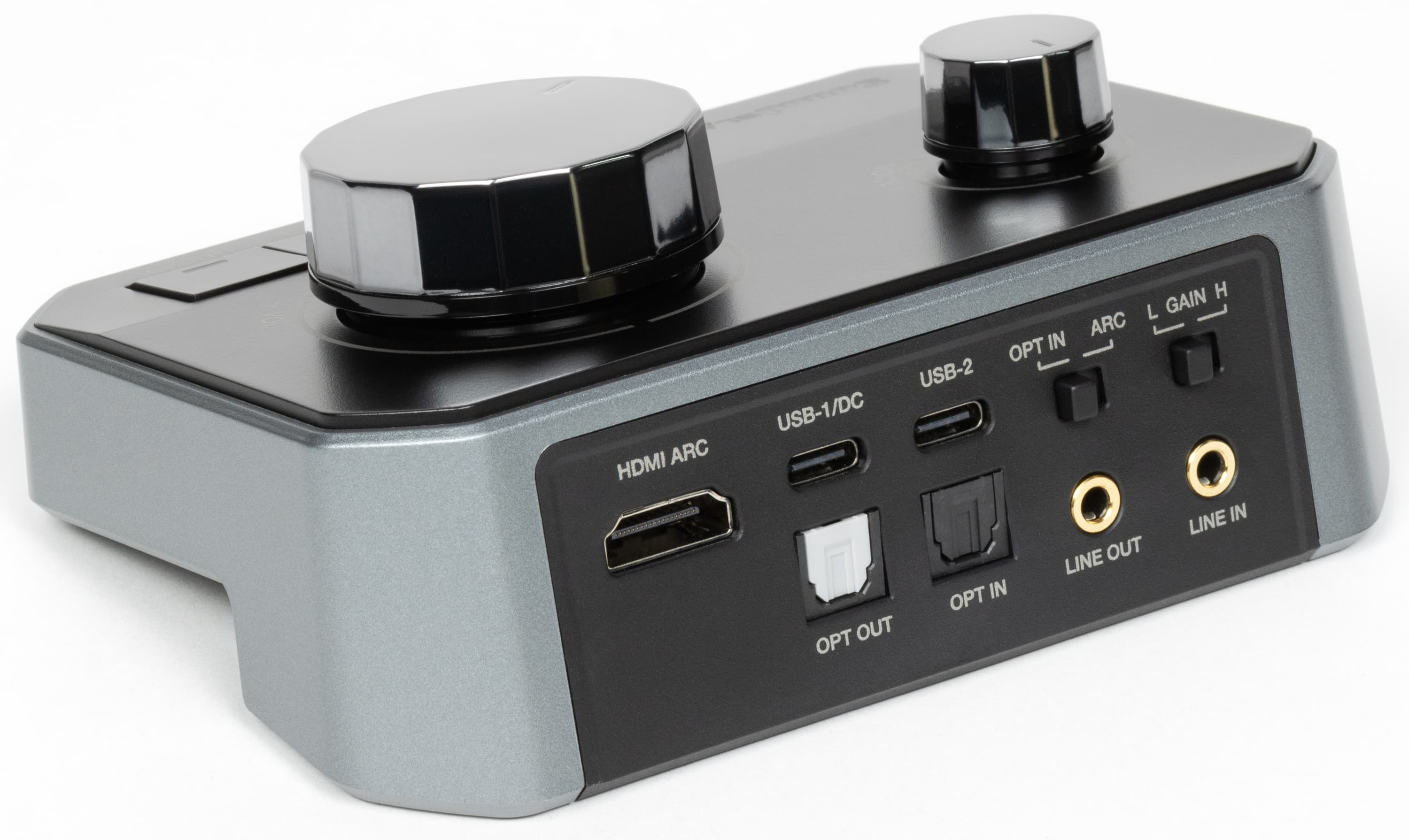 Для этого в Sound Blaster G8 предусмотрены два порта USB-C, вход и выход S/PDIF (оптические), линейные вход и выход на миниджеках 3,5 мм и даже HDMI Arc вкупе с декодером Dolby Digital. Плюс, конечно, разъемы для подключения микрофона и гарнитуры/наушников. Никуда не делись и ключевые достоинства всей линейки: поддержка разрешения вплоть до 32 бит/384 кГц, фирменный дискретный двухканальный усилитель наушников Xamp и возможность подключения наушников с диапазоном сопротивления от 16 до 600 Ом.