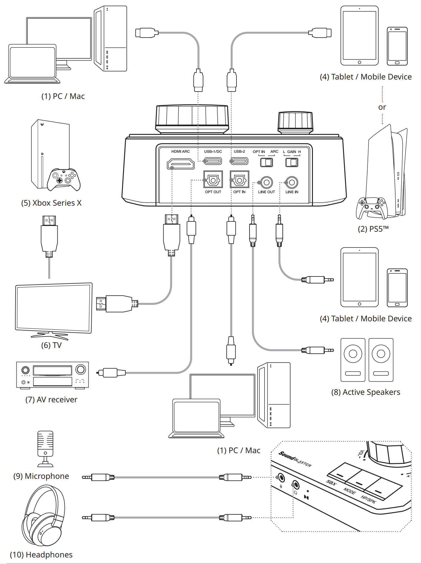 Как уже говорилось выше, подключить к Creative Sound Blaster G8 можно всё что угодно — от смартфона до телевизора. Позаимствуем из инструкции к устройству иллюстрацию, где наглядно показаны все основные способы подключения.