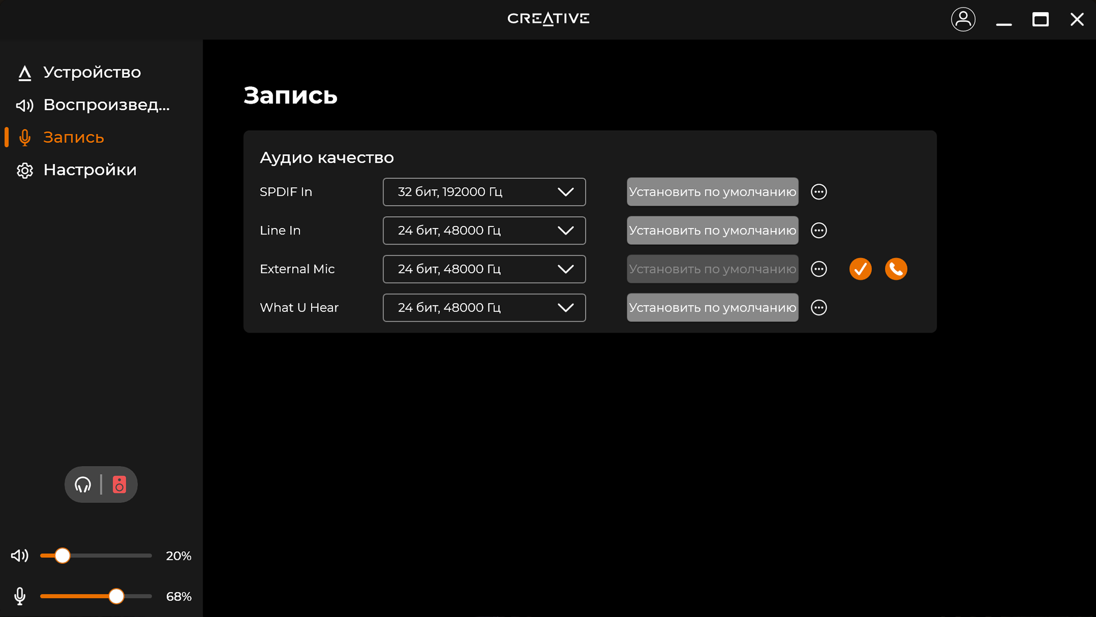 Частоту дискретизации и разрядность записи также можно выбрать, причем для каждого входа отдельно. Плюс сразу видно, какой из входов установлен по умолчанию в качестве основного и для связи.