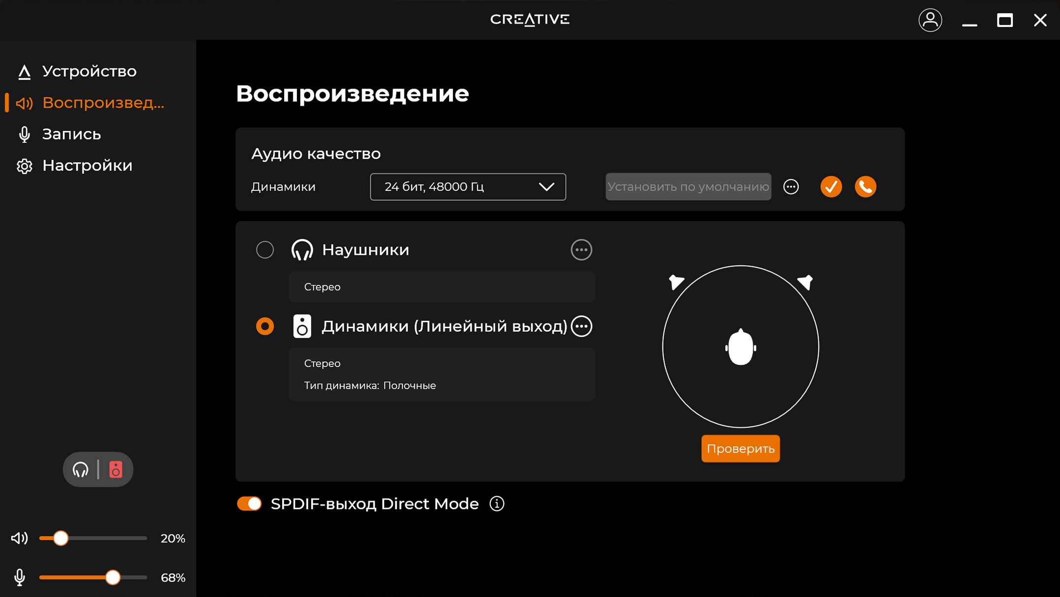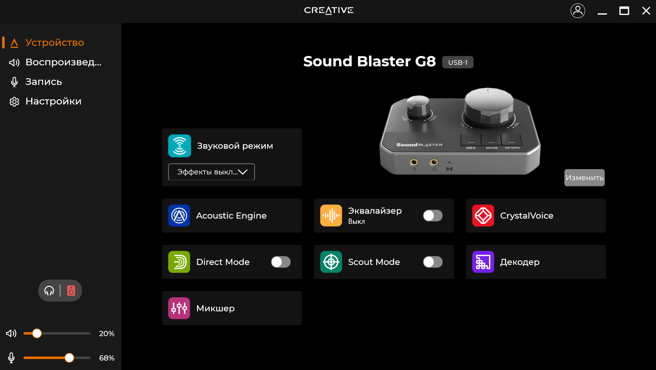 Переходим на главный экран. В колонке слева доступны основное меню, выбор наушников или акустики, а также регуляторы громкости. По центру расположены модули выбора различных опций. Сразу скажем про режим Direct Mode — в нем звук никак дополнительно не обрабатывается, соответственно — карта показывает максимум из того, на что способна именно в плане качества звучания. Игнорировать его наличие совершенно точно не стоит. При этом нужно понимать, что дополнительные входы и возможность перемещения между каналами Game/Voice тоже будут недоступны.