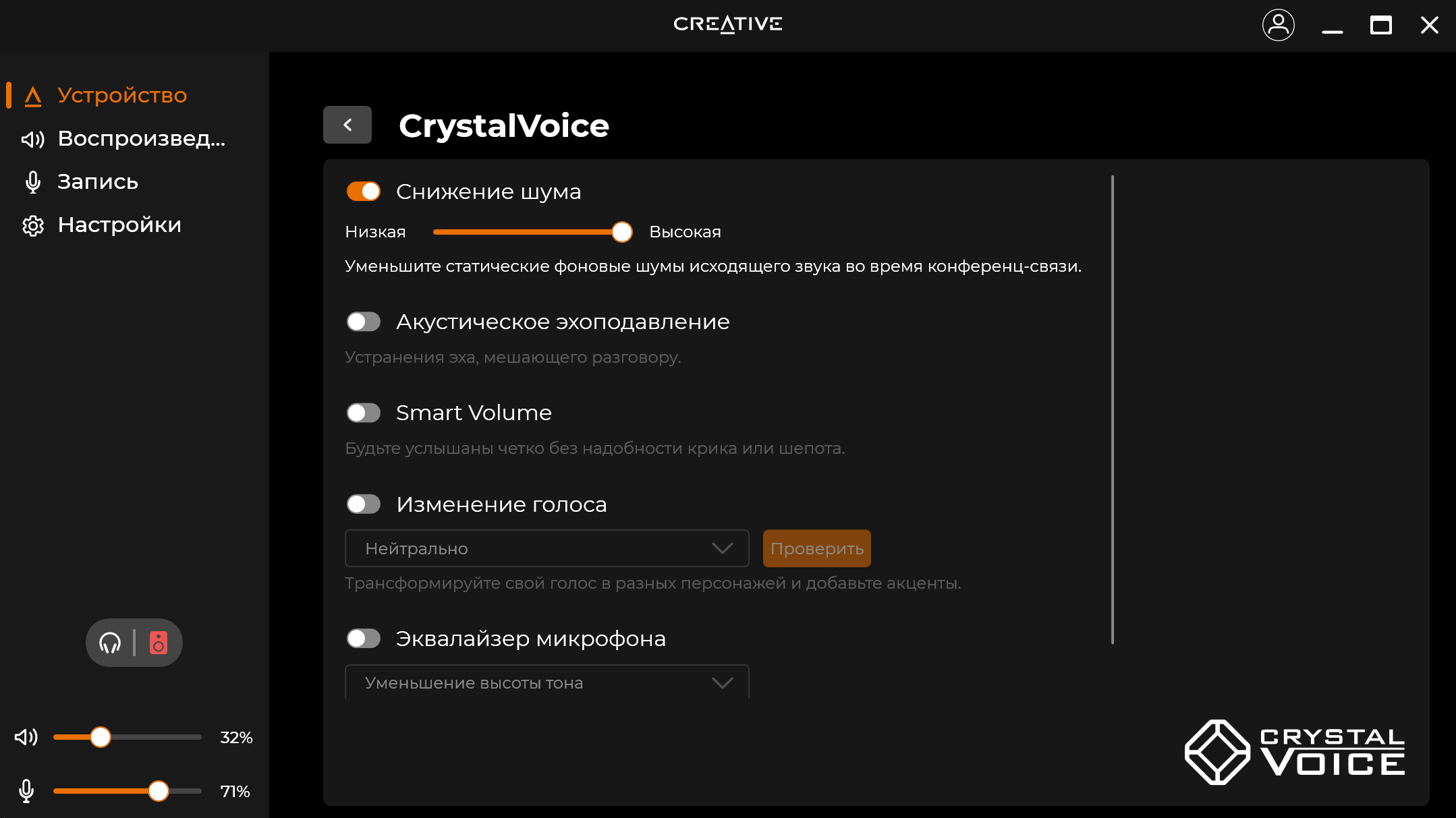 Ну и раз начали про микрофон — про него и продолжим. У него есть своя вкладка в ПО, где представлен полный набор различных опций: шумоподавление, устранение эхо, компрессор, эквалайзер и функция изменения голоса — уже давно не вызывающая удивления, но по-прежнему забавная игрушка. Всё вместе это называется CrystalVoice Technology.
