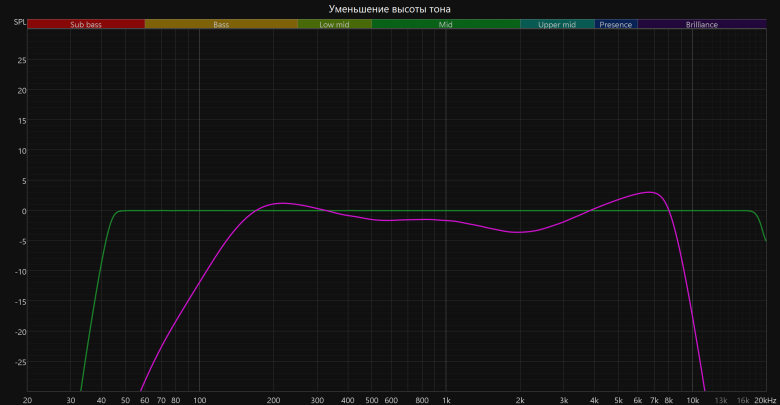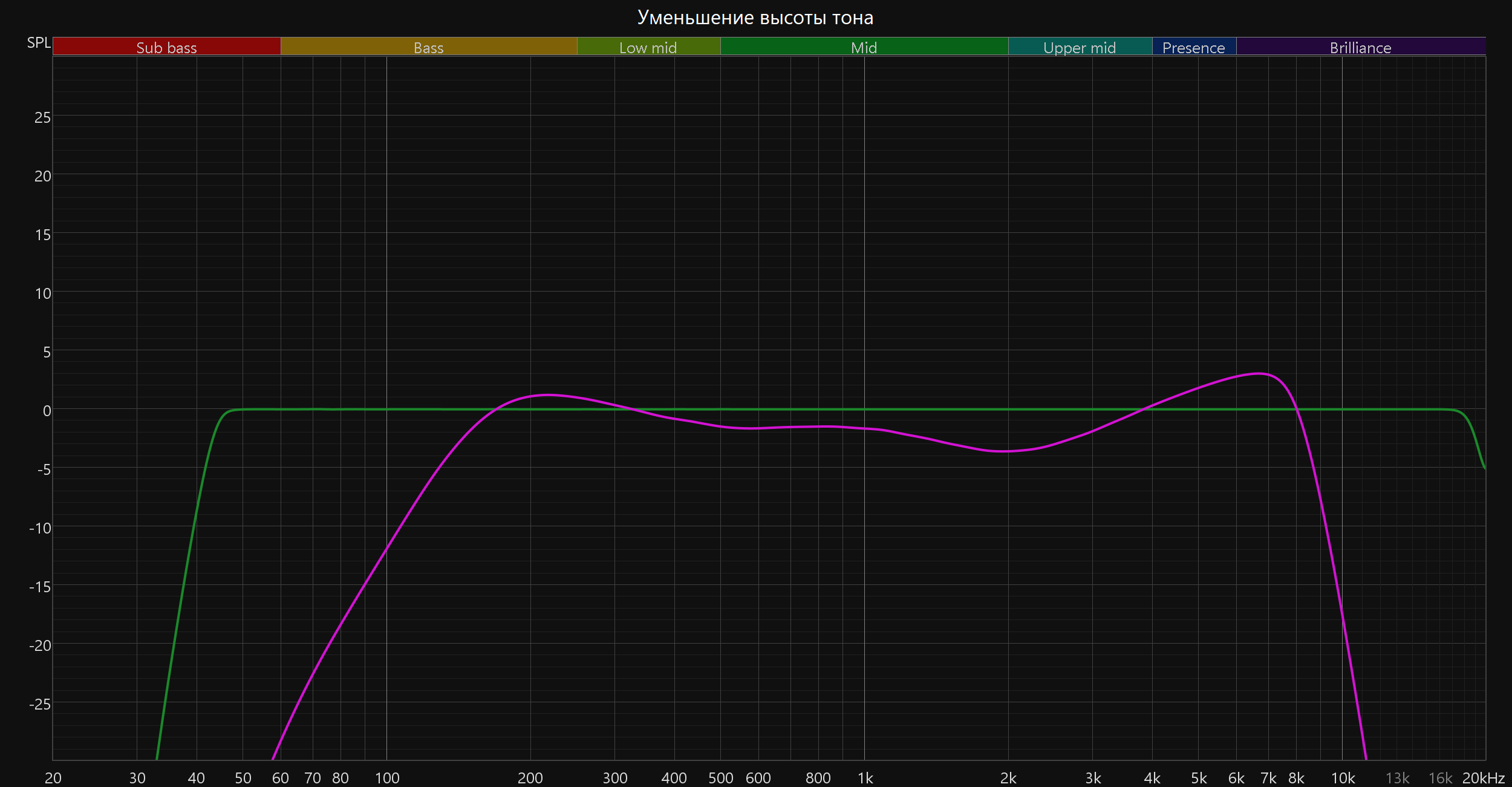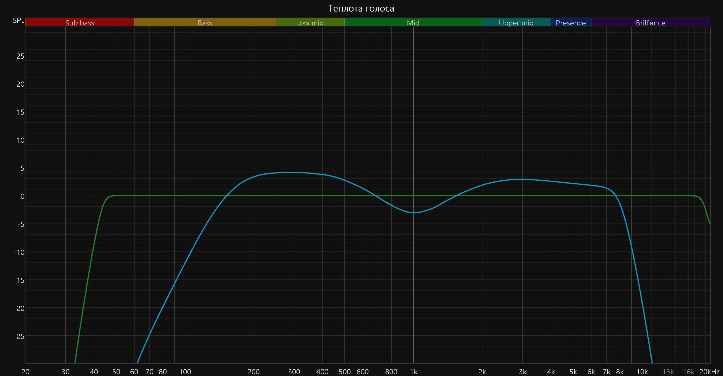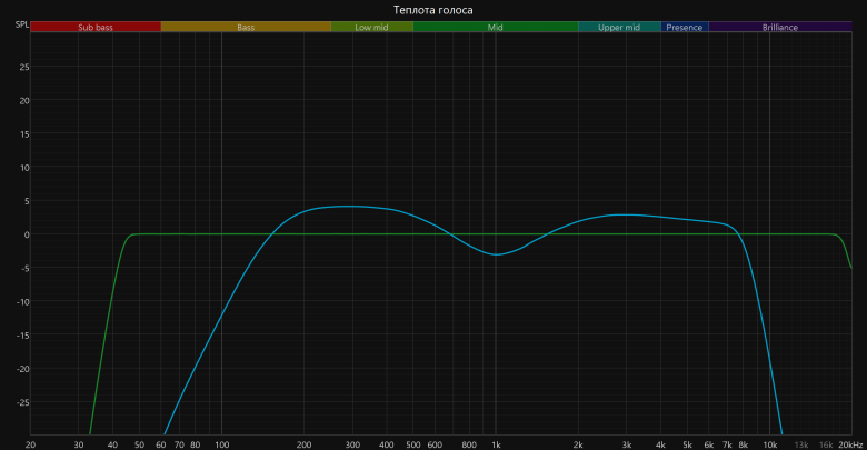 Последние два пресета изначально рассчитаны на «изменение высоты тона» и вряд ли могут рассматриваться как регулярно используемые. А вот остальные делают примерно одно и то же. Первым делом они «отрезают» частоты ниже где-то 200 Гц — это стандартное решение в случае микрофонов для голосовой связи, позволяющее радикально избавиться от низкочастотных шумов и «гулкости», практически не потеряв в разборчивости речи. СЧ-диапазон в районе 1 кГц уводится назад, чтобы избавиться от возможного «телефонного эффекта».