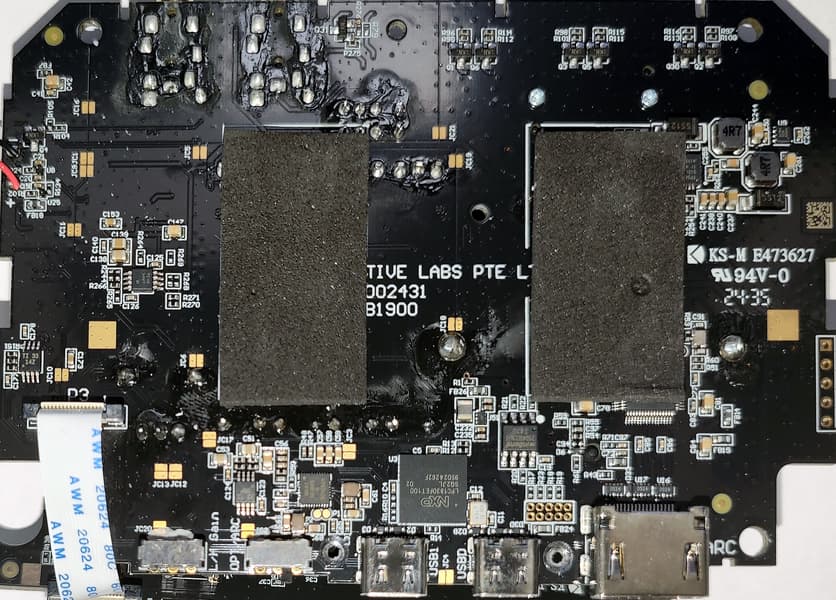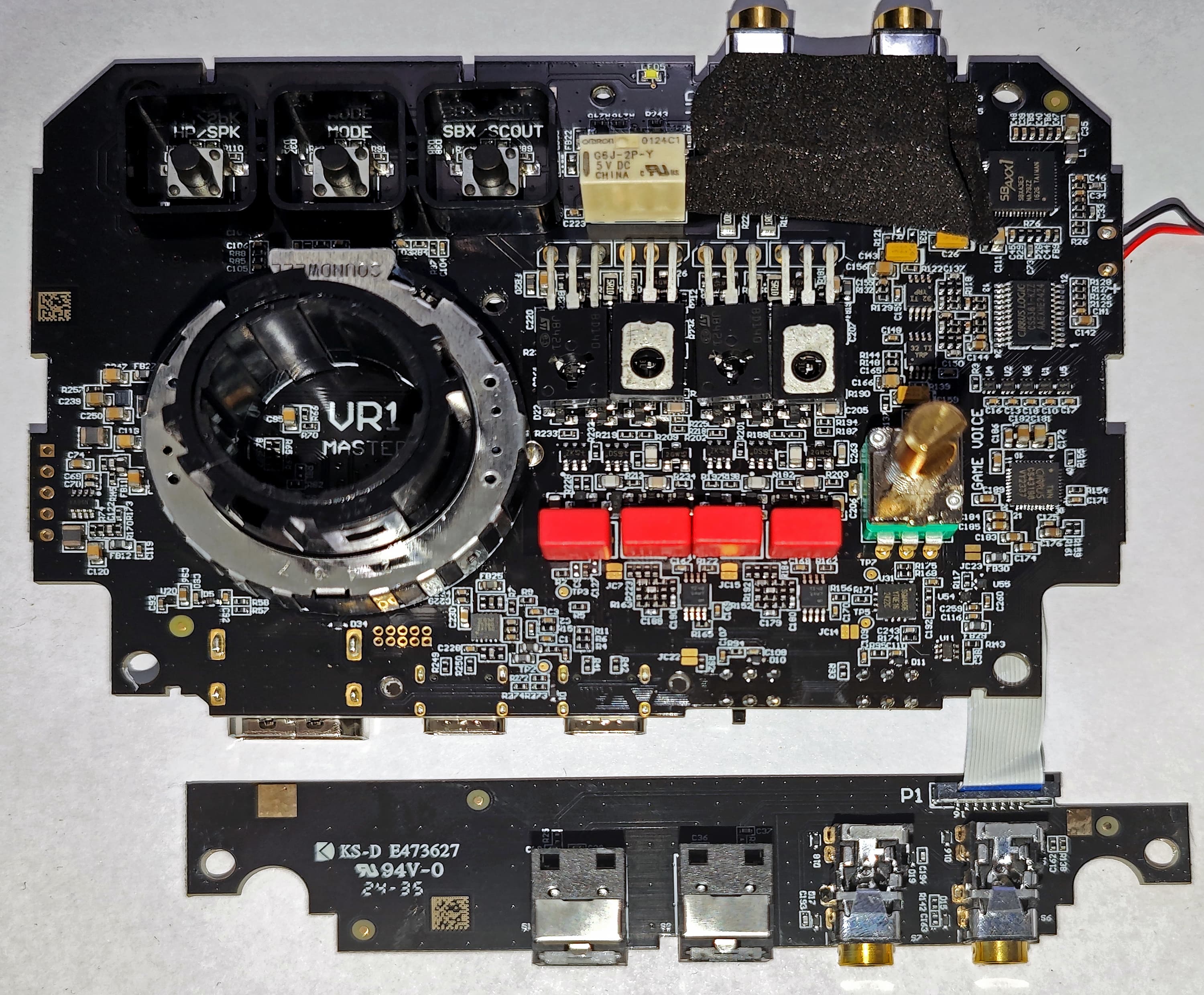 Разработчики Creative Sound Blaster G8 явно не рассчитывали на то, что кому-то придет в голову разбирать их устройство: корпус собран с изрядным количеством клея и защелок. Тем не менее, добраться до его внутренностей удалось. Внутри нас ждали основная плата и подключенная через шлейф плата поменьше, на которую вынесены разъемы. Различия «начинки» с Creative Sound BlasterX G6 минимальны. В данном случае это, скорее, хорошая новость — предшественница получилась крайне удачной. Главное нововведение — дополнительные порты для подключения источников и средства управления ими. В центре платы находится дискретный усилитель для наушников на транзисторах.