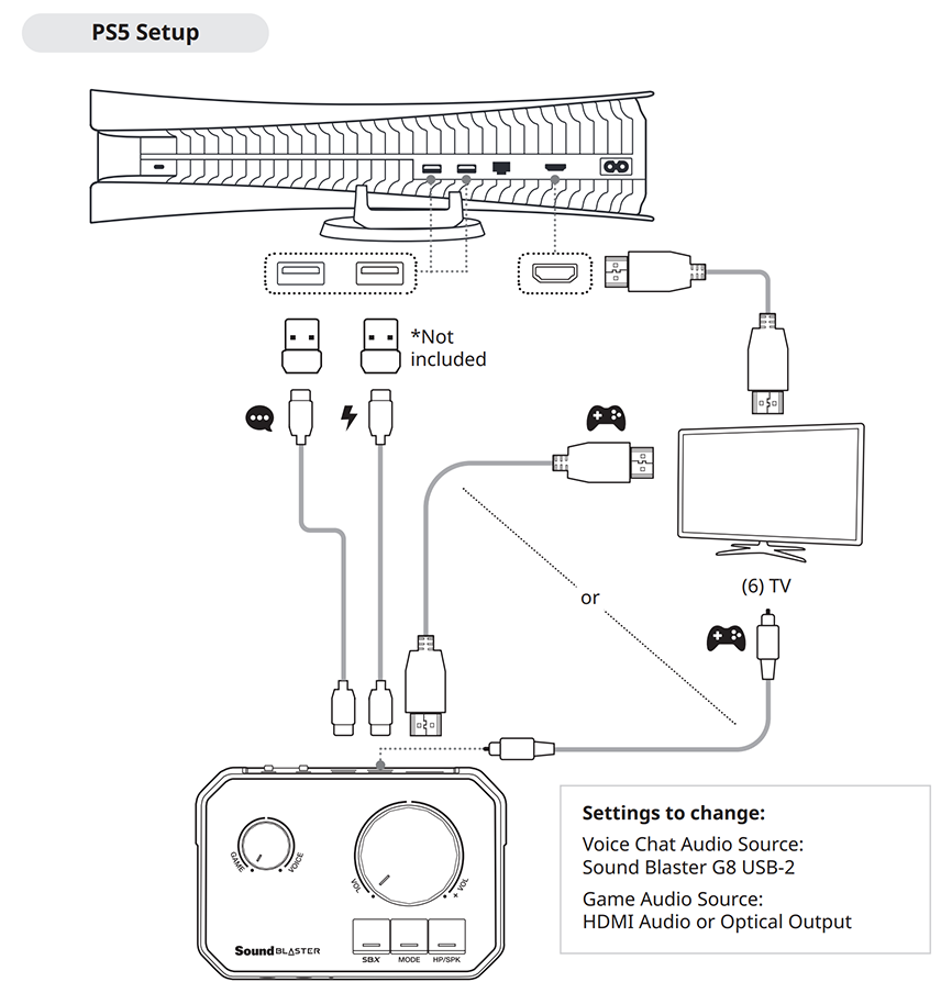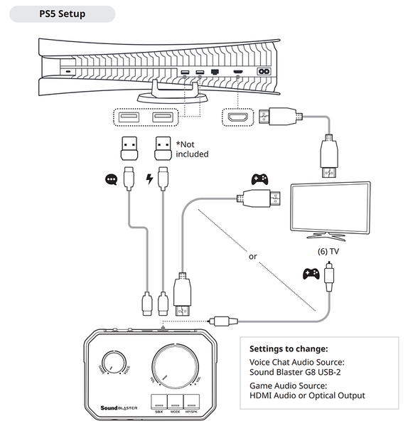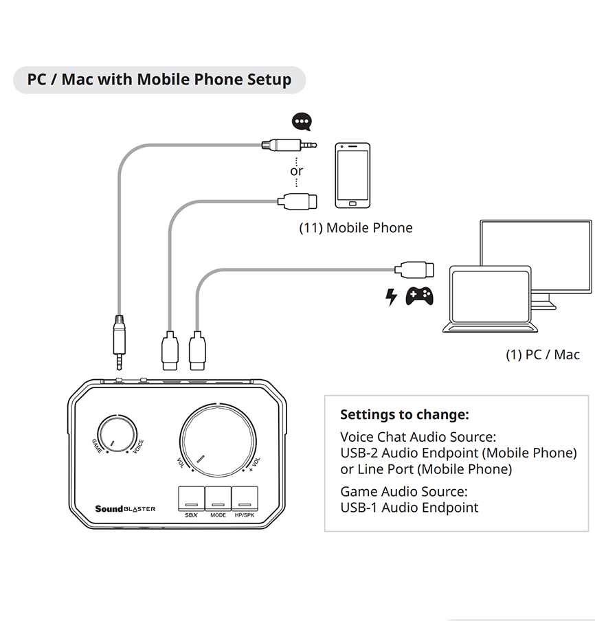 При этом нужно учесть, что второй порт «урезанный» — максимальное поддерживаемое разрешение там 24 бит/96 кГц и нет Direct-режима. Еще одна важная деталь: через первый USB осуществляется питание устройства, соответственно, если сценарий эксплуатации не подразумевает его использование (а есть и такие варианты), к нему будет необходимо подключить блок питания. Вновь обратимся к иллюстрациям из инструкции, где показаны различные комплекты оборудования и способы взаимодействия Sound Blaster G8 с ними.
