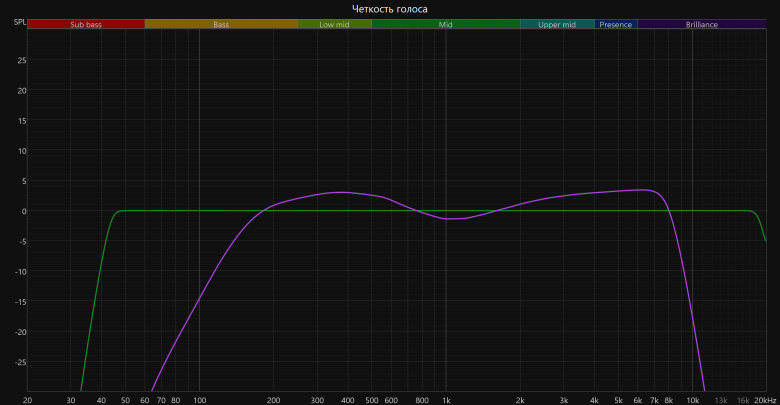 При этом образуются два «горба» — в районе 300-400 Гц и 6-7 кГц. Первый потенциально позволяет повысить субъективно воспринимаемое качество речи, второй — важен для разборчивости. Соотношение этих двух акцентов и определяет характер звучания каждого из пресетов. Частоты выше 8 кГц также вырезаются — полезной именно для передачи речи информации там практически нет, а вот всяческих неприятных призвуков — предостаточно. Выбор пресета в данном случае — скорее вопрос вкуса и стоящей перед пользователем задачи, все они вполне пригодны для использования.